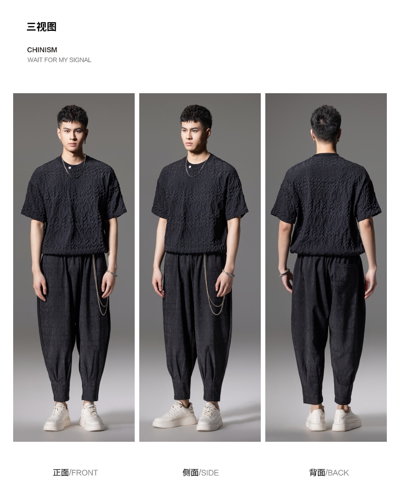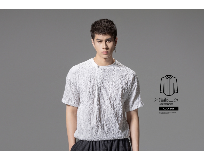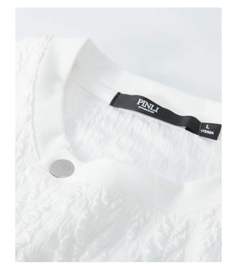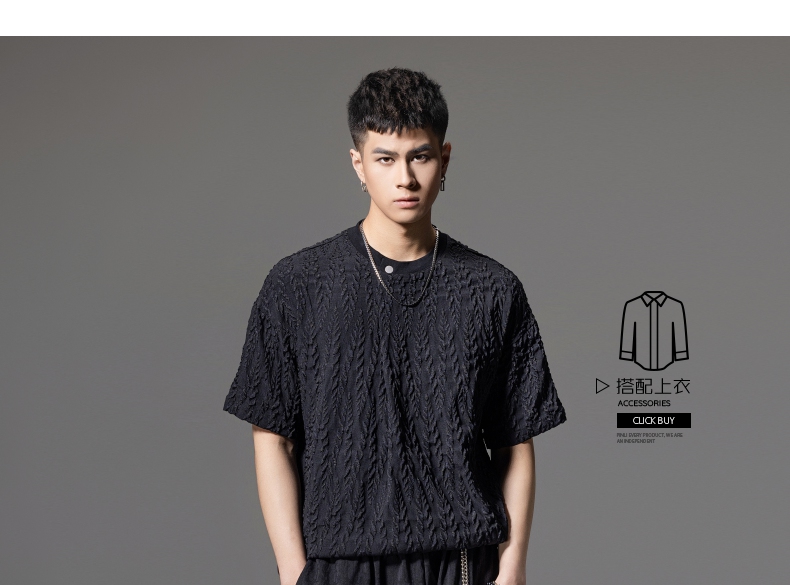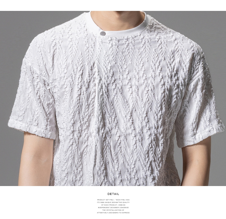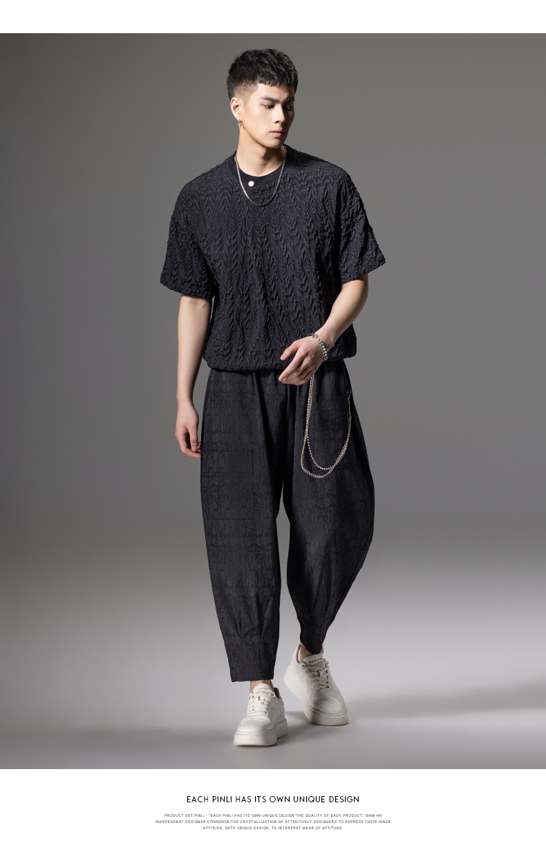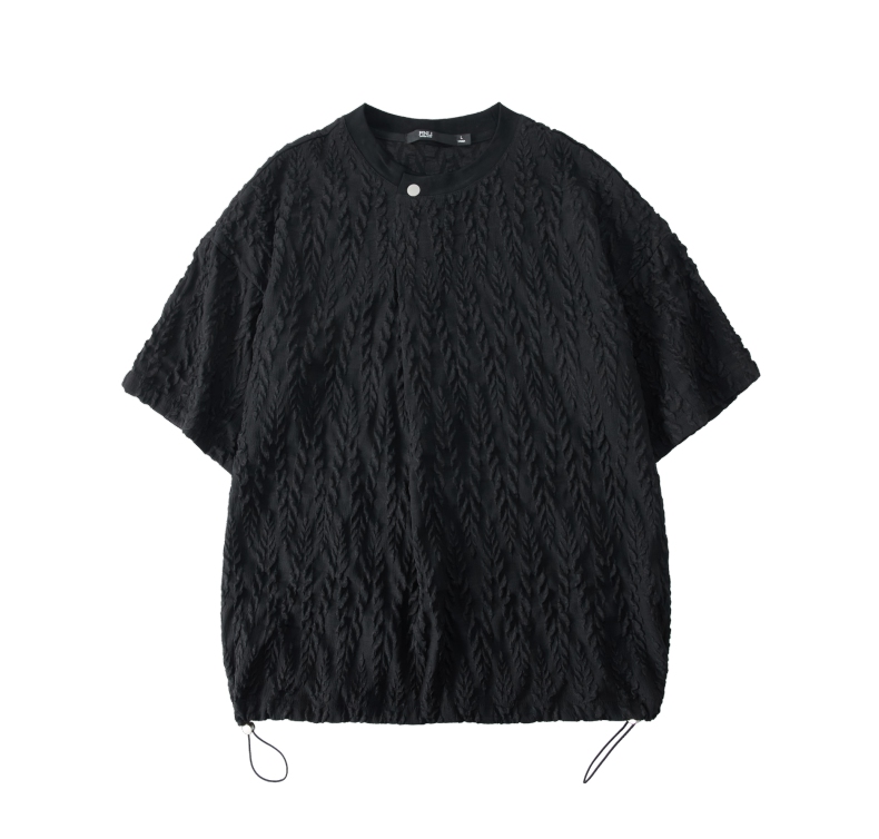 PINLI品立夏季新款提花树叶短袖T恤男士圆领捏褶宽松潮牌上衣B242111036