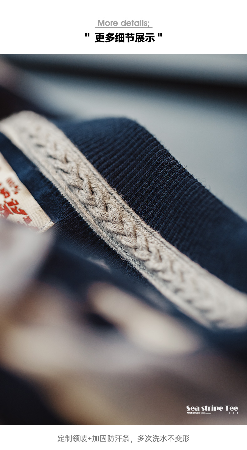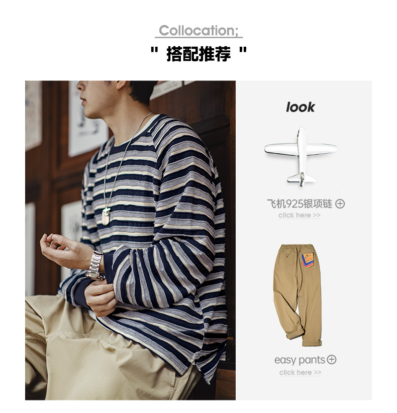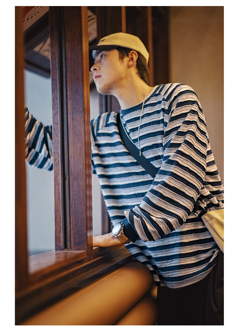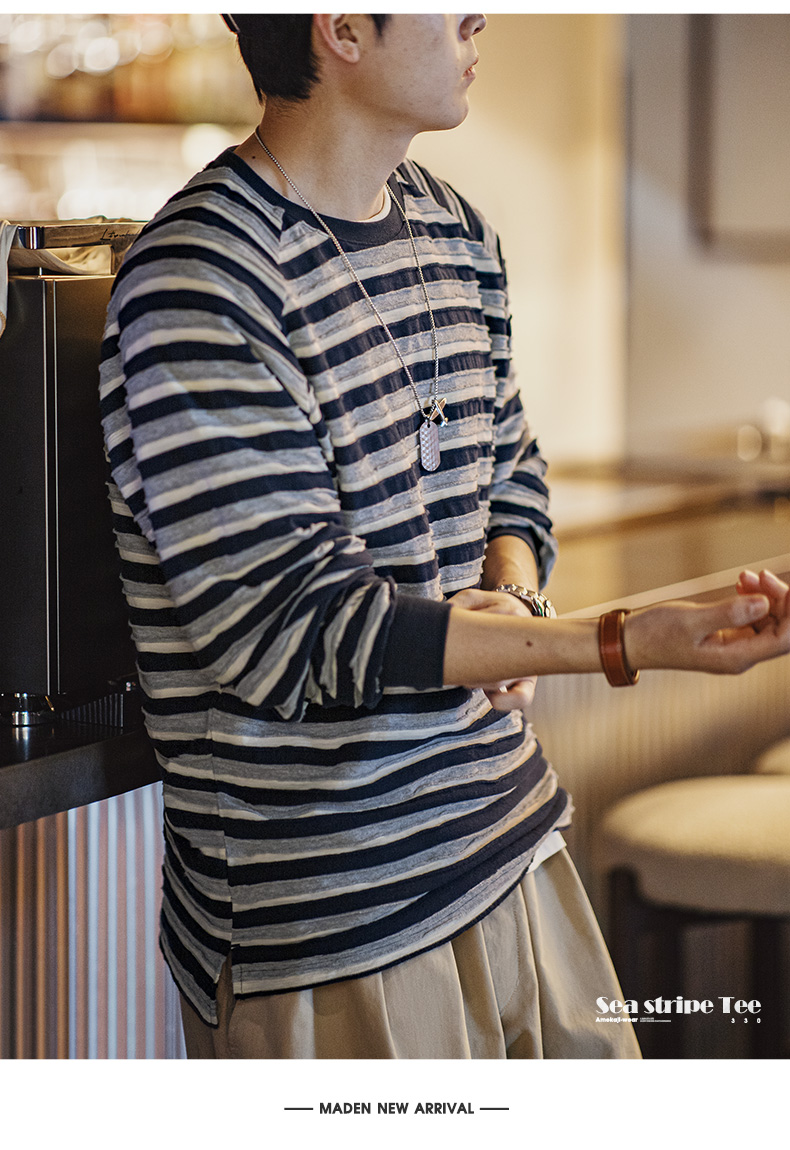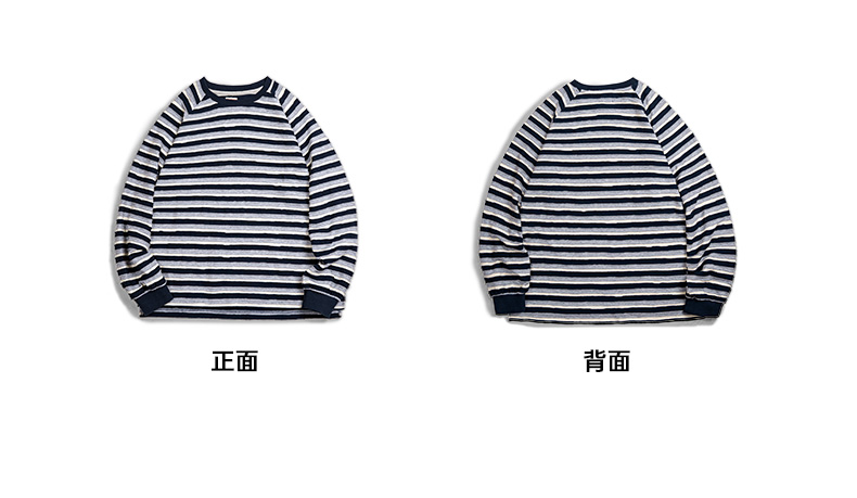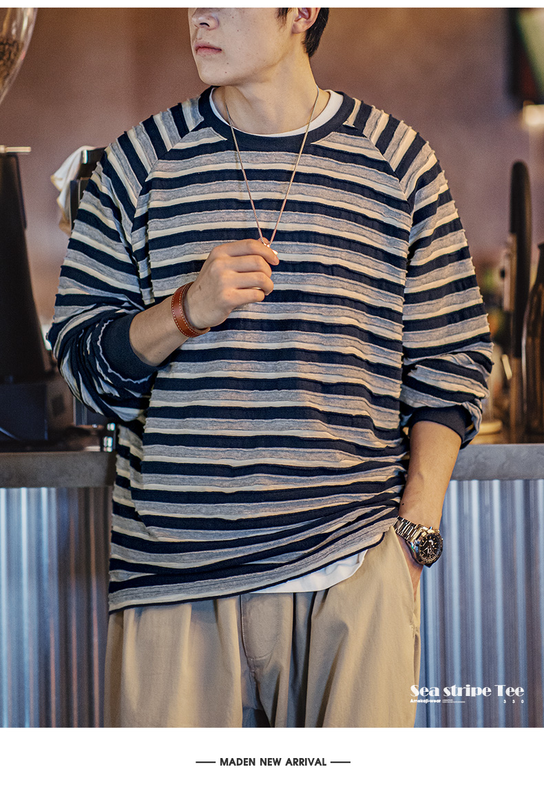 马登工装 美式休闲海浪立体条纹T恤撞色圆领插肩袖针织打底衫男秋