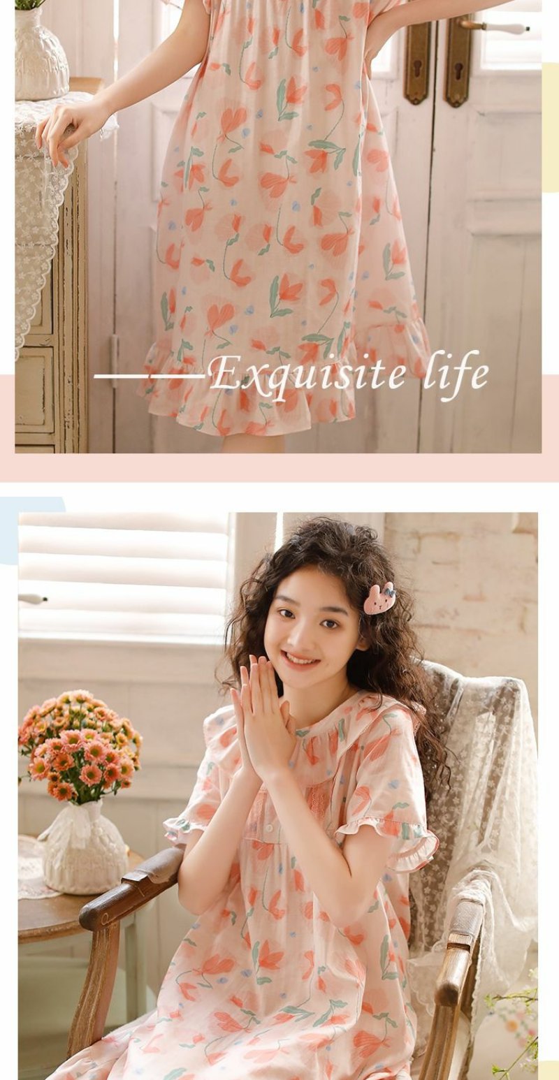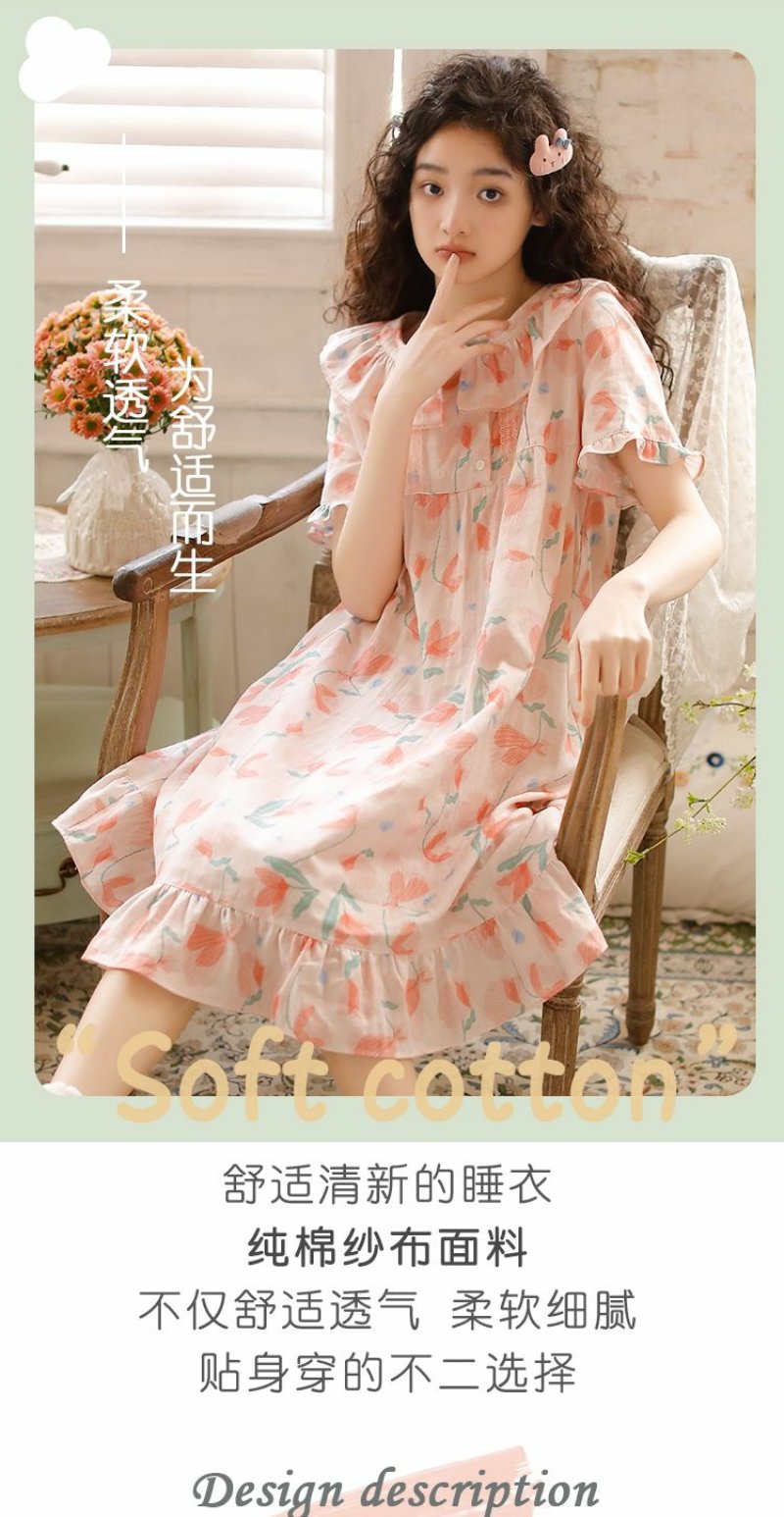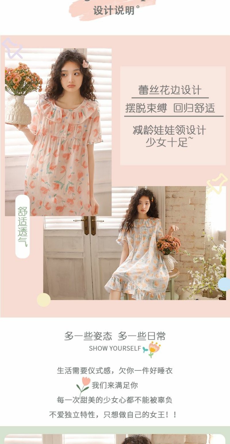 古拉苏夏季女棉双层睡裙日系甜美花卉圆领套头中长款休闲家居裙