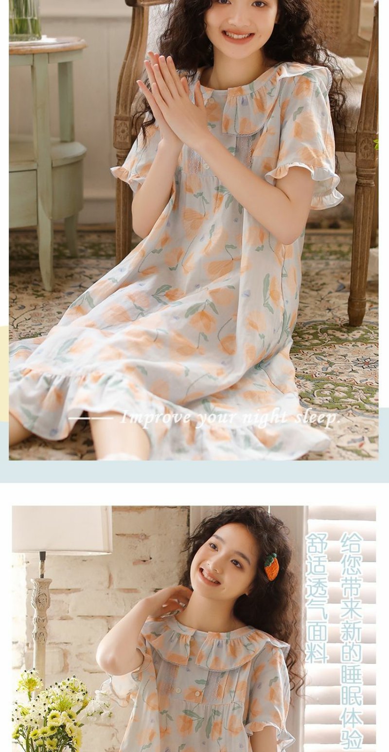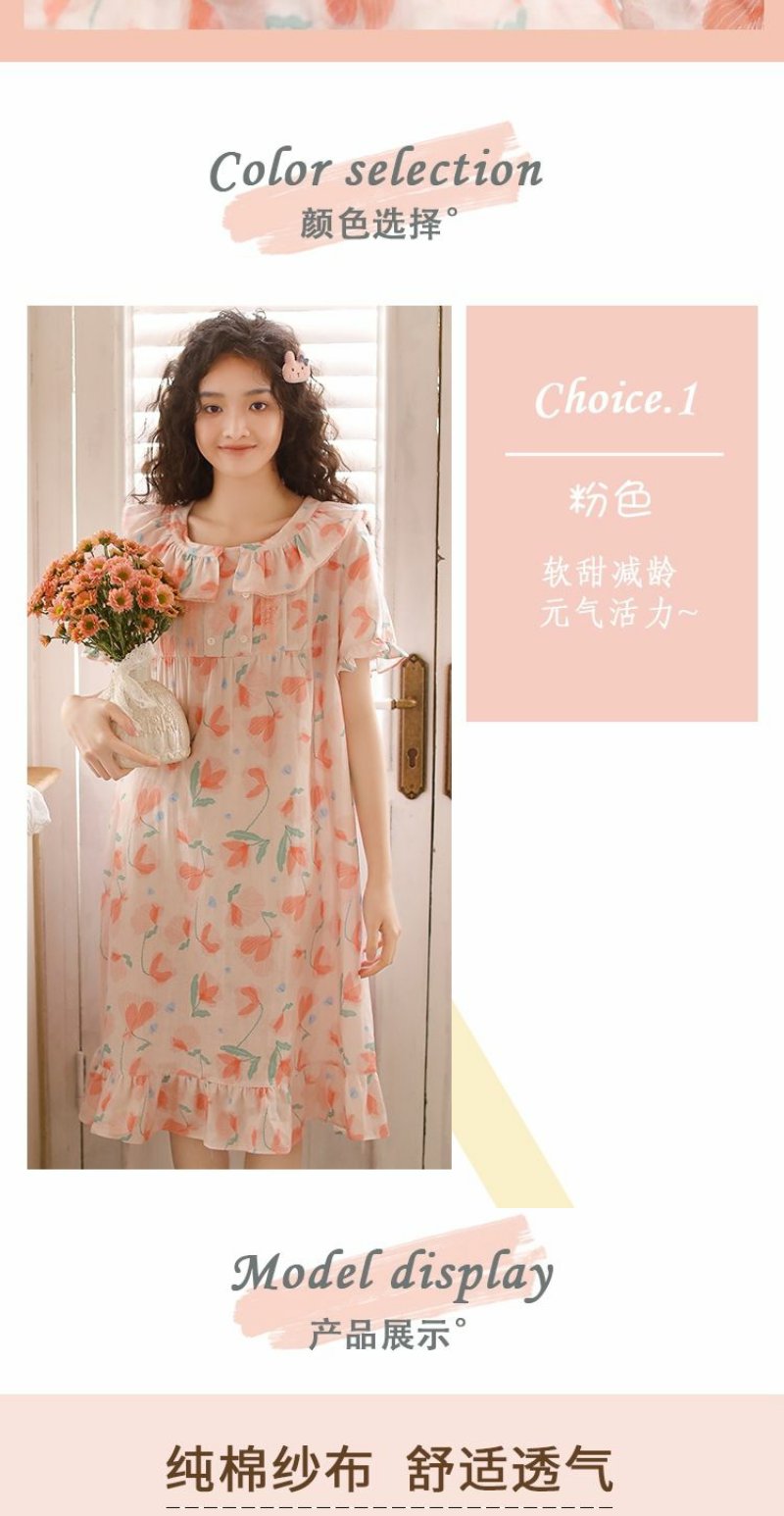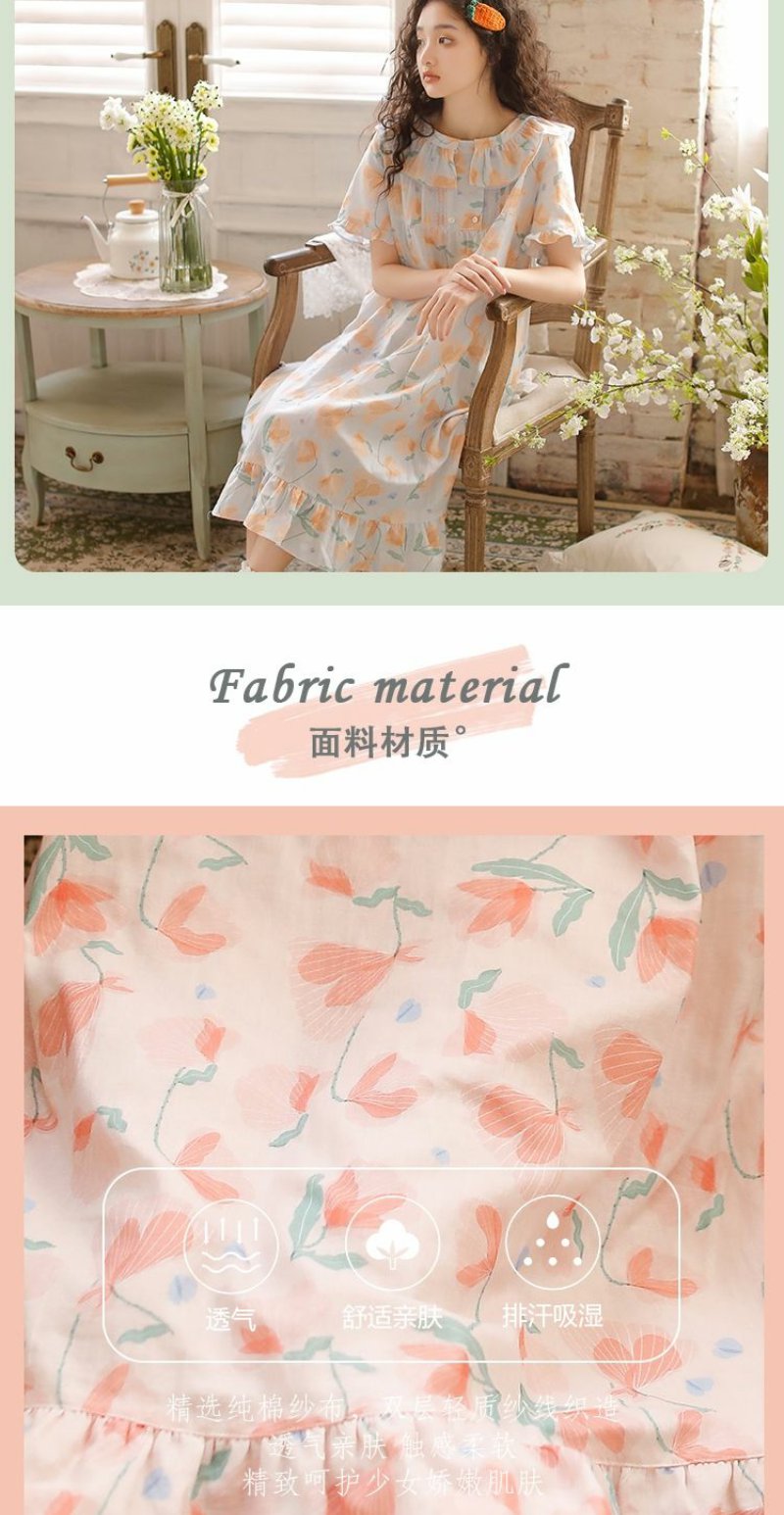 古拉苏夏季女棉双层睡裙日系甜美花卉圆领套头中长款休闲家居裙