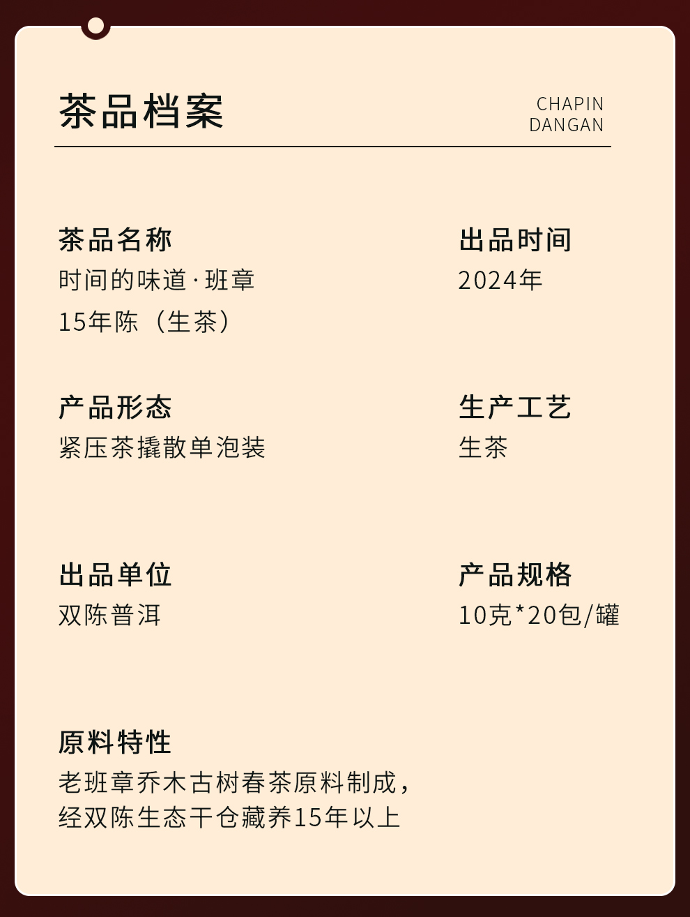 时间的味道班章15年生茶老班章乔木古树春茶普洱茶叶10克*20包/罐