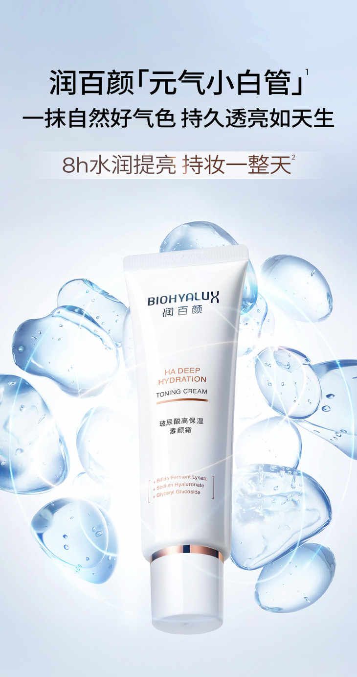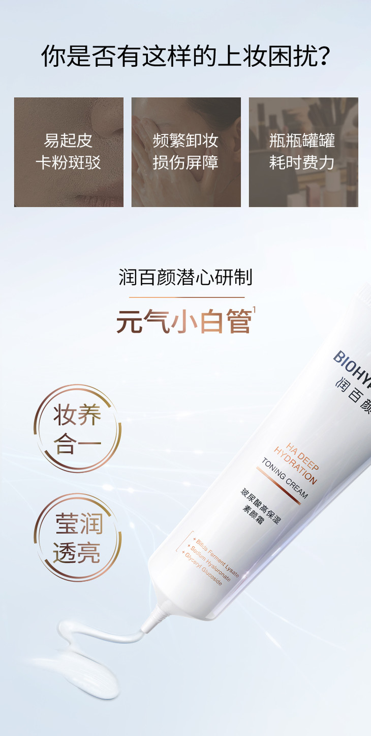 [屁侠推荐]润百颜玻尿酸素颜霜 一抹柔光 面霜+妆前+底妆3合1 持久透亮 50g/支 限时下单赠美白次抛