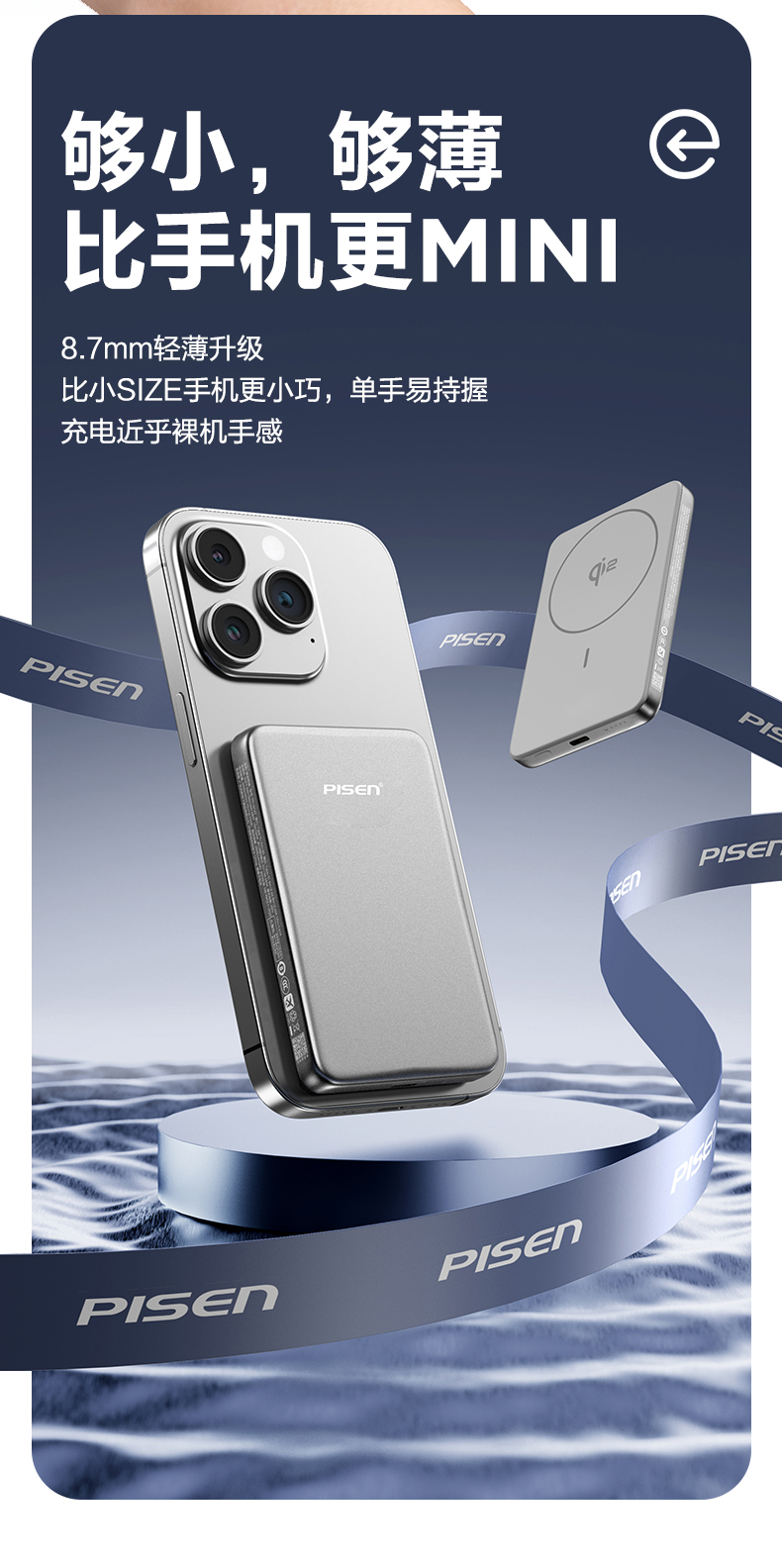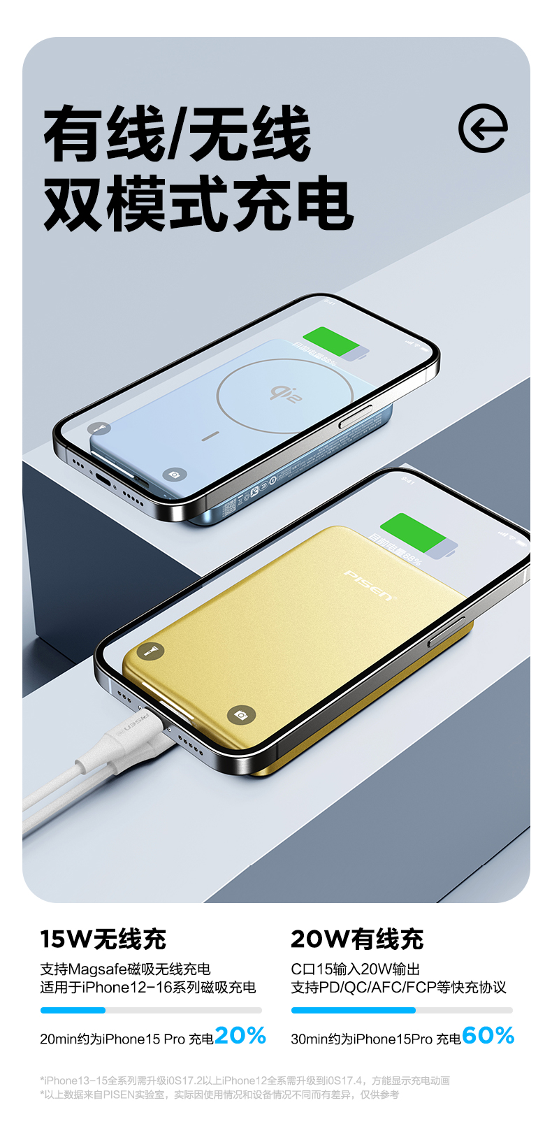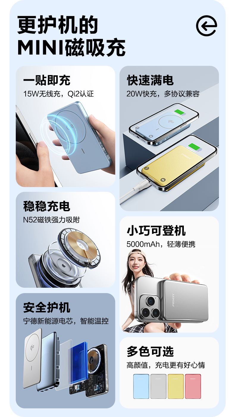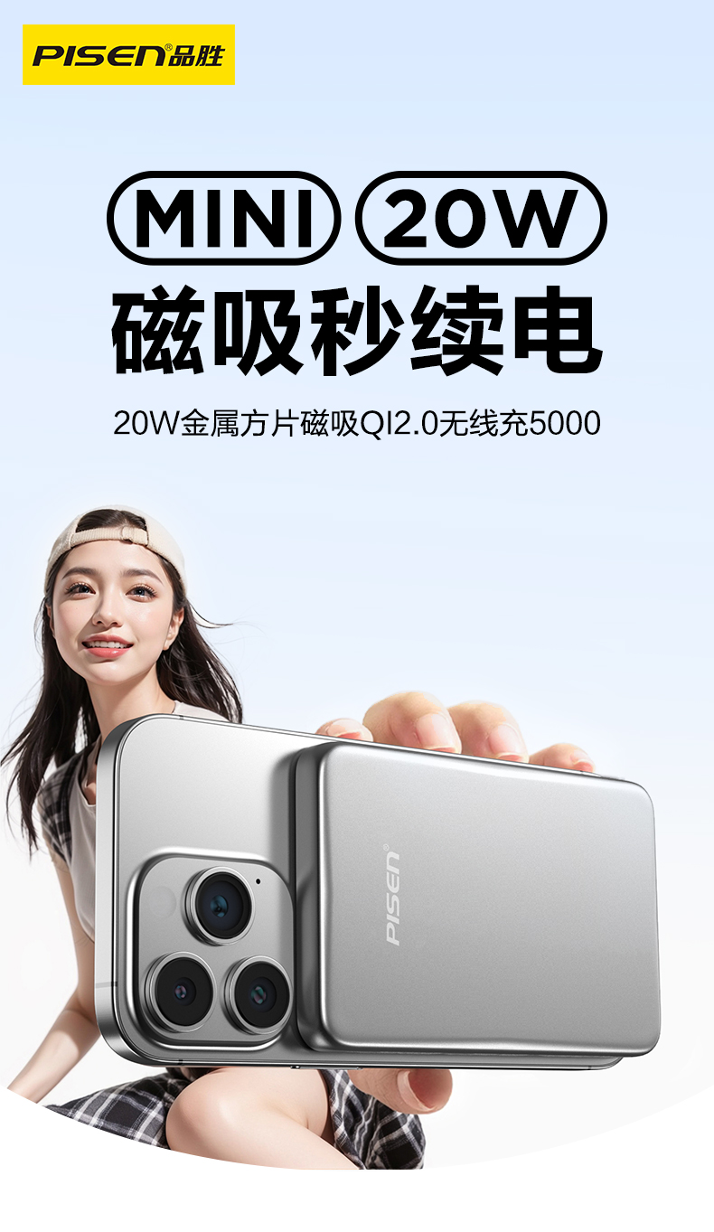 品胜宁德电芯20W金属方片磁吸QI2.0无线充5000毫安 支持20W磁吸MagSafe超薄小巧