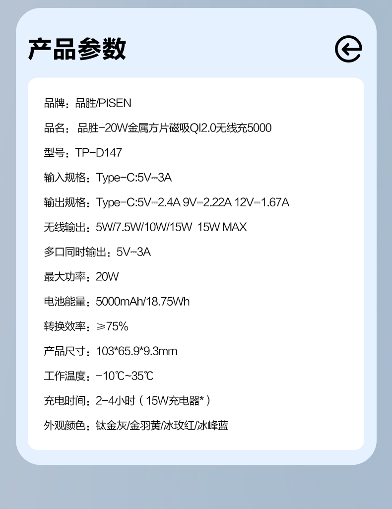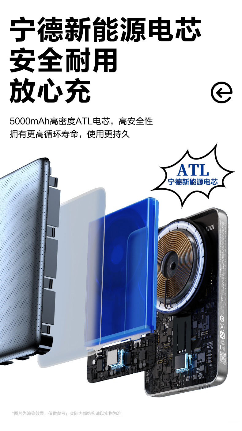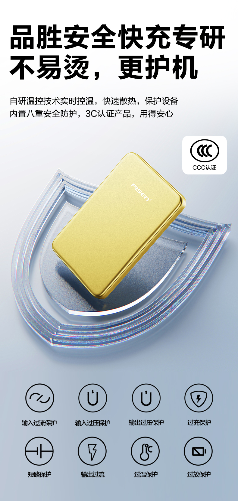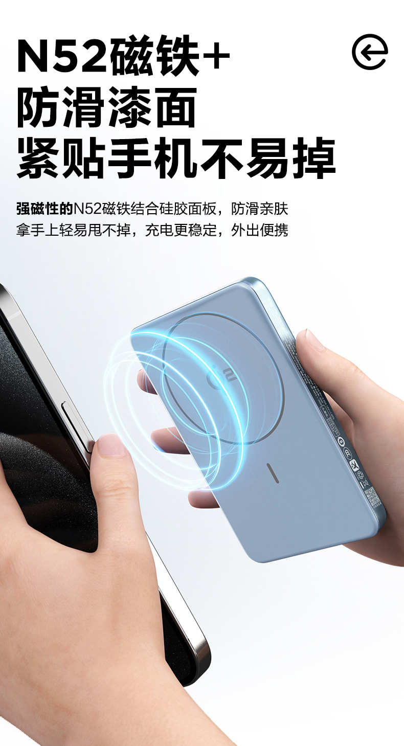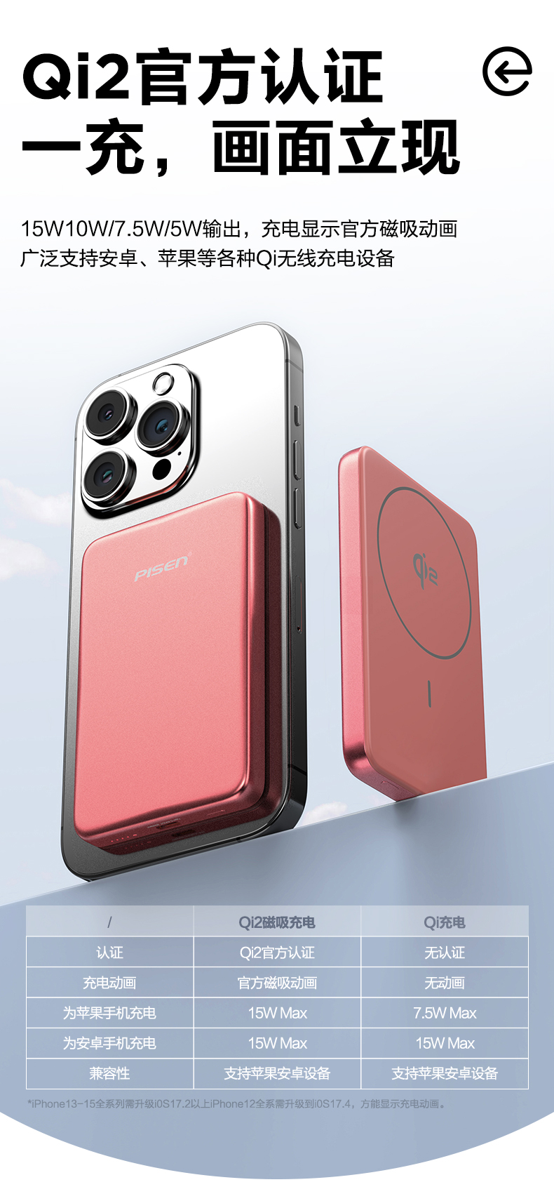 品胜宁德电芯20W金属方片磁吸QI2.0无线充5000毫安 支持20W磁吸MagSafe超薄小巧