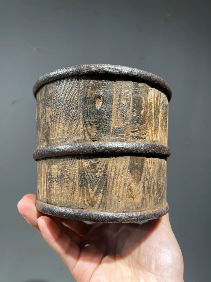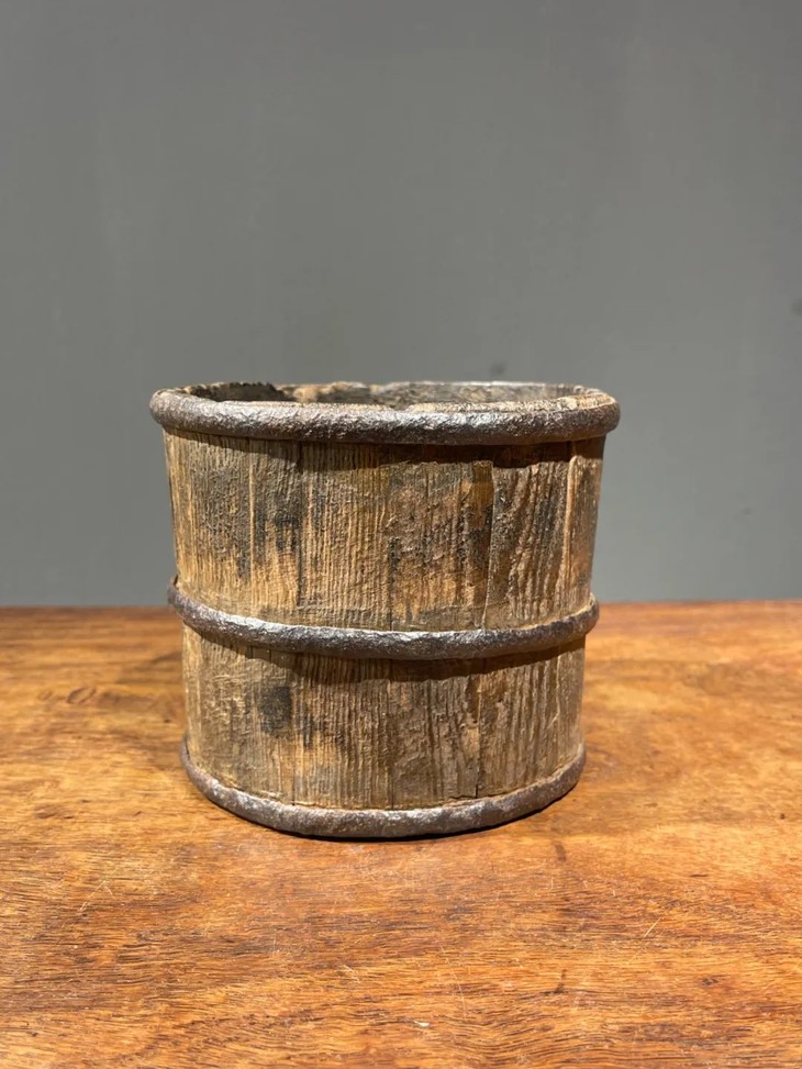 此老铁环箍老木桶体现传统民间工艺品的设计与制作精髓,长年使用痕迹清晰可见,是典型旧物美学的范例,如今可以旧物新用,用为花筒、收纳筒,或是高雅花器。此核桃木铁环箍老木桶,如图所示,木质表面具有长年使用磨损痕迹,除此以外,基本保存完好。