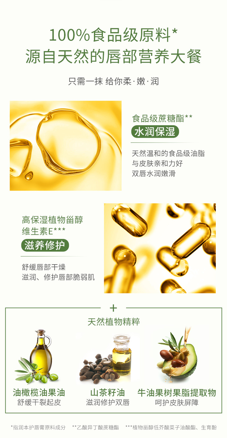 油脂呢,主要是山茶籽油、低芥酸菜子油、油橄榄果油等,都是从天然植物中提取,多种油脂搭配加强滋润效果。