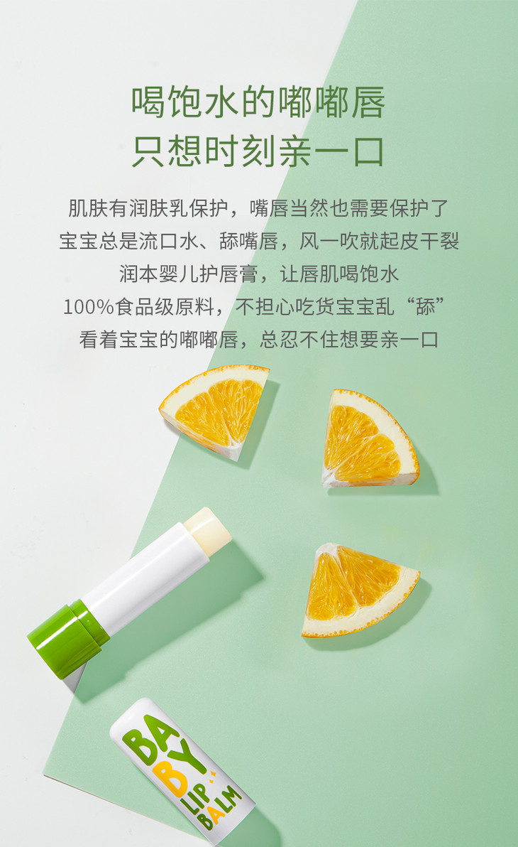 刚上嘴时有淡淡的甜橙味,是因为其中的甜橙果皮油成分,不是加了香精哦,过一会味道就淡化到几乎没有了,不用担心宝宝会「爱吃唇膏」。