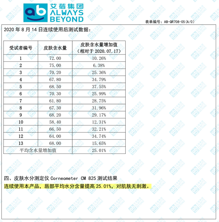 结果表明,13 位测试者的唇部平均水分含量提高 25.01%,并且对肌肤无刺激。