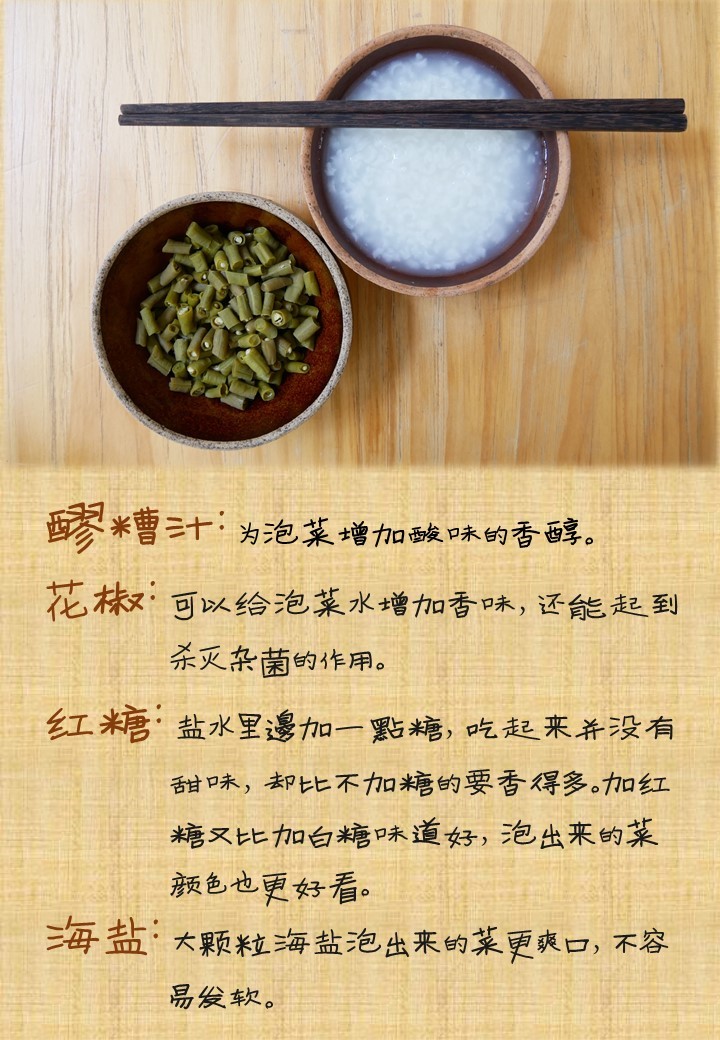 原料:豇豆角、泡菜母水(醪糟汁、红糖、花椒、紫苏、生姜、辣椒、竹盐)
