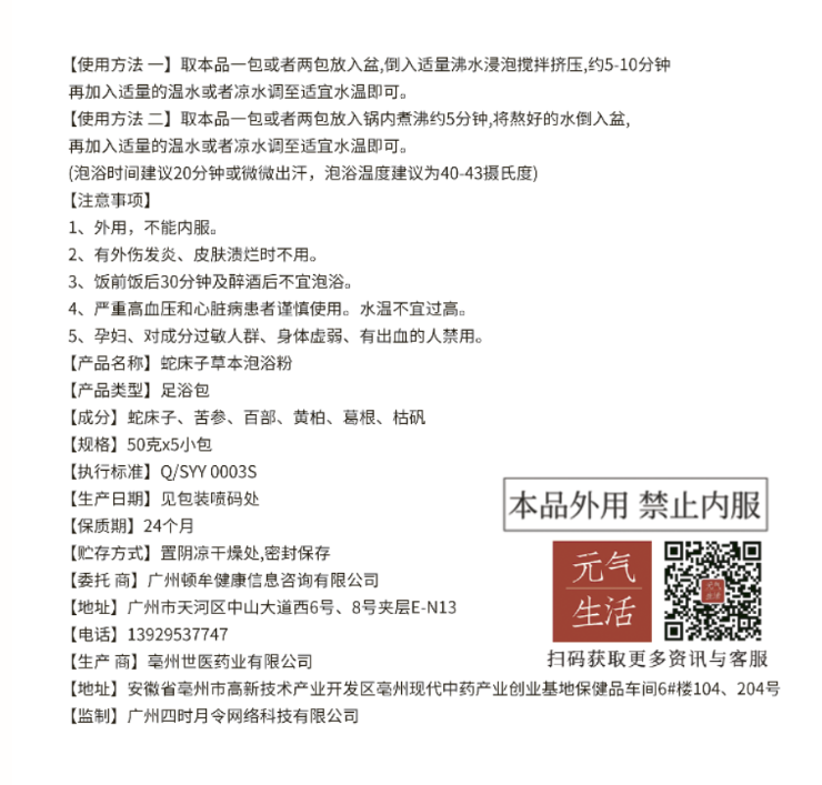 使用方法二:取本品一包或者两包放入锅内煮沸约5分钟,将熬好的水倒入盆再加入适量的温水或者凉水调至适宜水温即可。(泡浴时间建议20分钟或微微出汗,泡浴温度建议为40-43摄氏度)