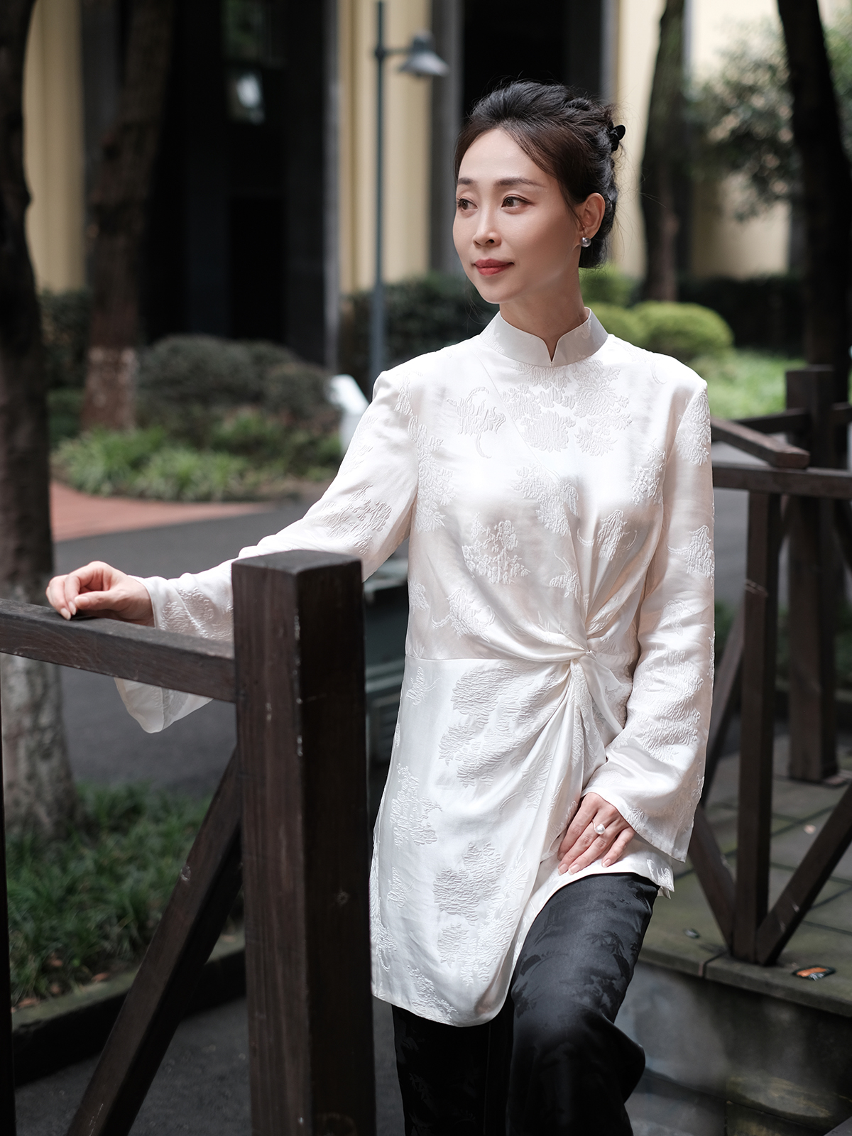 微瑕秒杀| 盛唐牡丹|真丝冠乐绉褶皱款上衣-白色 [特价品](特殊商品不退不换)