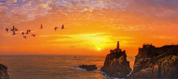 天鹅、白雪,冬季的大海别有一番美丽,整个观天鹅海岸线约3公里。您也可以自行到花斑彩石参观,花斑彩石是五亿多年前寒武纪燕山期火山喷发的火山岩。黄昏时我们在村里拍摄海草房及日落,这是所有摄影爱好者最喜欢的时段。