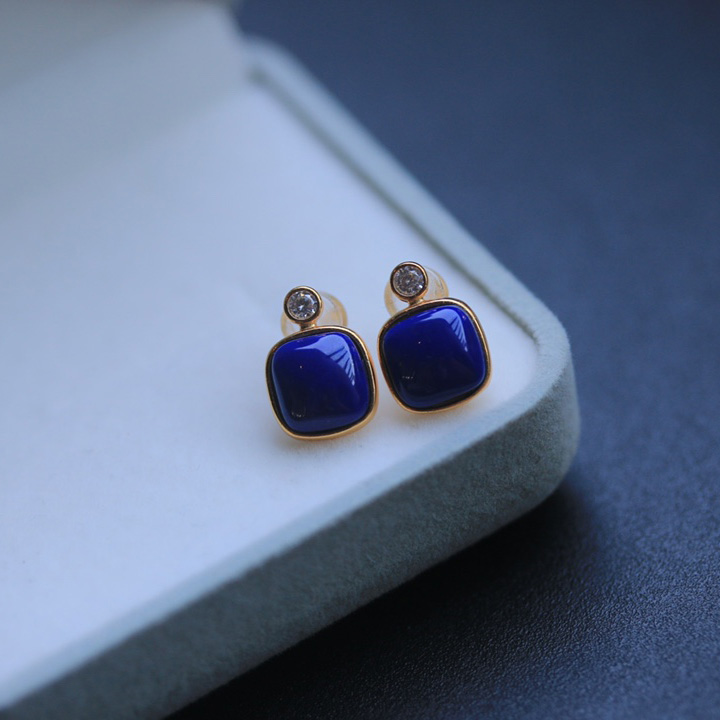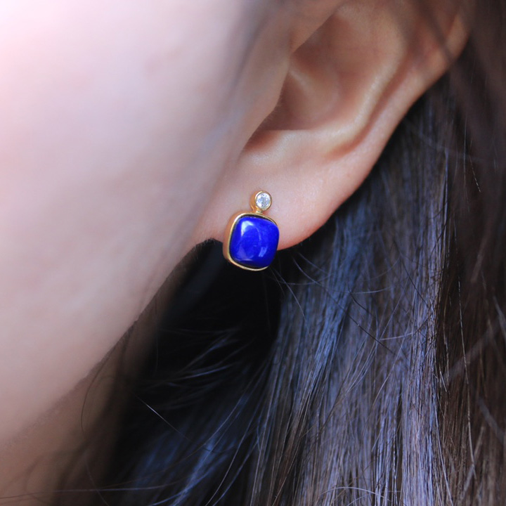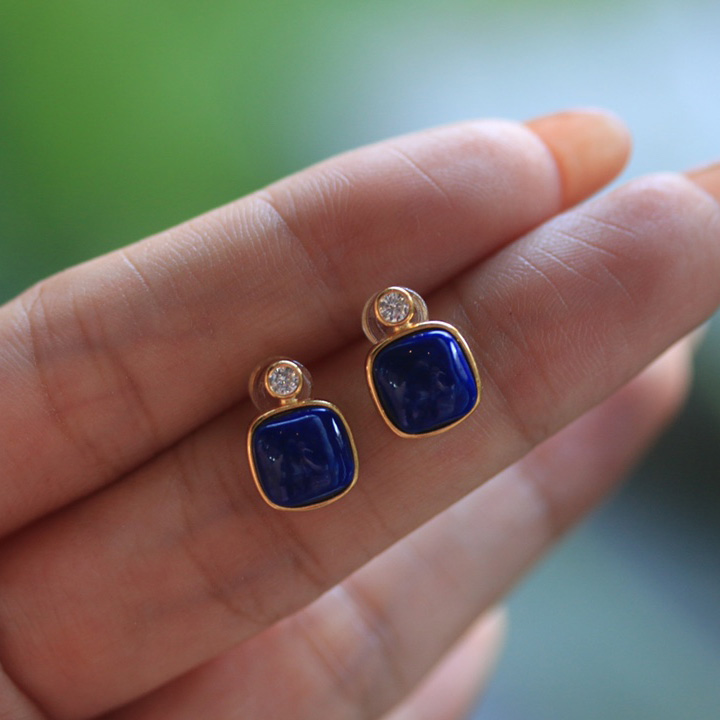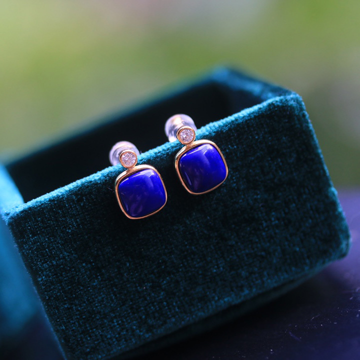 天然青金小方块耳钉、纯银镀金镶嵌、整体尺寸:9x12mm