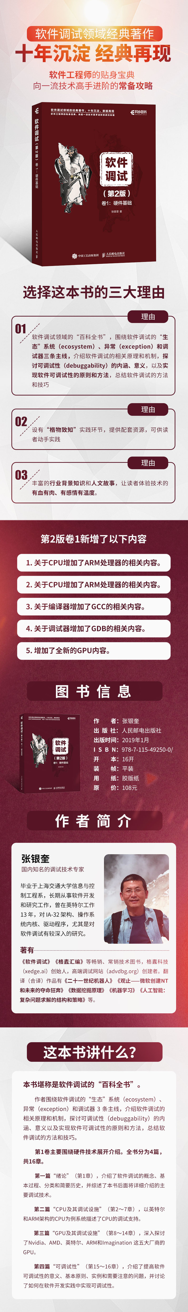 本书堪称是软件调试的“百科全书”。作者围绕软件调试的“生态”系统(ecosystem)、异常(exception)和调试器 3 条主线,介绍软件调试的相关原理和机制,探讨可调试性(debuggability)的内涵、意义以及实现软件可调试性的原则和方法,总结软件调试的方法和技巧。 *1卷主要围绕硬件技术展开介绍。全书分为4篇,共16章。*一篇“绪论”(*1章),介绍了软件调试的概念、基本过程、分类和简要历史,并综述了本书后面将详细介绍的主要调试技术。*二篇“CPU及其调试设施”(*2~7章),以英特尔和ARM架构的CPU为例系统描述了CPU的调试支持。第三篇“GPU及其调试设施”(第8~14章),深入探讨了Nvidia、AMD、英特尔、ARM和Imagination 这五大厂商的GPU。第四篇“可调试性”(*15~16章),介绍了提高软件可调试性的意义、基本原则、实例和需要注意的问题,并讨论了如何在软件开发实践中实现可调试性。 本书理论与实践紧密结合,既涵盖了相关的技术背景知识,又针对大量具有代表性和普遍意义的技术细节进行了讨论,是学习软件调试技术的宝贵资料。本书适合所有从事软件开发工作的读者阅读,特别适合从事软件开发、测试、支持的技术人员,从事反病毒、网络安全、版权保护等工作的技术人员,以及高等院校相关专业的教师和学生学习参考。