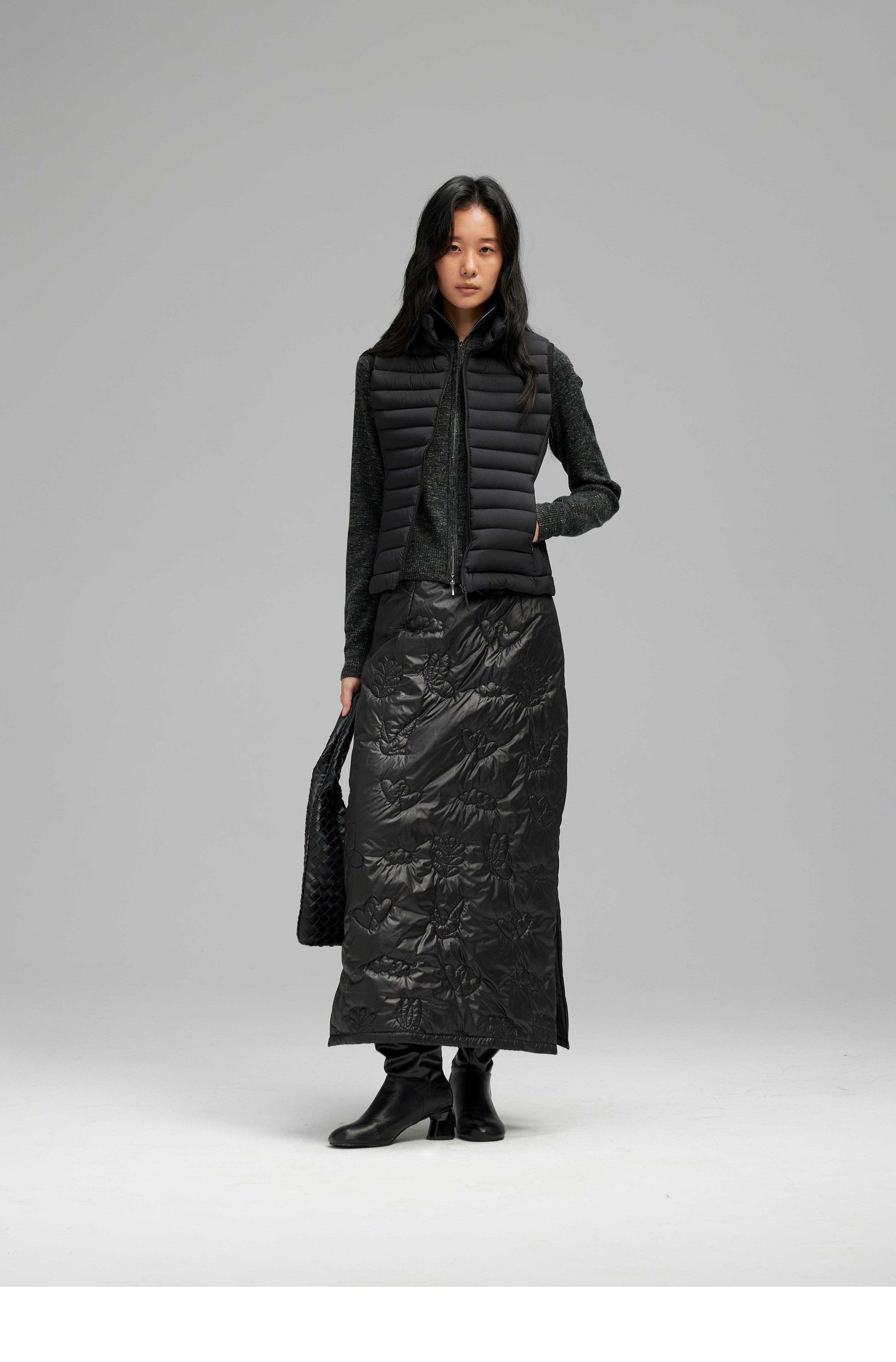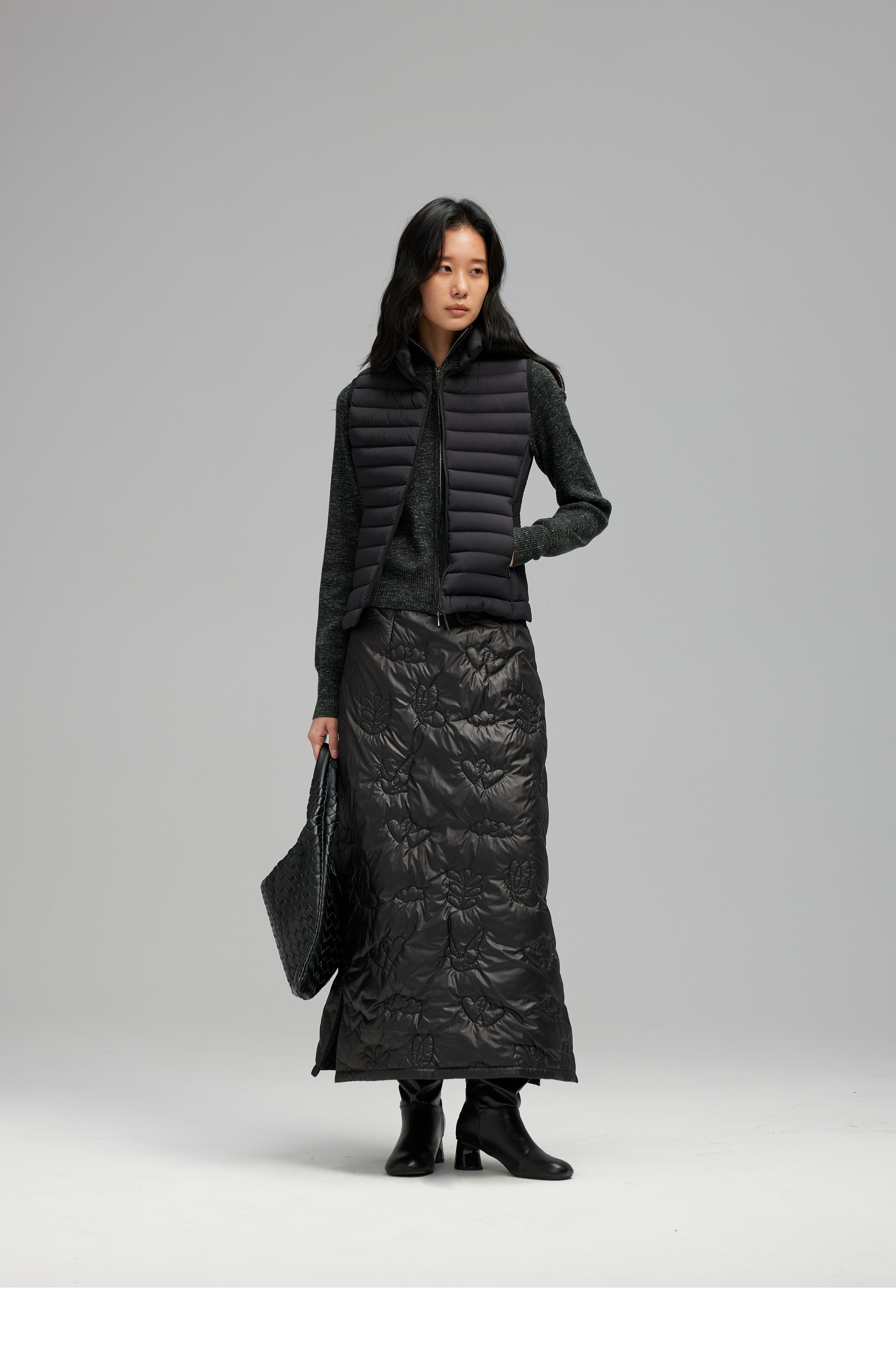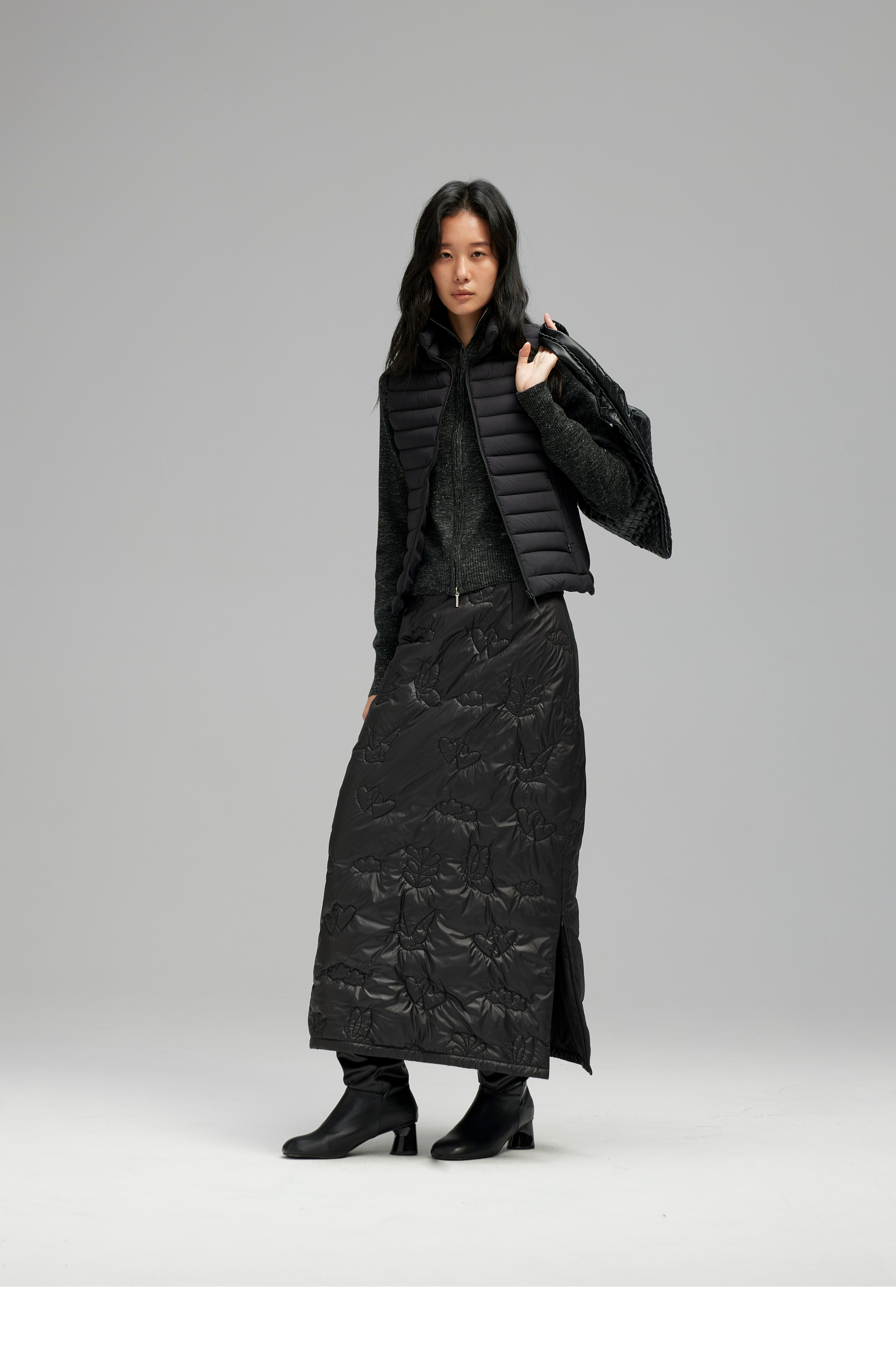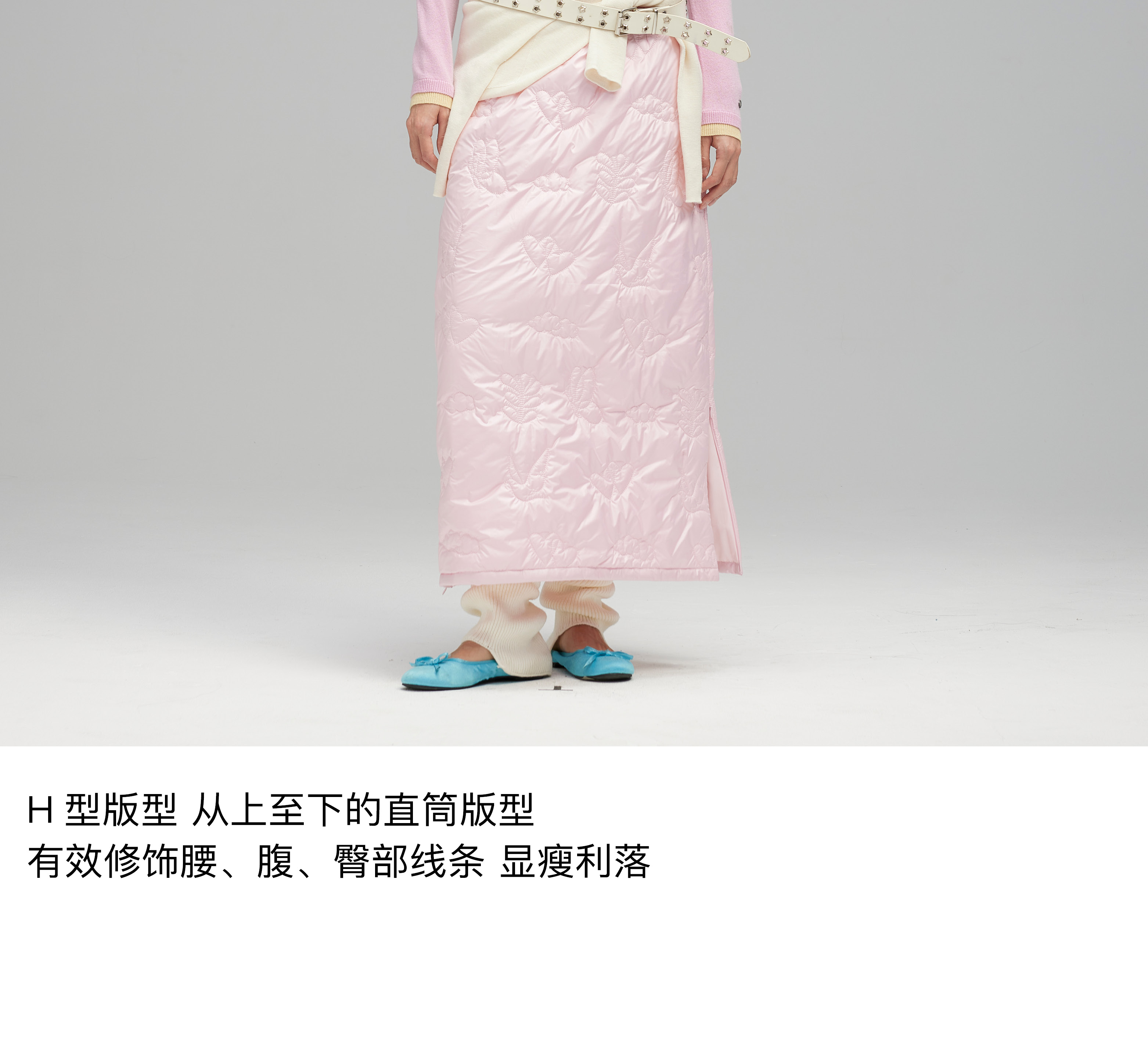 素舶 重工多图案绣花绗缝直筒中高腰下摆侧开叉夹棉保暖半身裙