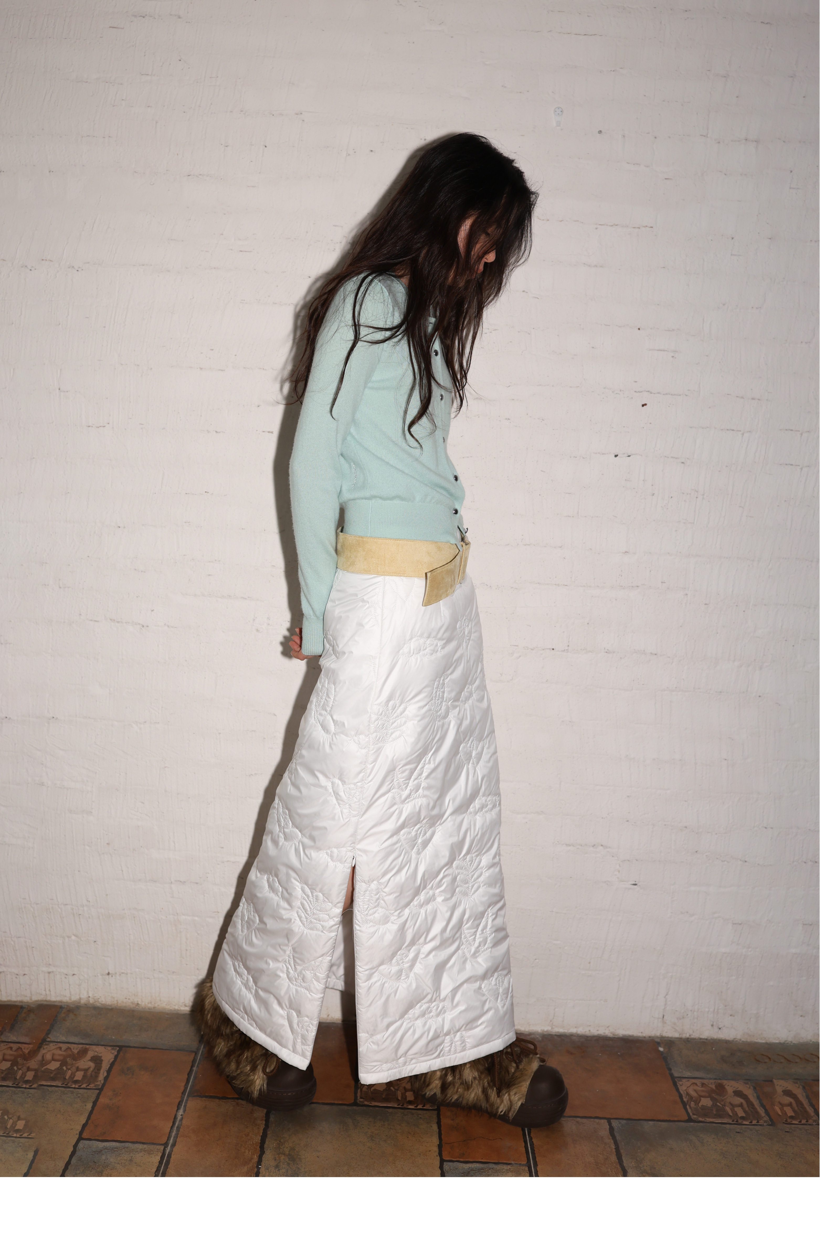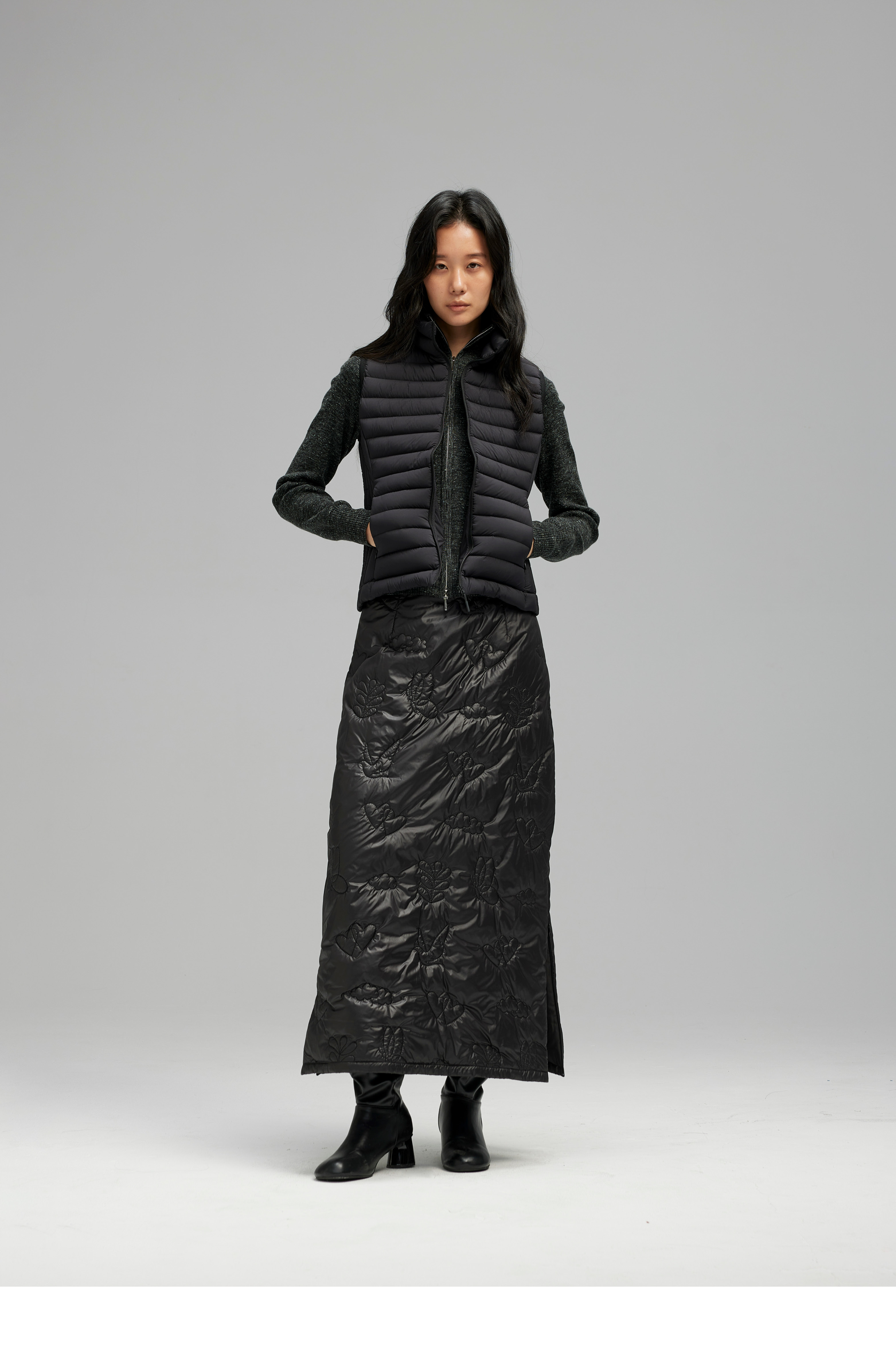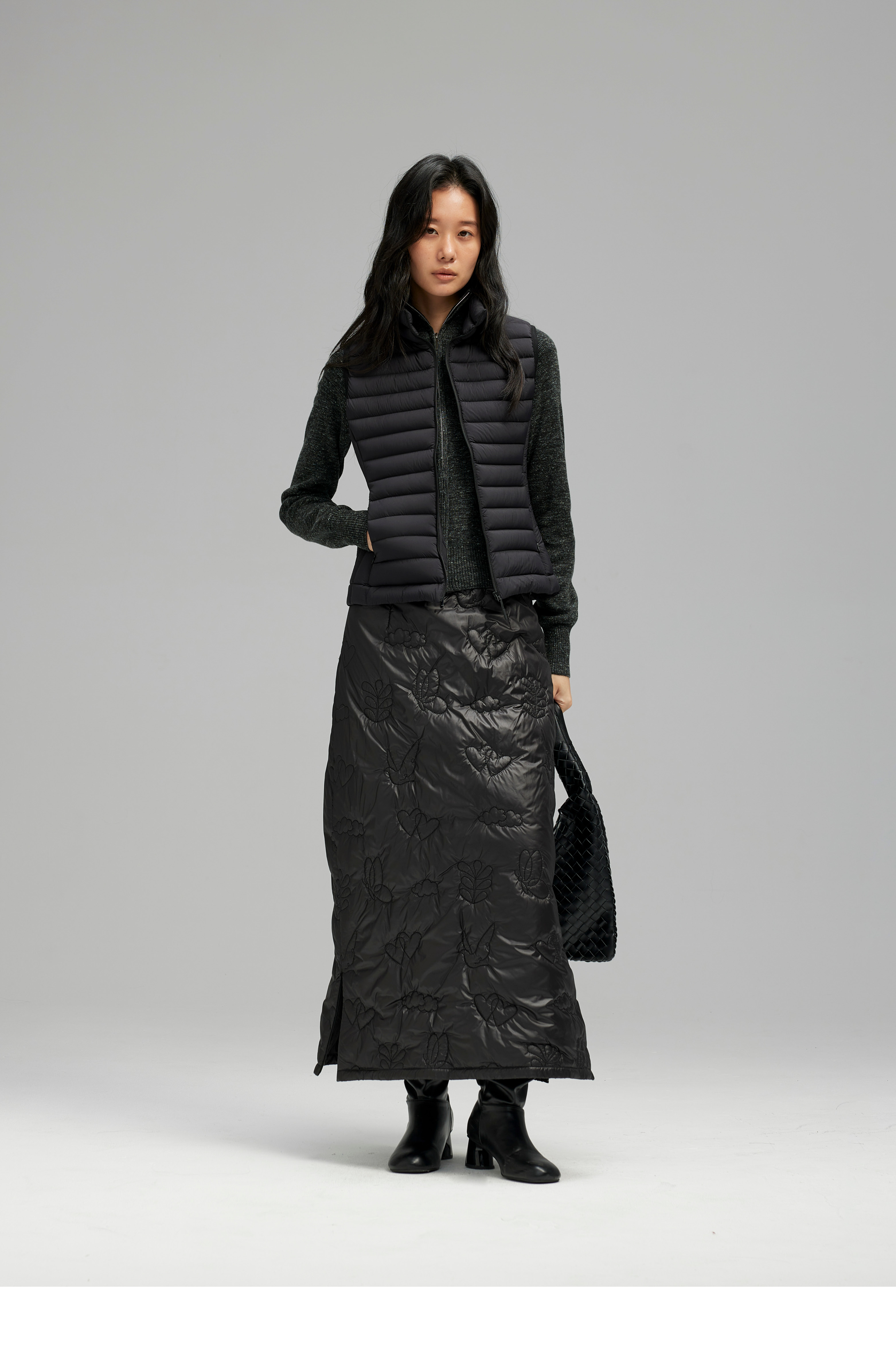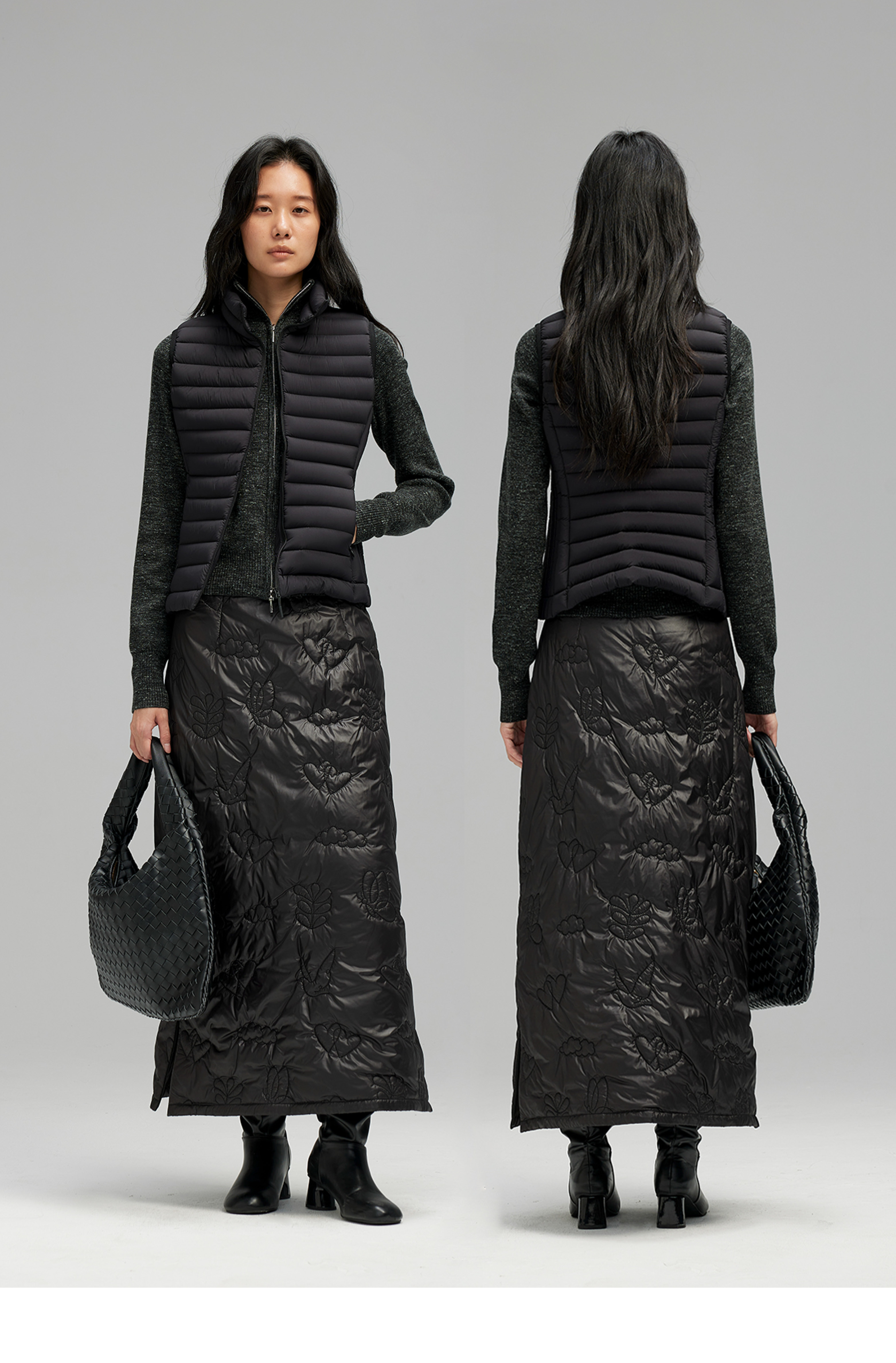 素舶 重工多图案绣花绗缝直筒中高腰下摆侧开叉夹棉保暖半身裙