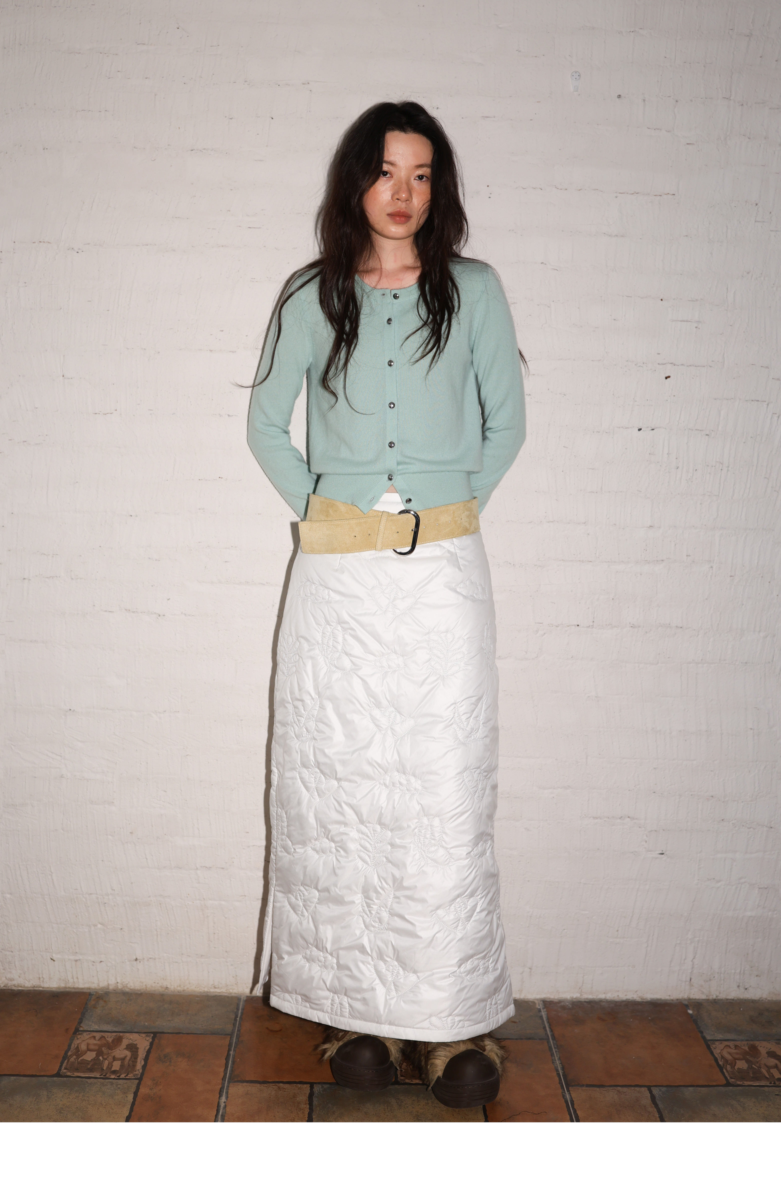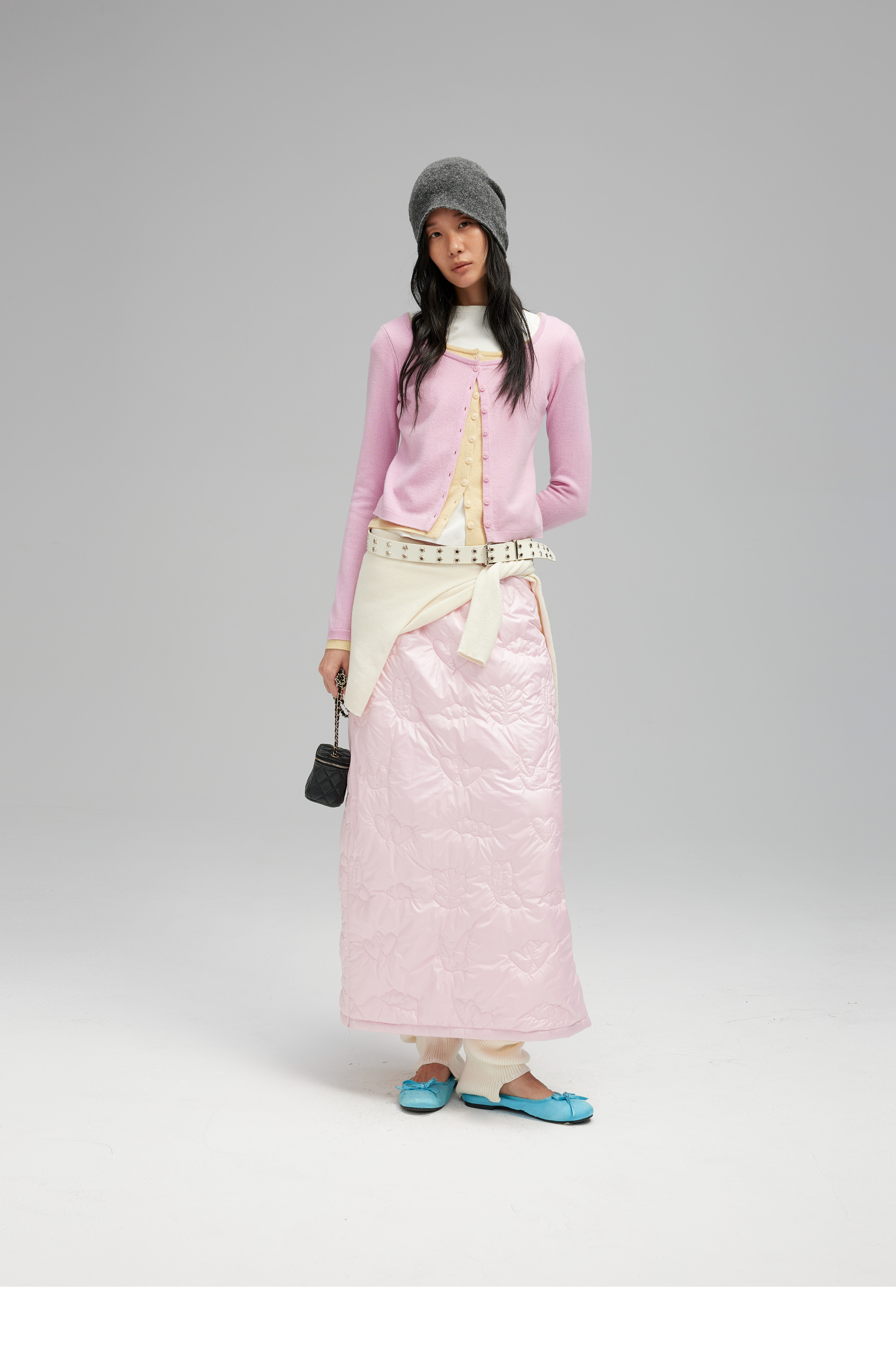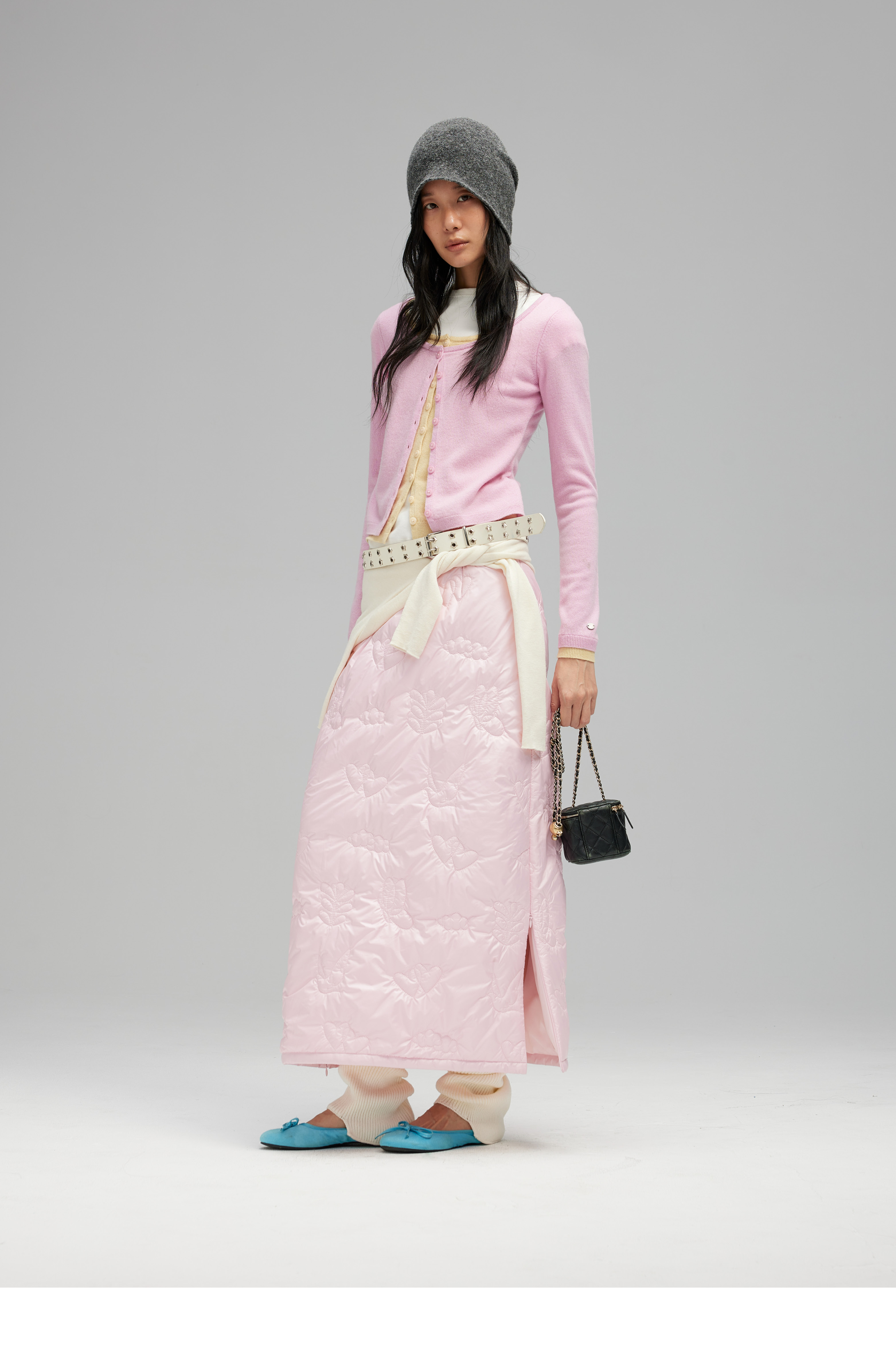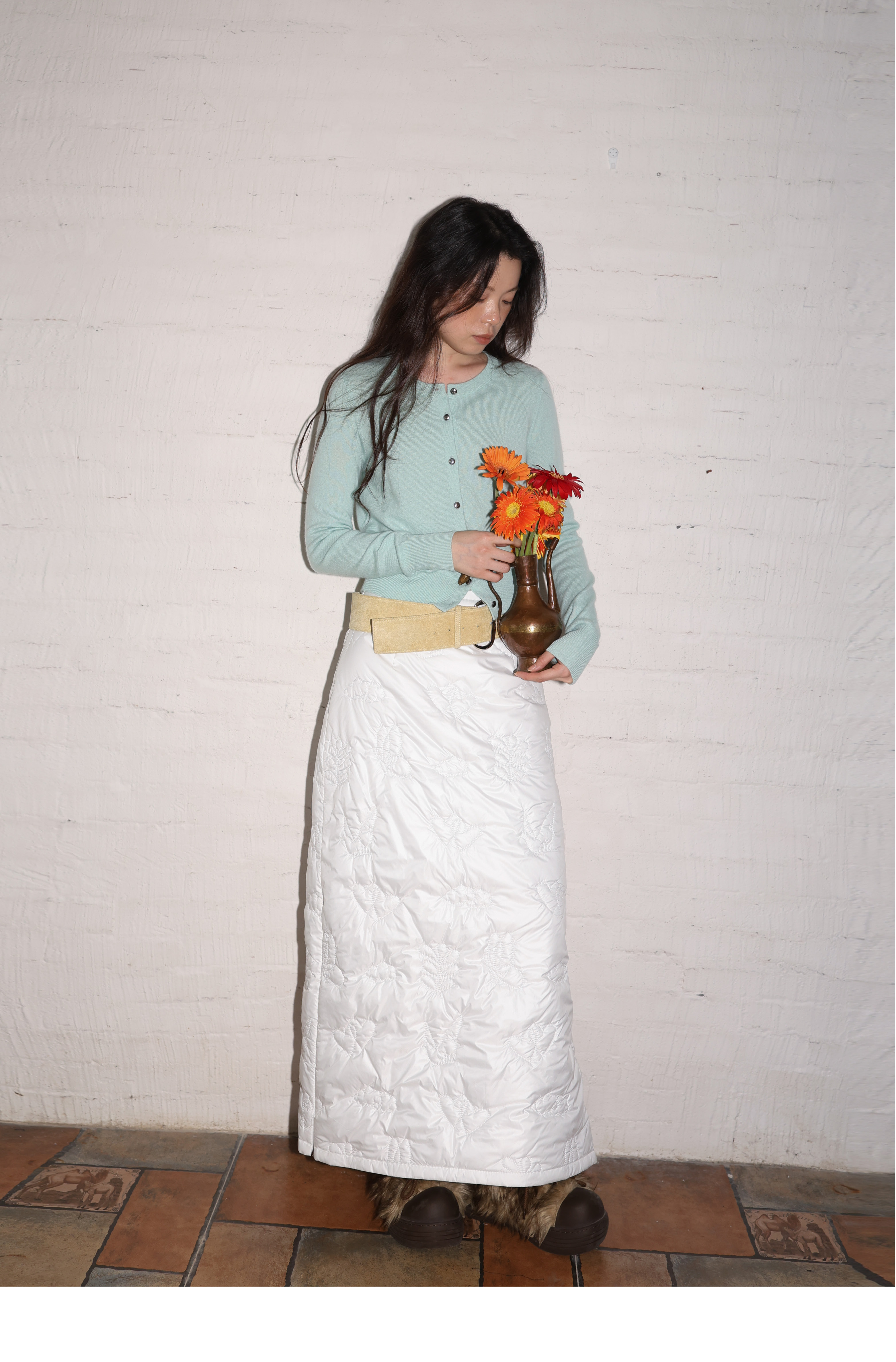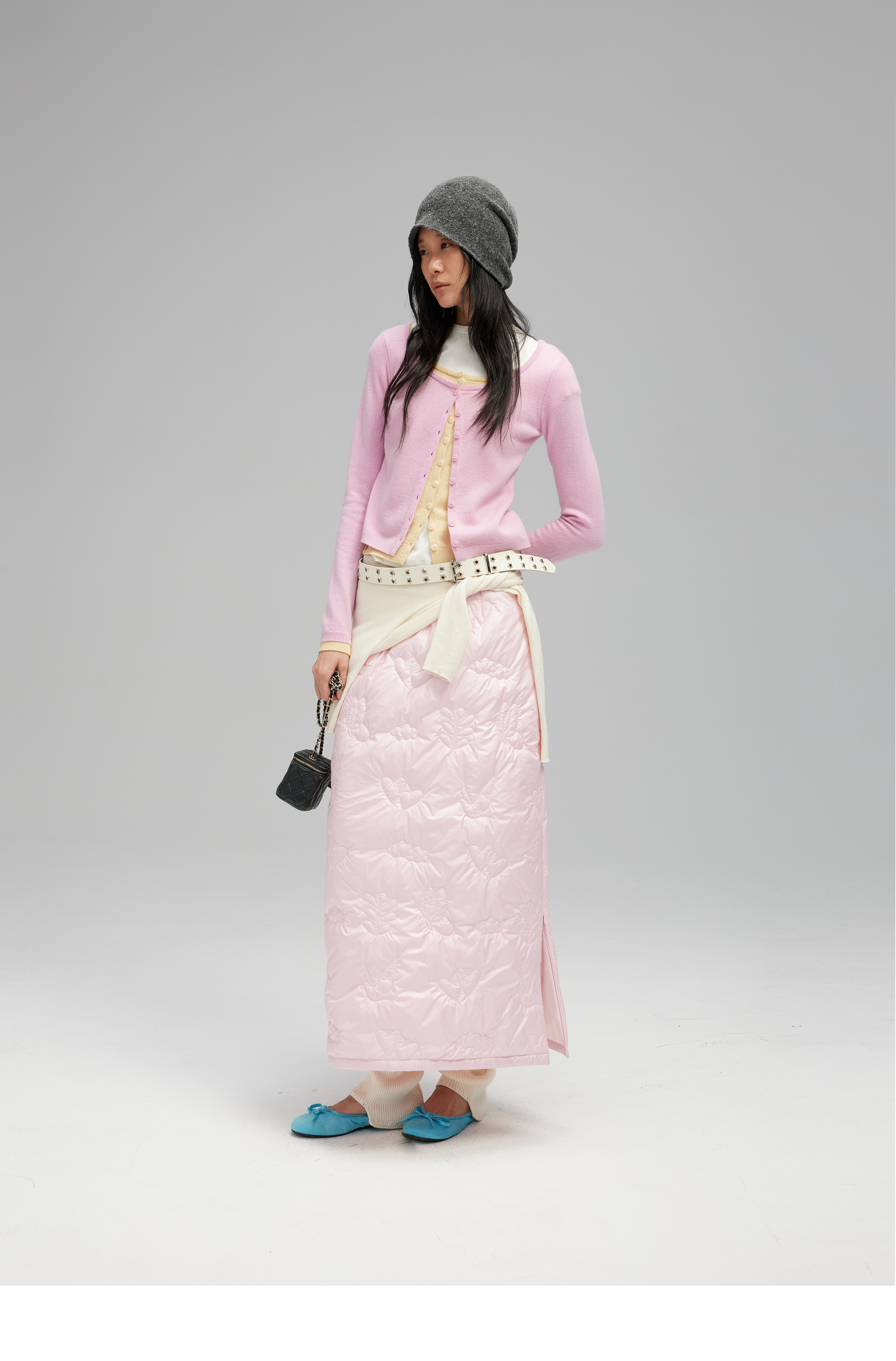 素舶 重工多图案绣花绗缝直筒中高腰下摆侧开叉夹棉保暖半身裙