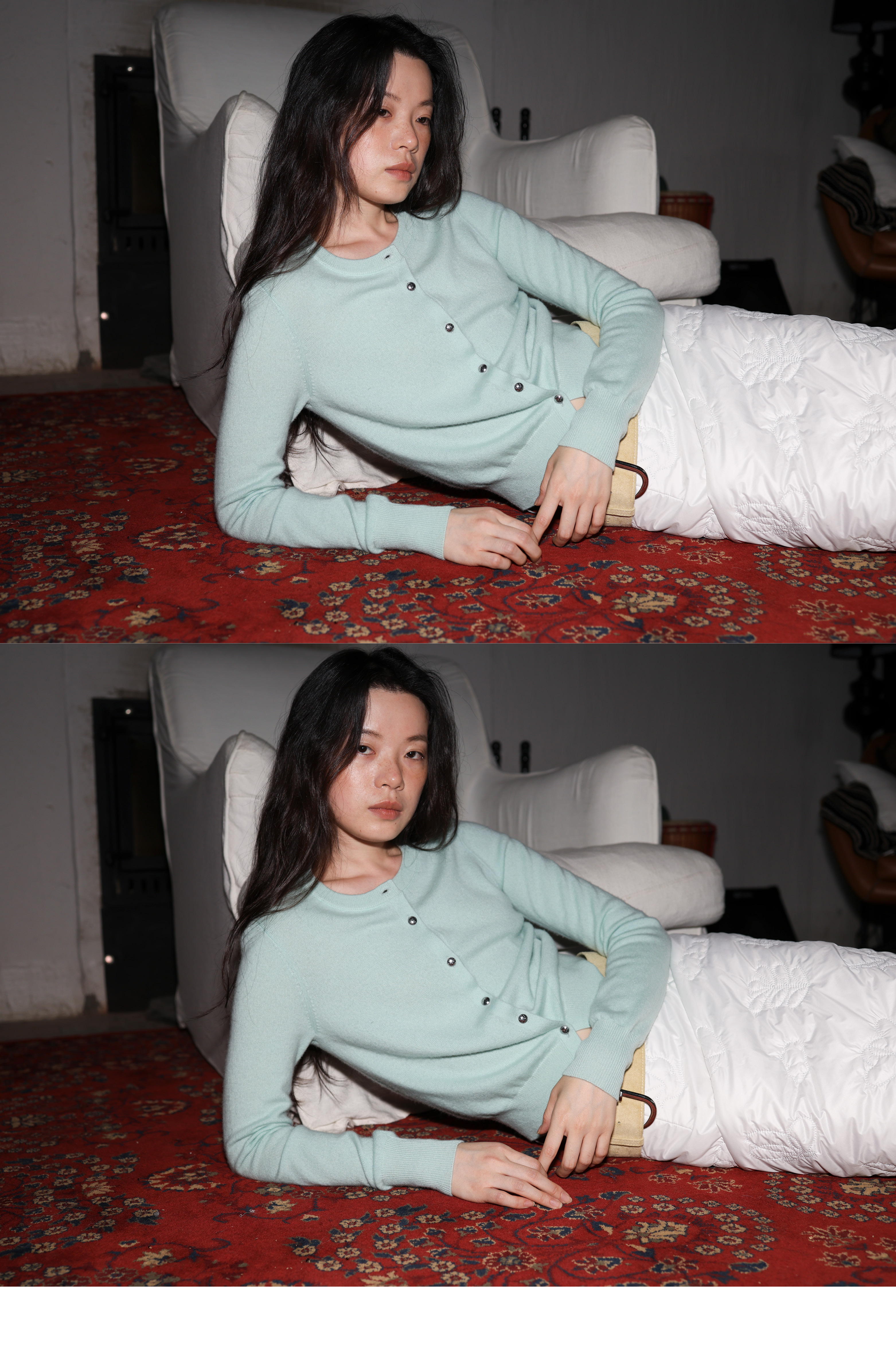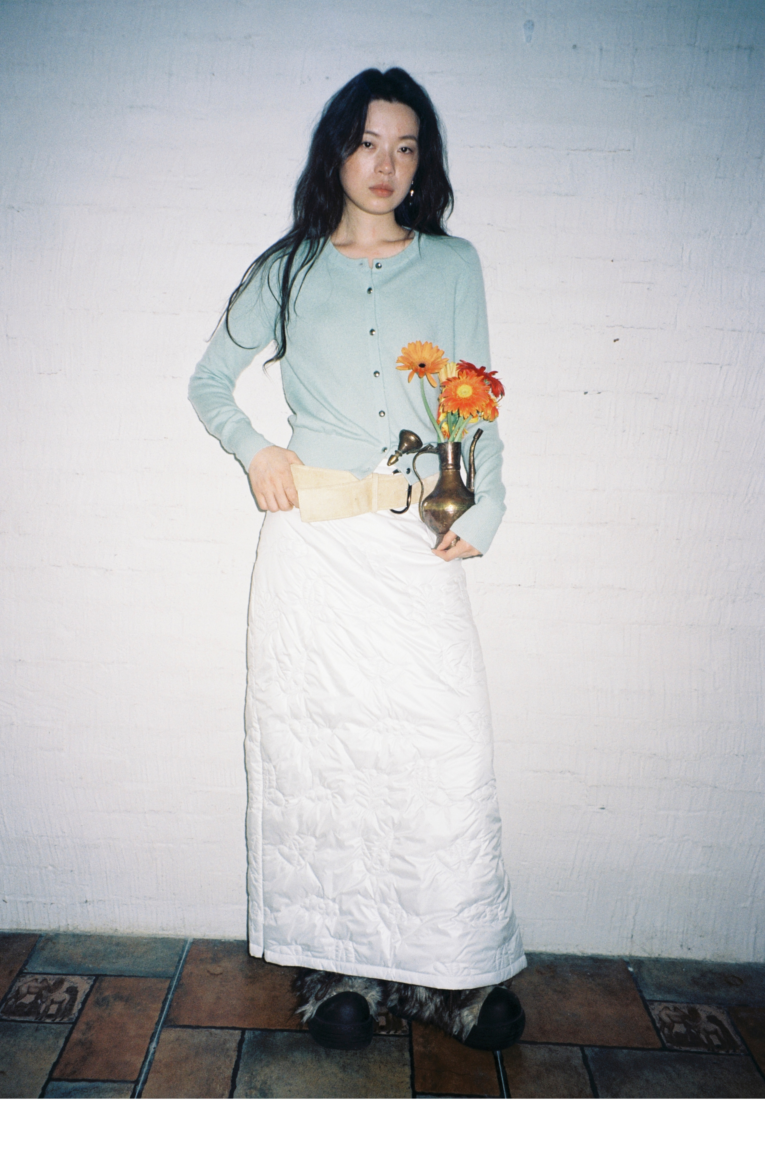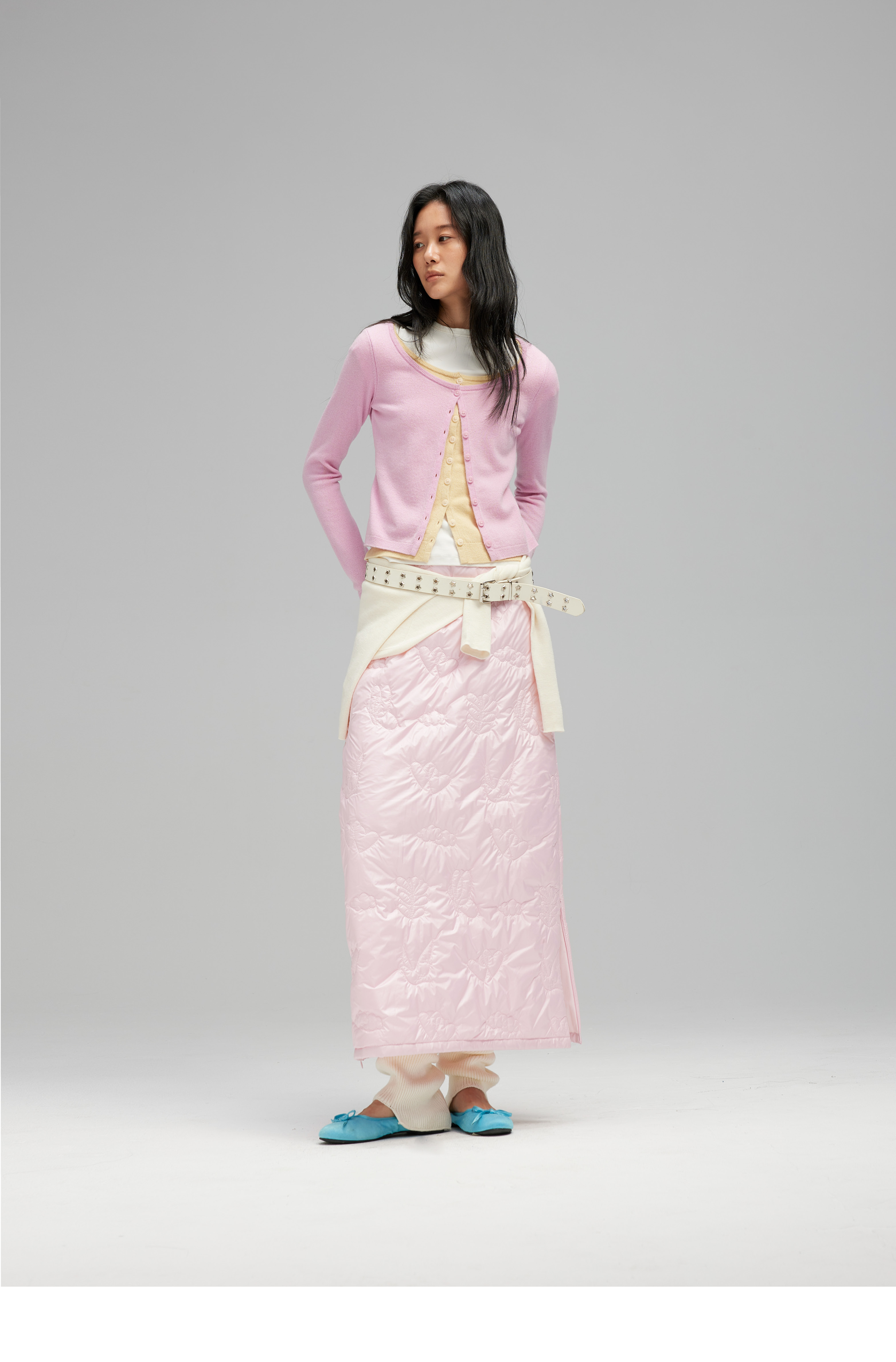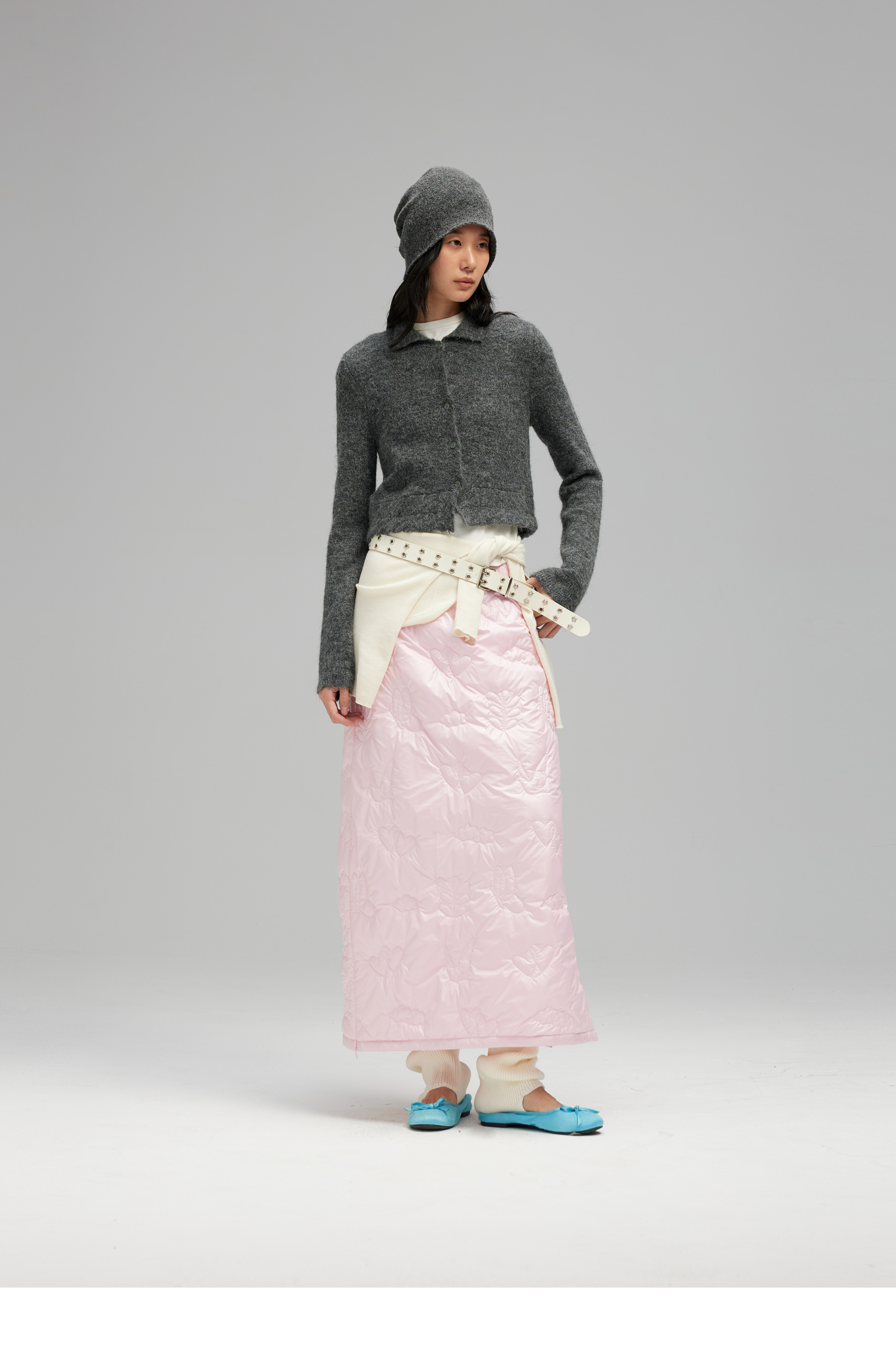 素舶 重工多图案绣花绗缝直筒中高腰下摆侧开叉夹棉保暖半身裙