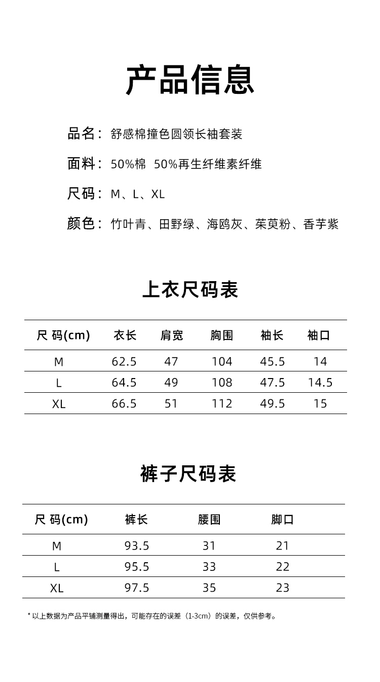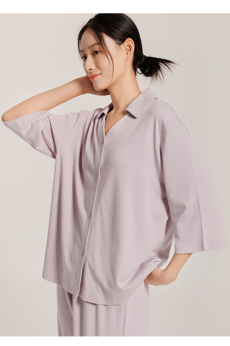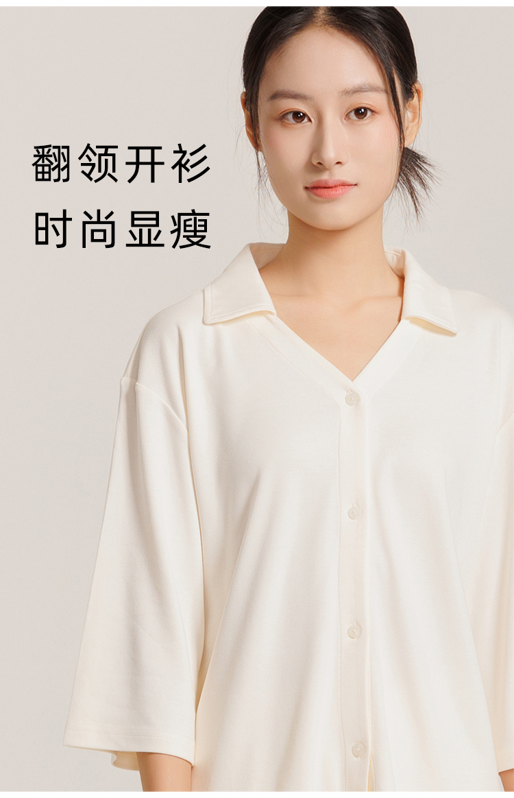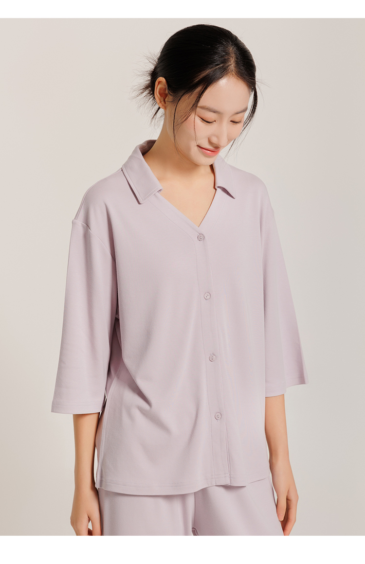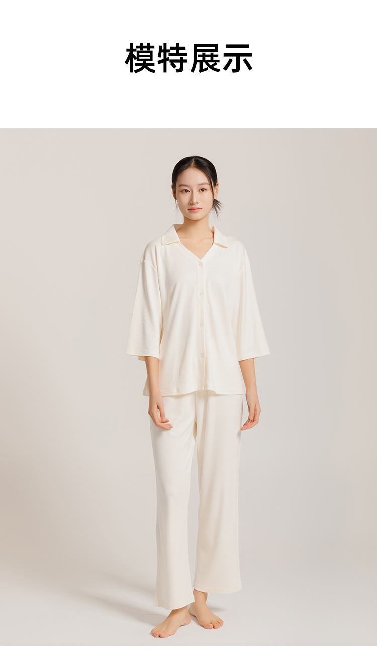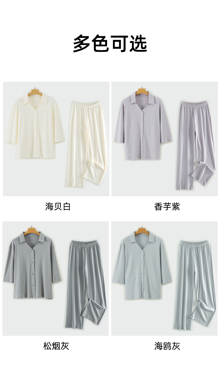 圆领款有竹叶青、田野绿、海鸥灰、茱萸粉、香芋紫五色,耐看又高级,给人一种不经意的慵懒感。翻领款有海贝白、海鸥灰、松烟灰、香芋紫四色,简单文艺的莫兰迪色系,更显气质。M、L、XL三码,我自留的是圆领L码海鸥灰,上身软糯糯!领口包边平整精致,肤感丝滑,细致的做工走线流畅,穿着不会有异物感,连扣眼处也有车线锁边哦!而且袖子和裤长都是九分,更方便做家务,很是清爽,偶尔出门扔个垃圾拿个快递都可以!超级推荐的!