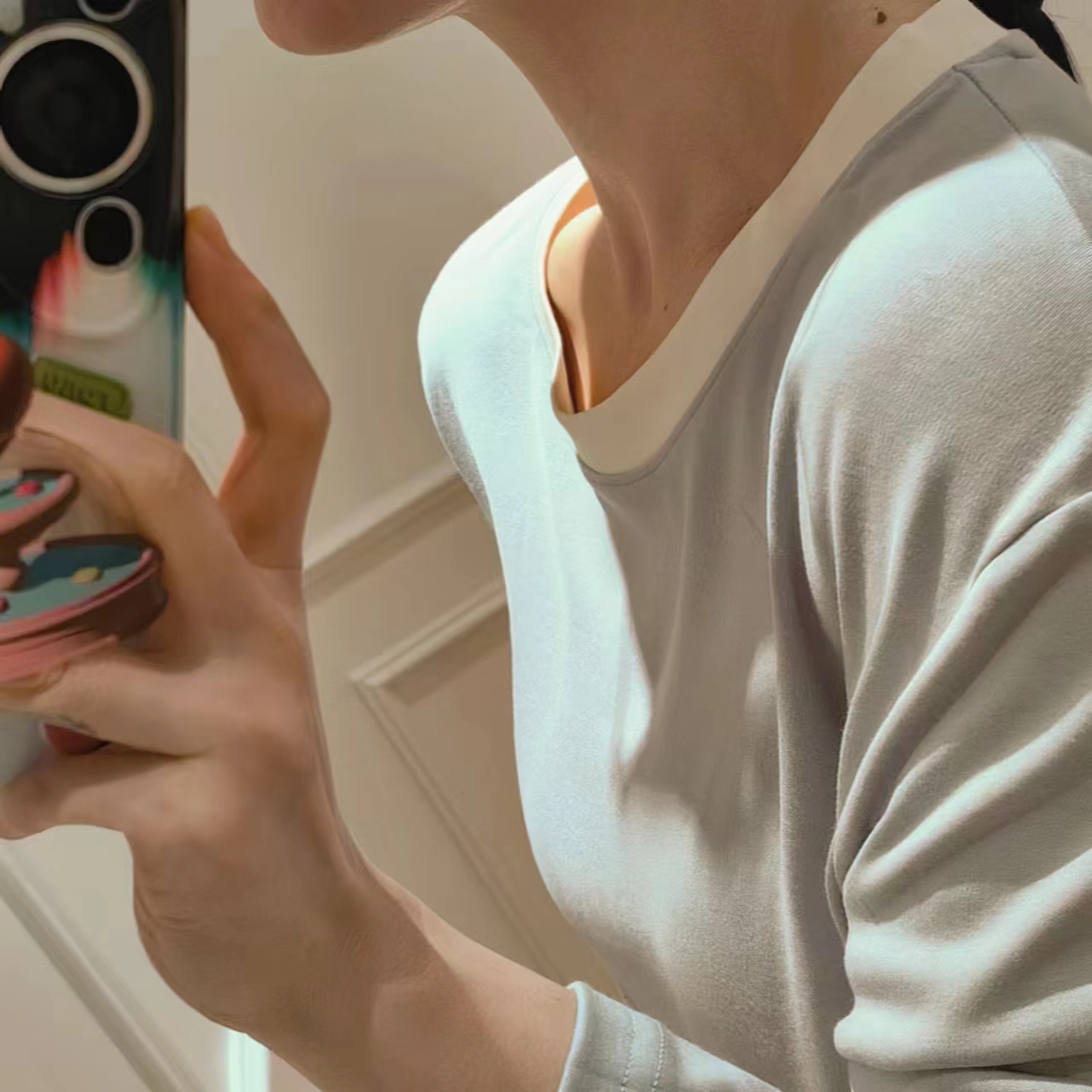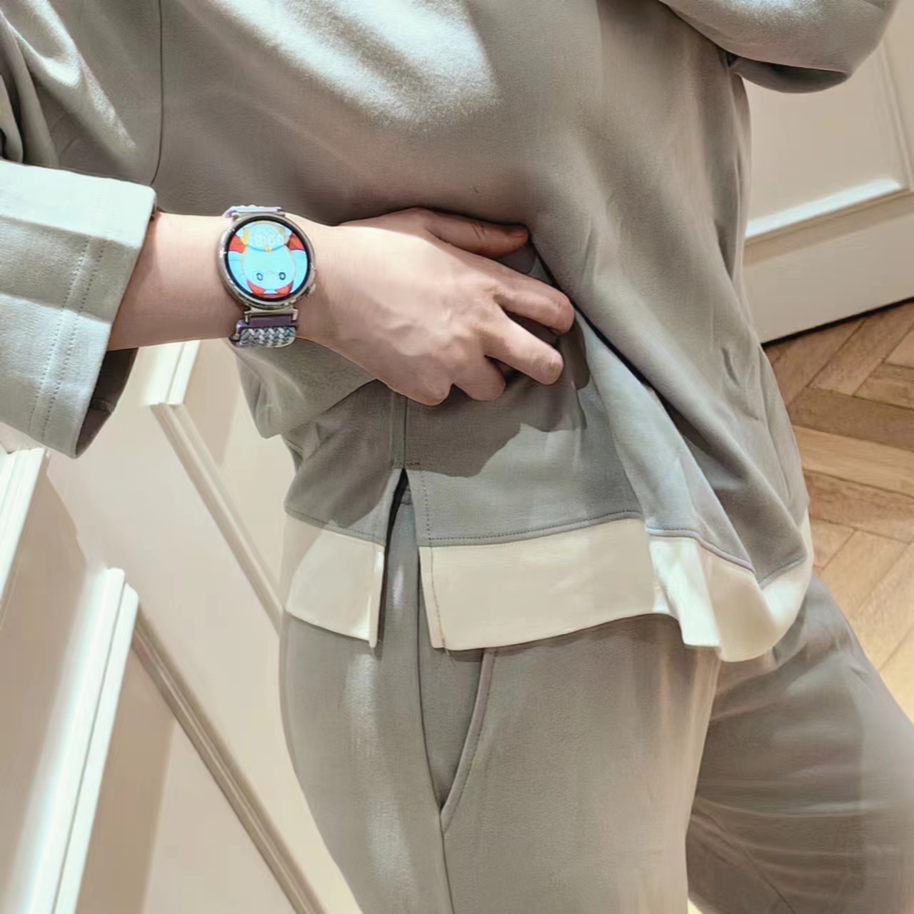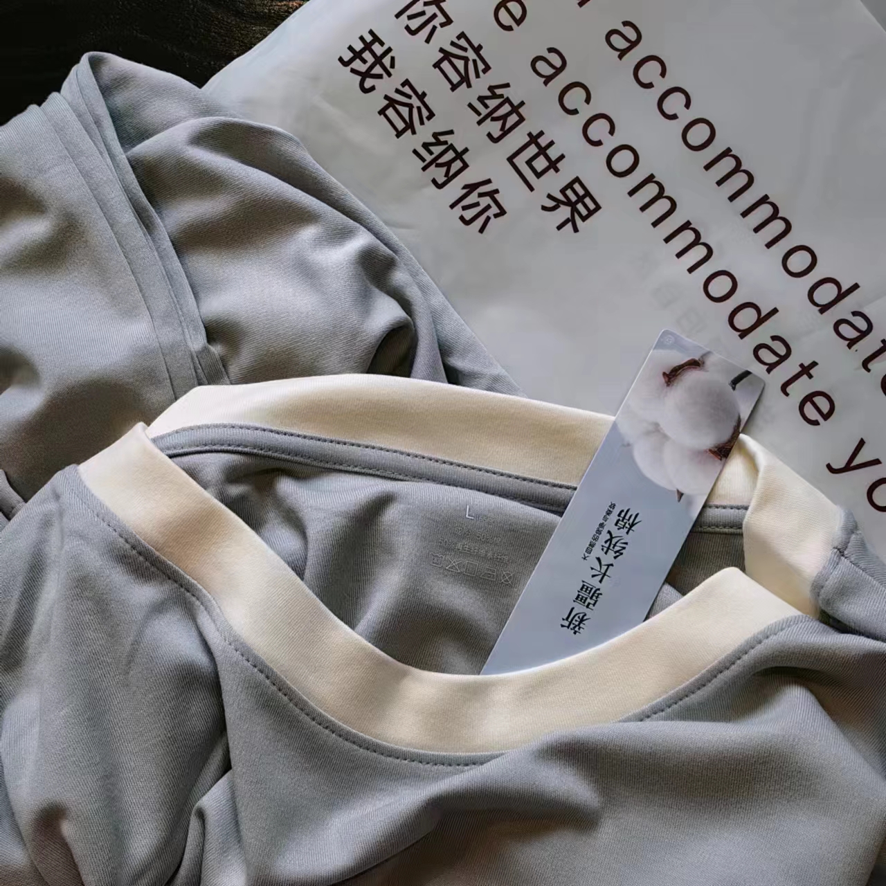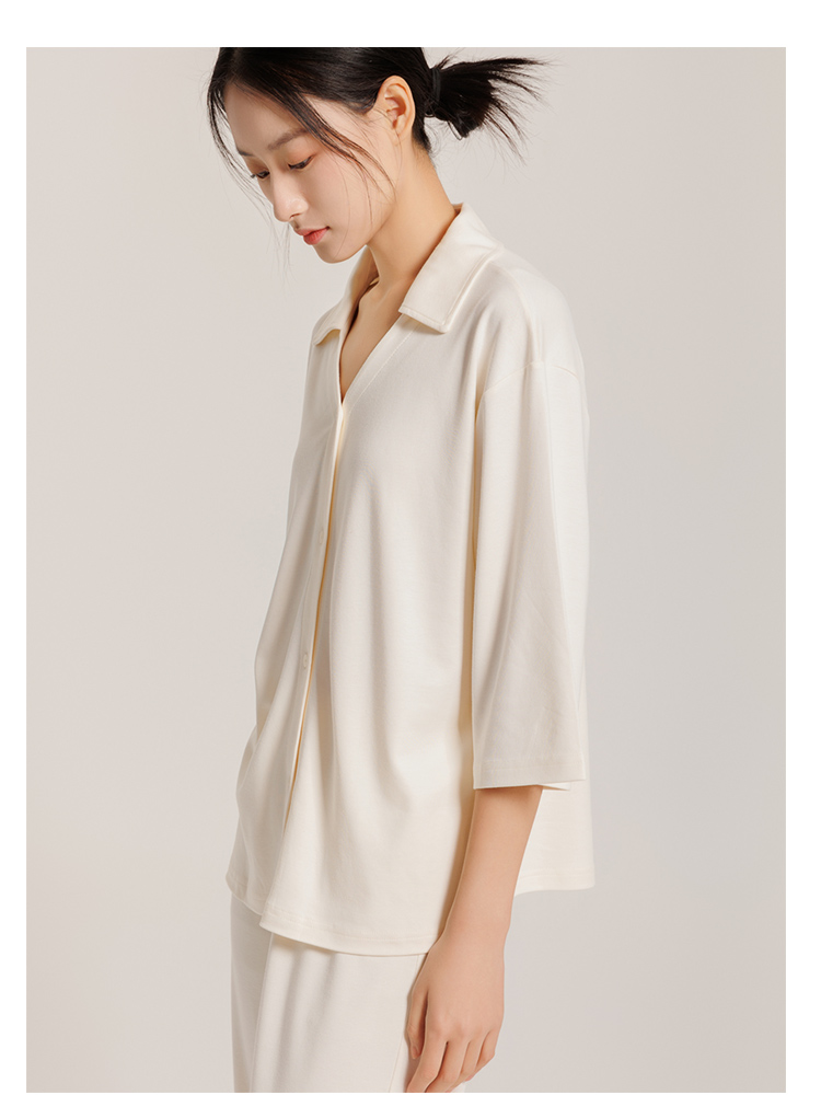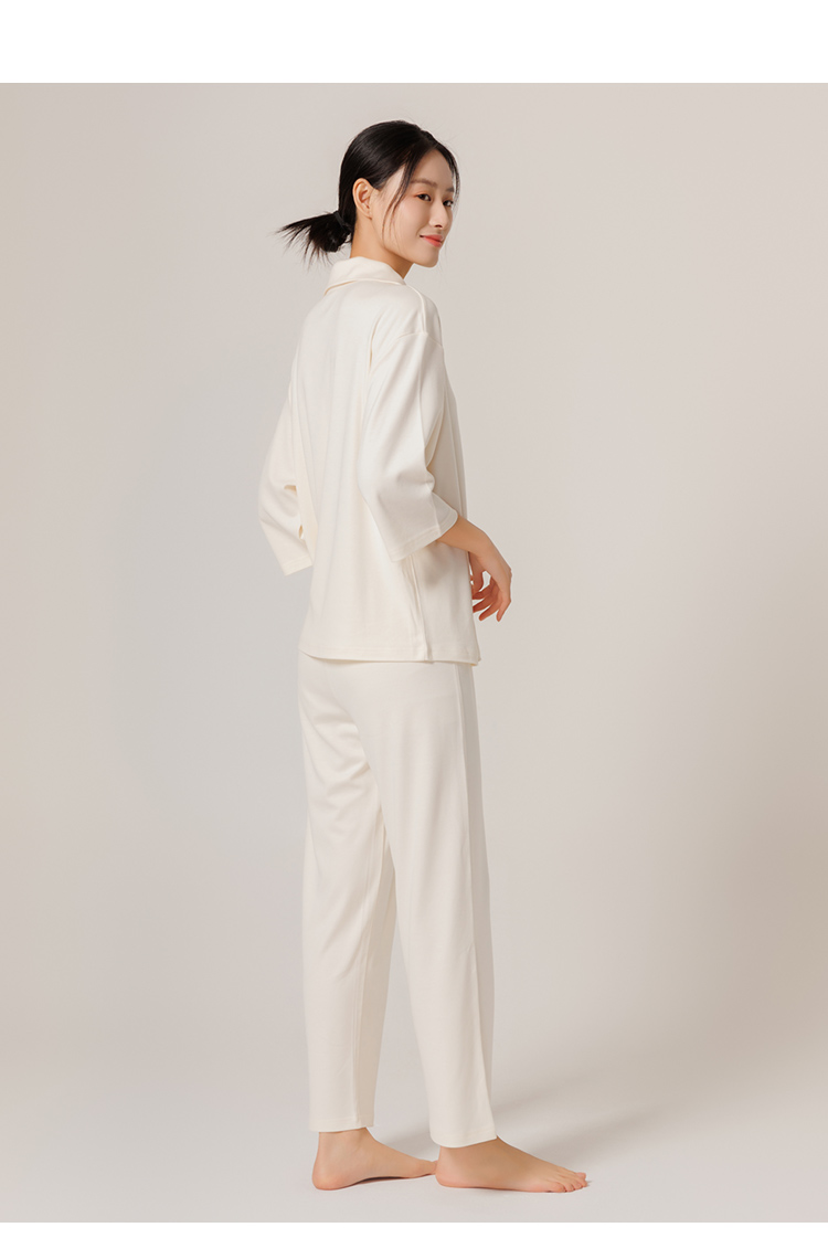 圆领款有竹叶青、田野绿、海鸥灰、茱萸粉、香芋紫五色,耐看又高级,给人一种不经意的慵懒感。翻领款有海贝白、海鸥灰、松烟灰、香芋紫四色,简单文艺的莫兰迪色系,更显气质。M、L、XL三码,我自留的是圆领L码海鸥灰,上身软糯糯!领口包边平整精致,肤感丝滑,细致的做工走线流畅,穿着不会有异物感,连扣眼处也有车线锁边哦!而且袖子和裤长都是九分,更方便做家务,很是清爽,偶尔出门扔个垃圾拿个快递都可以!超级推荐的!