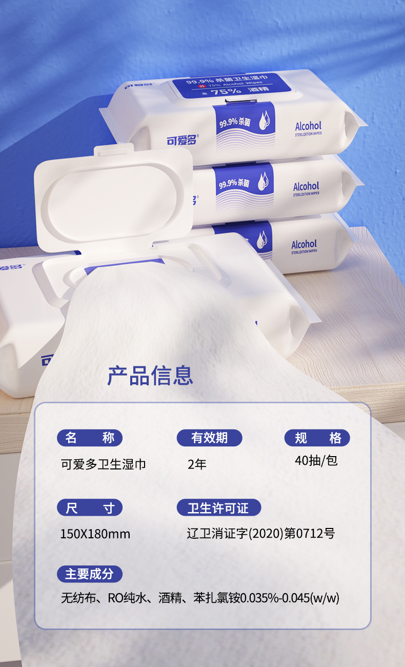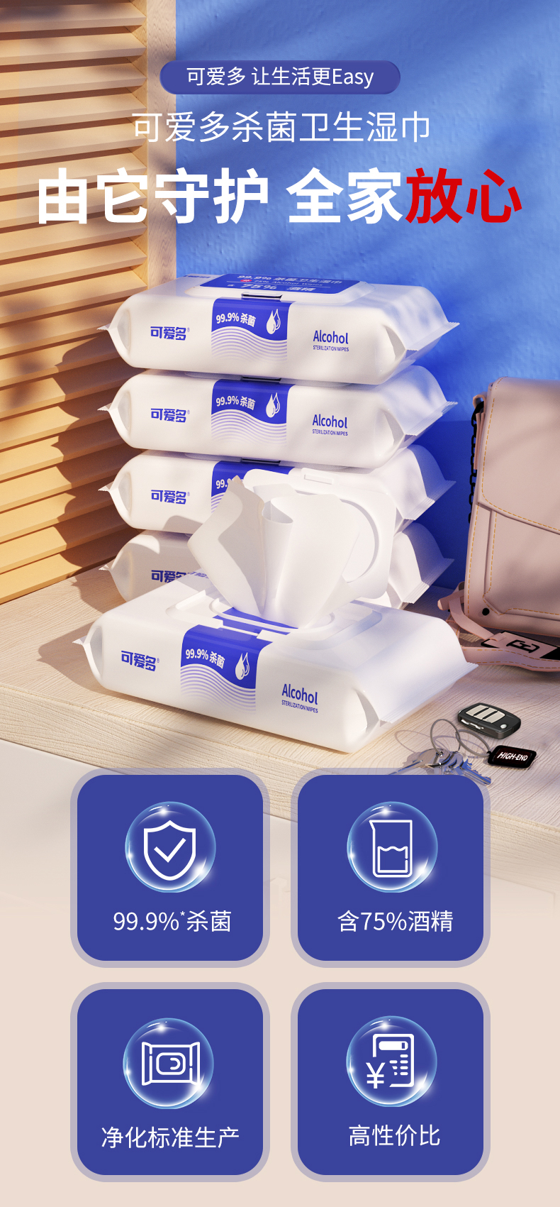 可爱多75%酒精湿巾卫生消毒湿巾 杀菌率99.9%湿纸巾