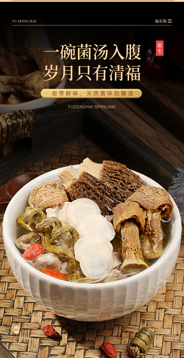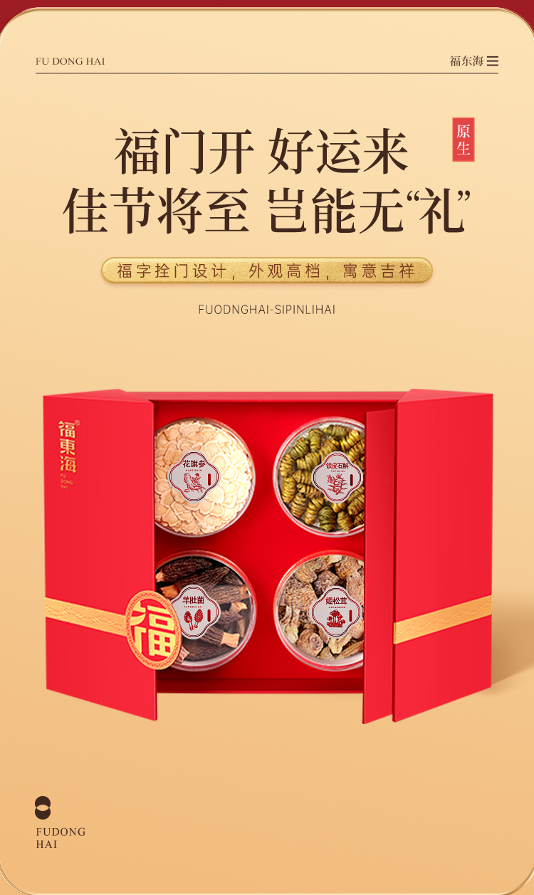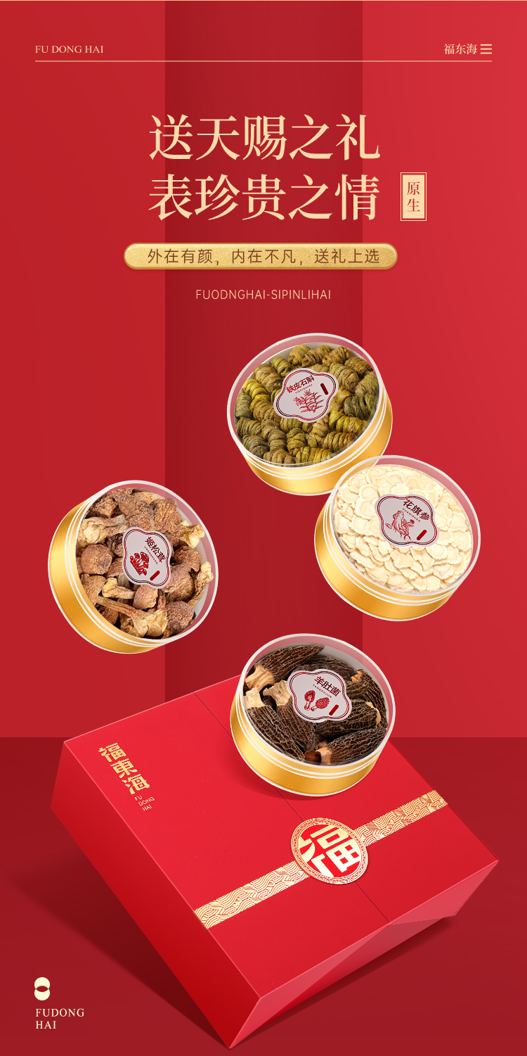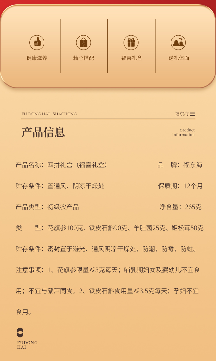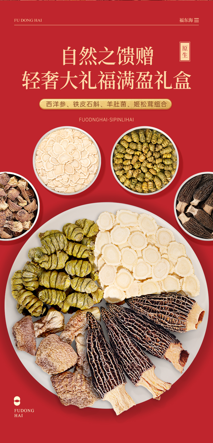 福东海 四拼礼盒羊肚菌25克+花旗参100克+姬松茸50克+铁皮石斛90克(265克)/盒
