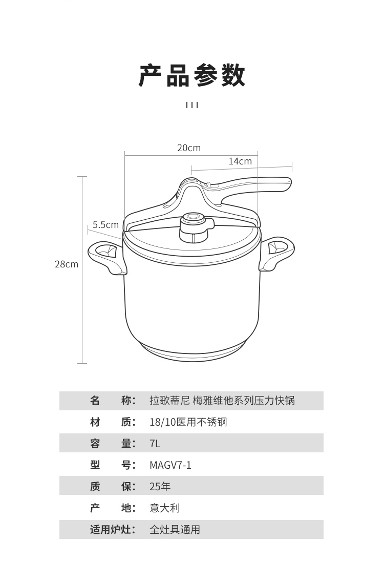 拉歌蒂尼梅雅维他7L压力锅【赠玻璃盖、蒸篮、蒸屉】(暂时不用)