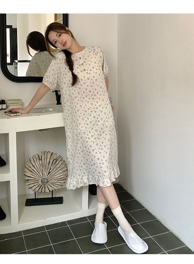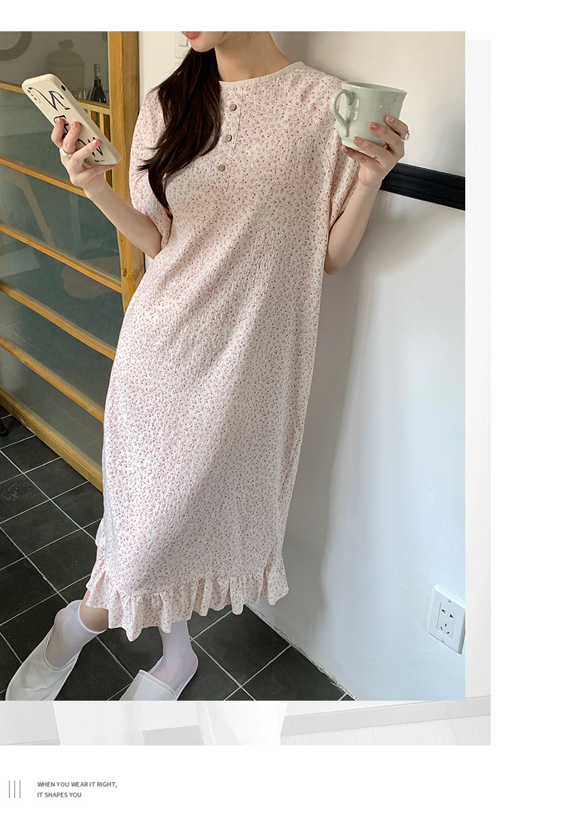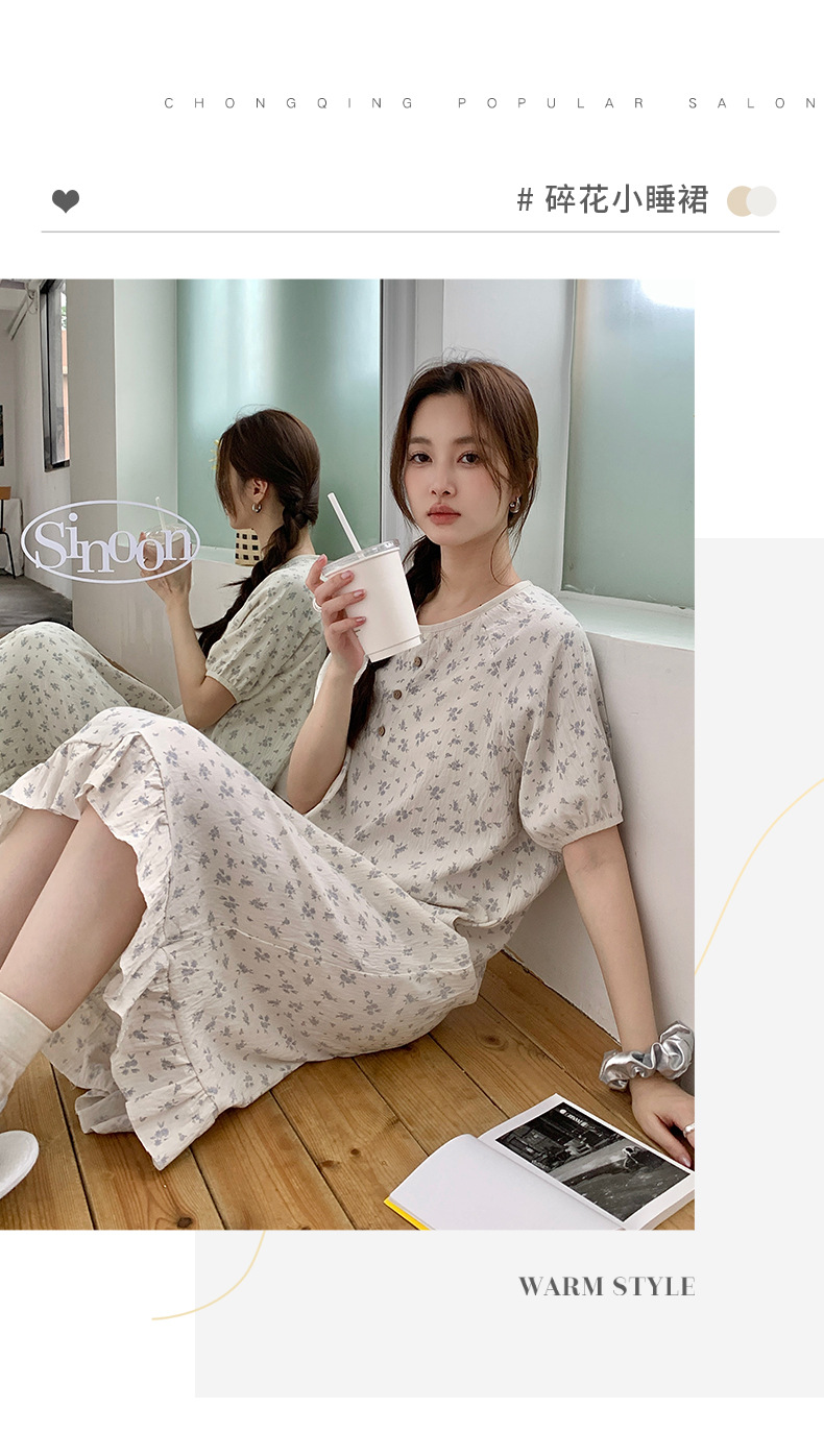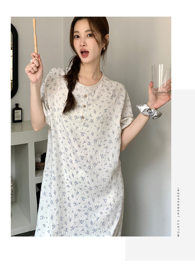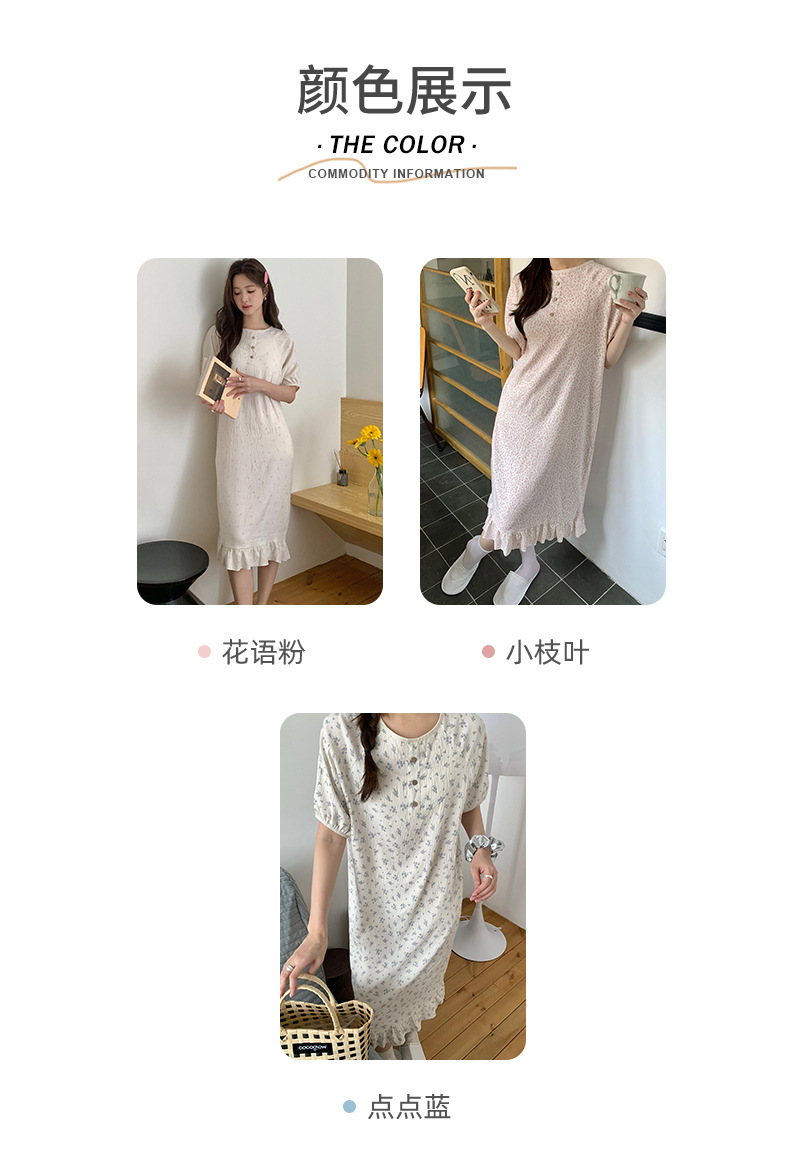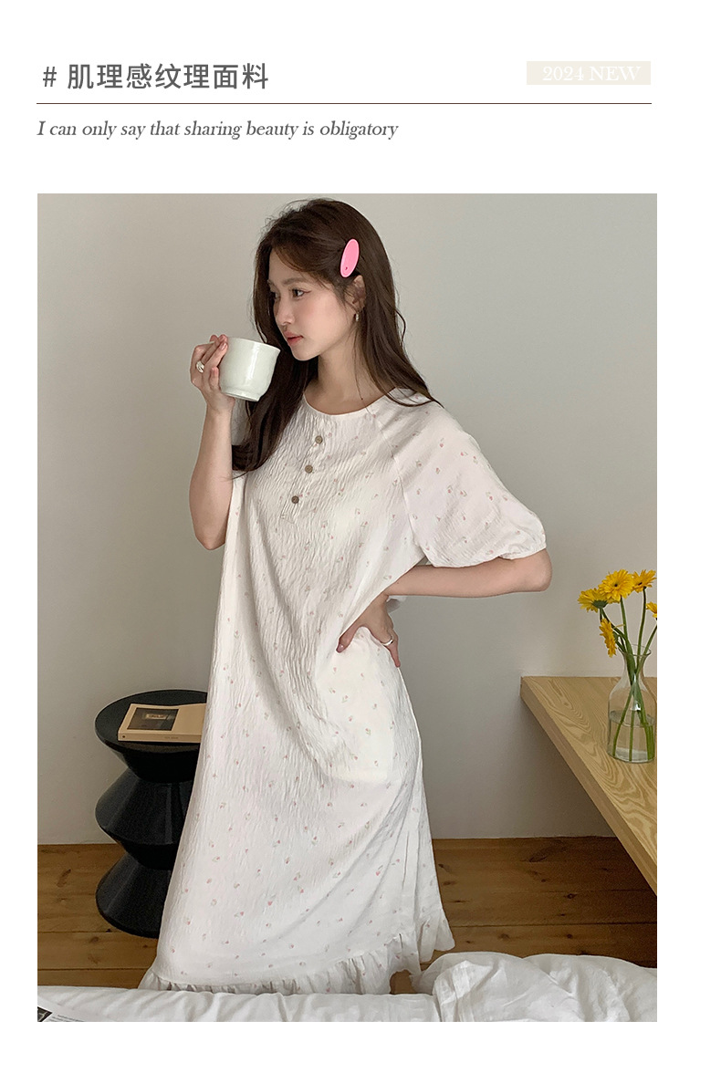 【绵柔轻软】春夏长款纽扣肌理感碎花睡裙女 新款宽松短袖连衣裙薄款睡衣家居服
