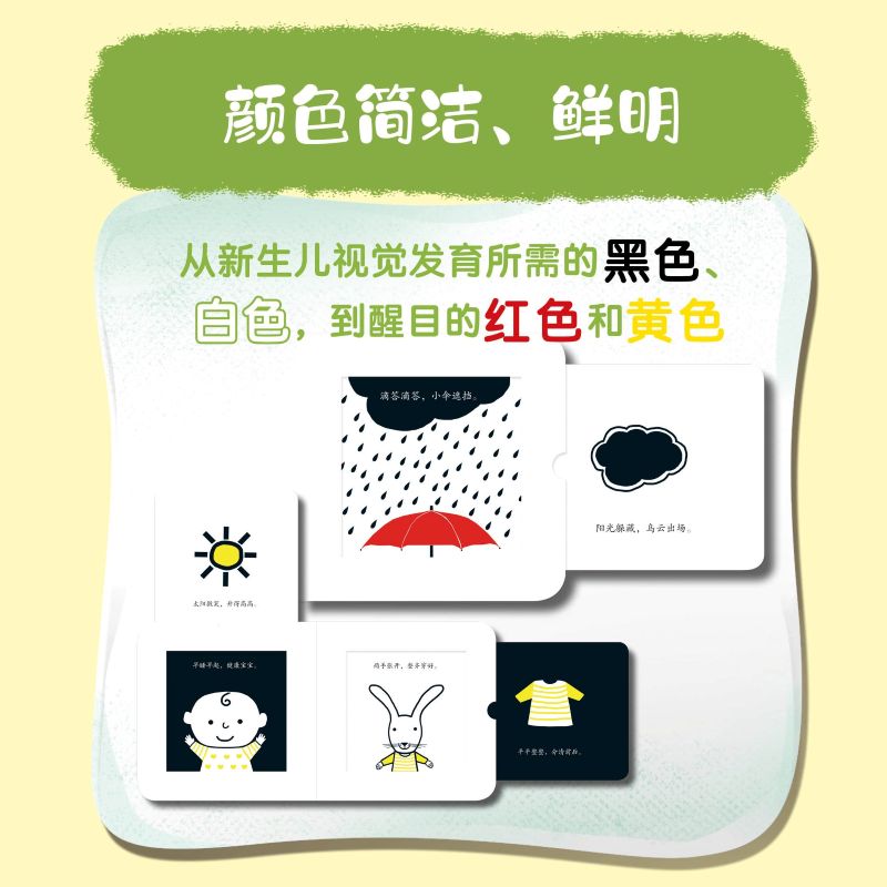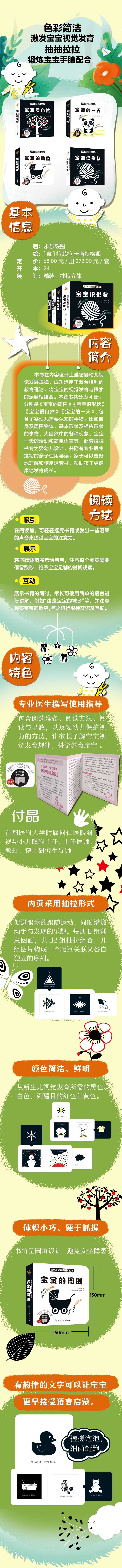 1.专业医生撰写使用指导,由让家长了解宝宝视觉发育规律,科学养育宝宝。2.内页采用抽拉形式。每页一组中,其中一张图片可拉出并缩回,促进眼球的跟随运动,同时增加动手与发现的乐趣。几组图片构成一个相互关联又各自独立的序列。3.设计上颜色鲜明,从新生儿视觉发育所需的黑、白,到醒目的红色和黄色。4.书本体积小巧,便于宝宝小手抓握,书角呈圆角设计,避免安全隐患。5.有韵律的文字可以让宝宝更早接受语言启蒙。