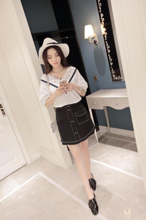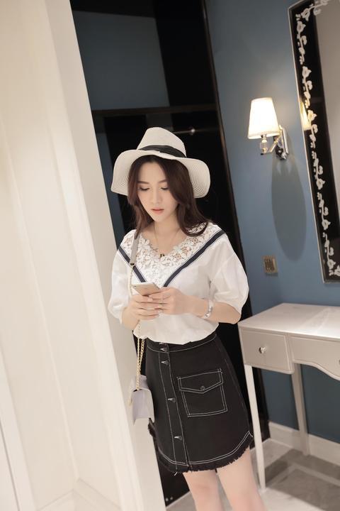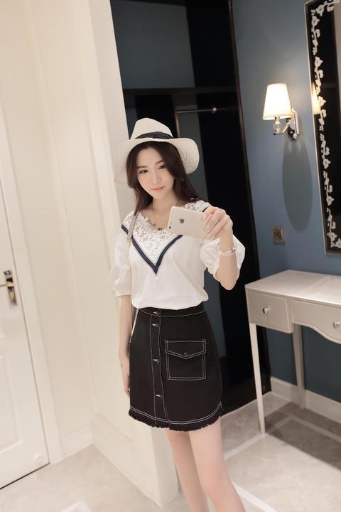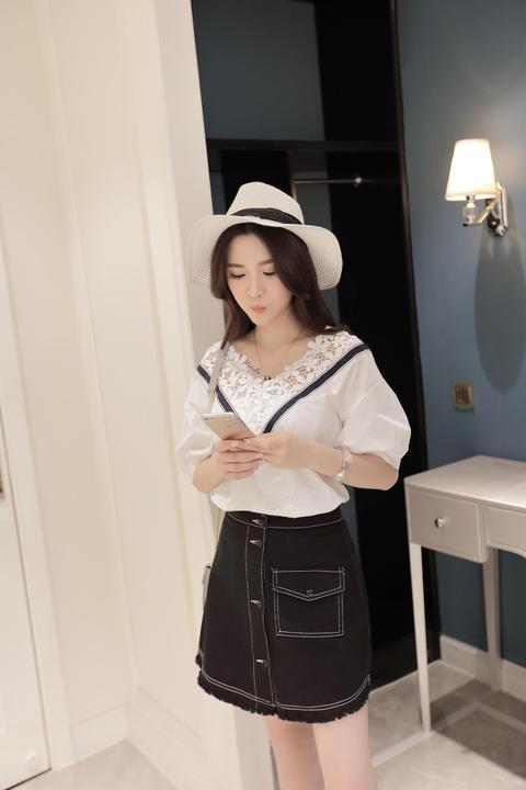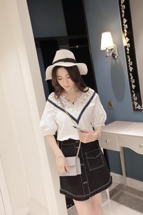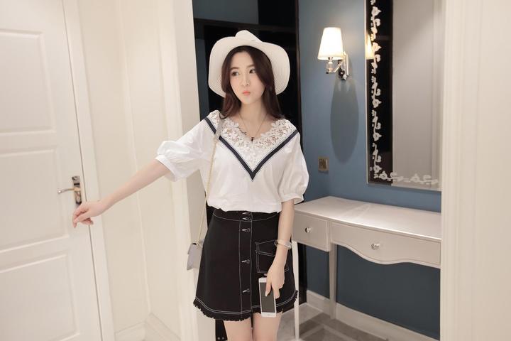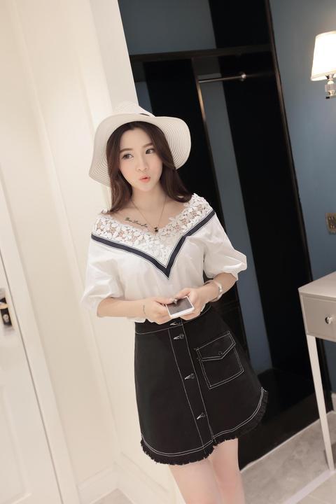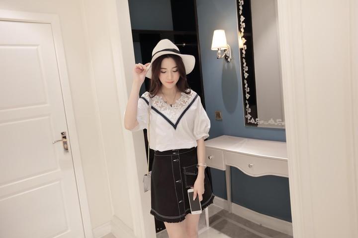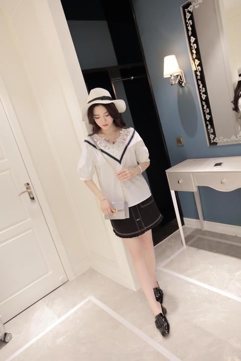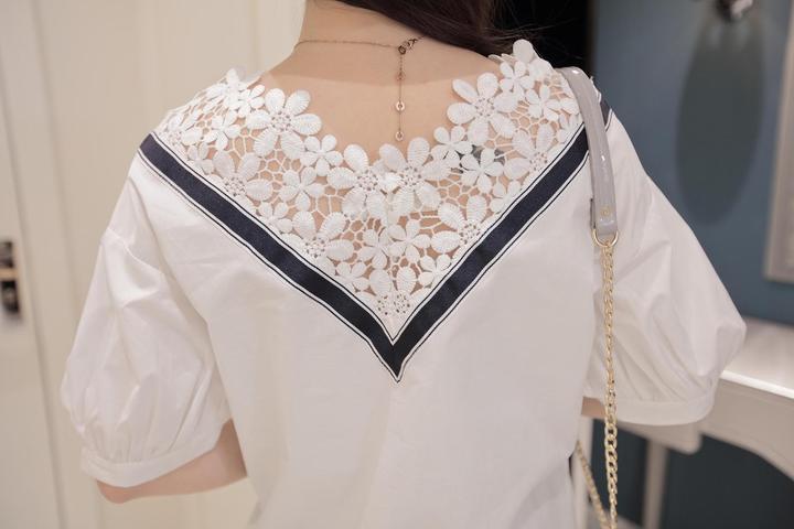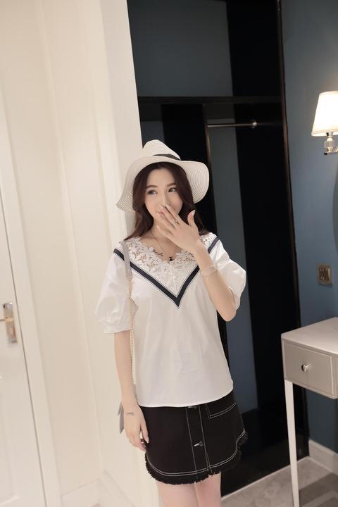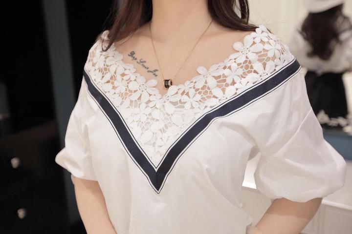 【女上衣】 夏季新款韩版宽松休闲蕾丝拼接花朵V领短袖套头衬衫女