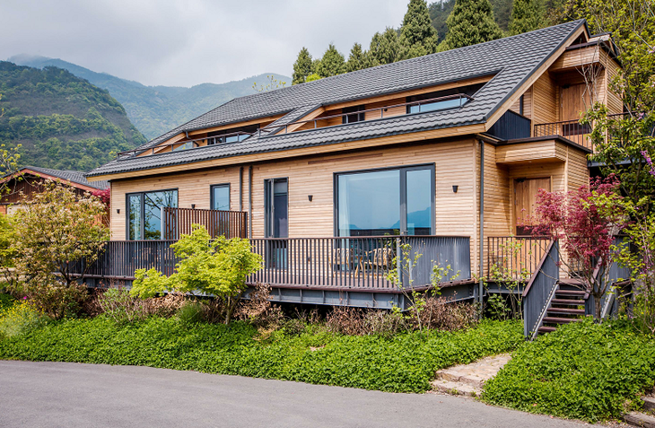 环山抱水而建,船屋、木屋错落有致的散落湖畔山间