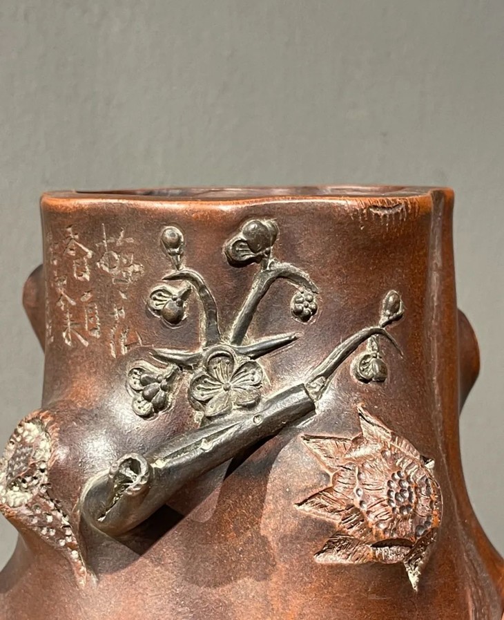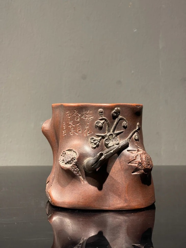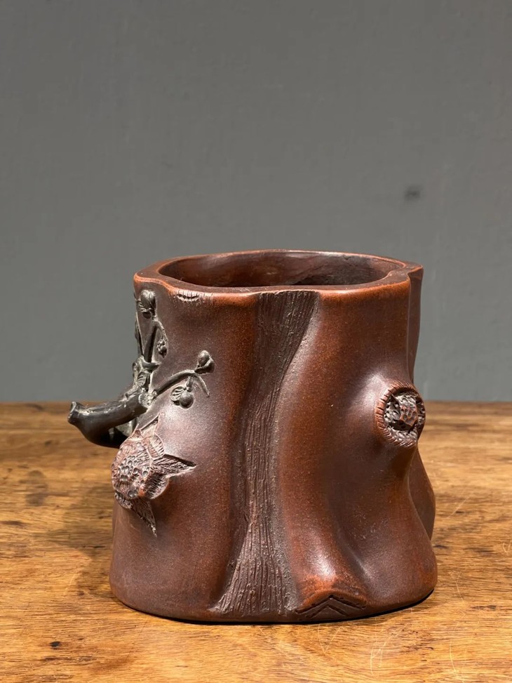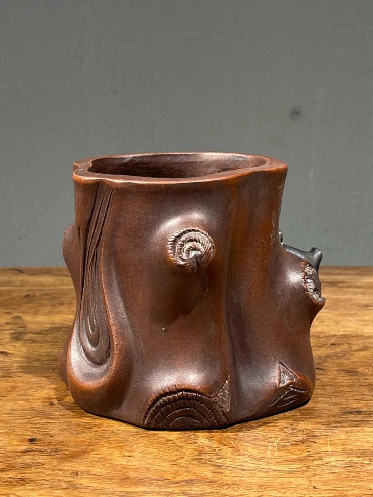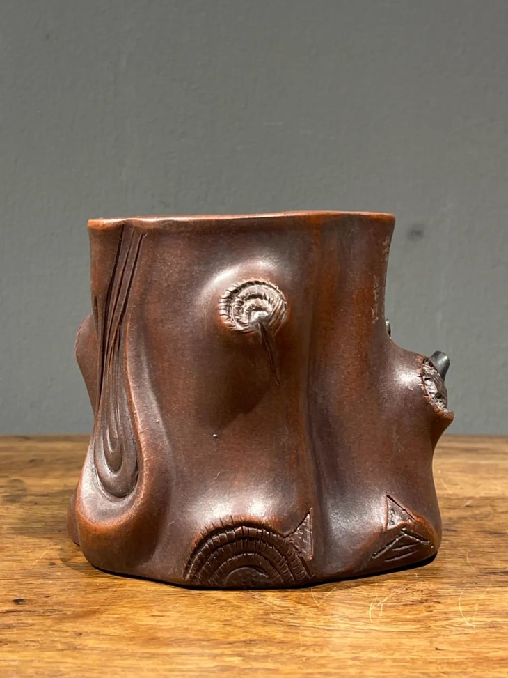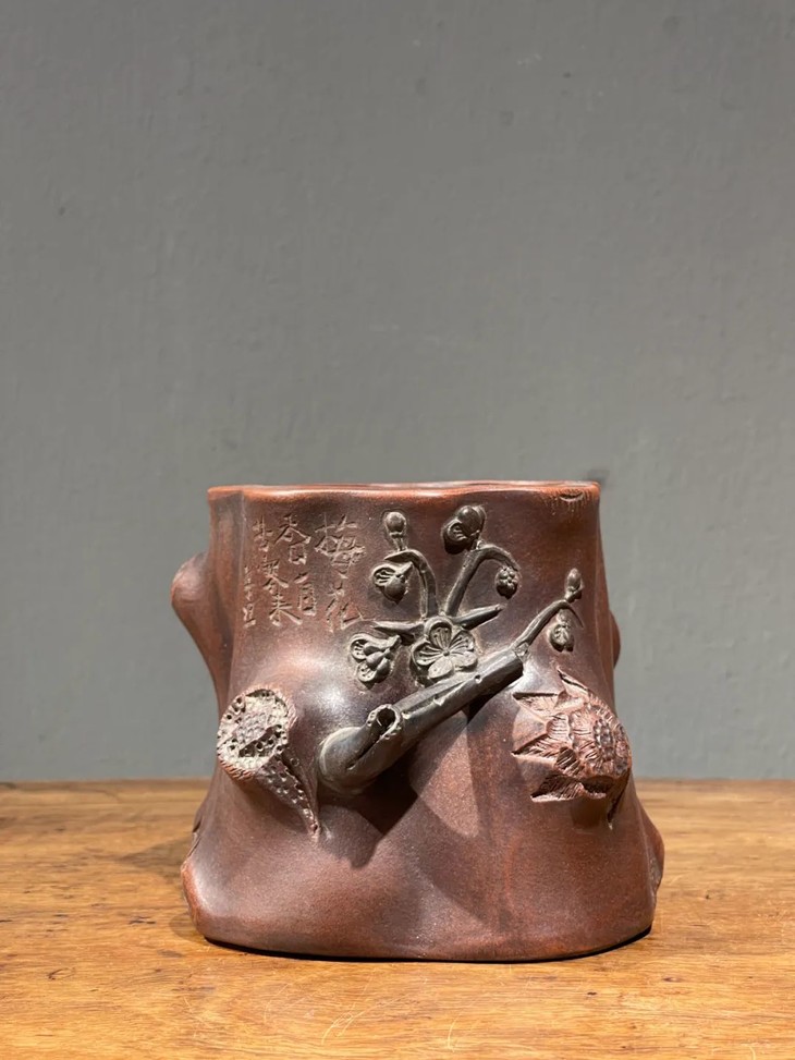 紫砂刻梅花树桩形笔筒