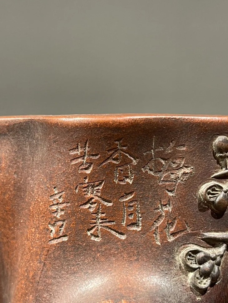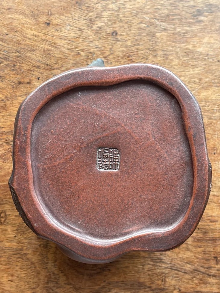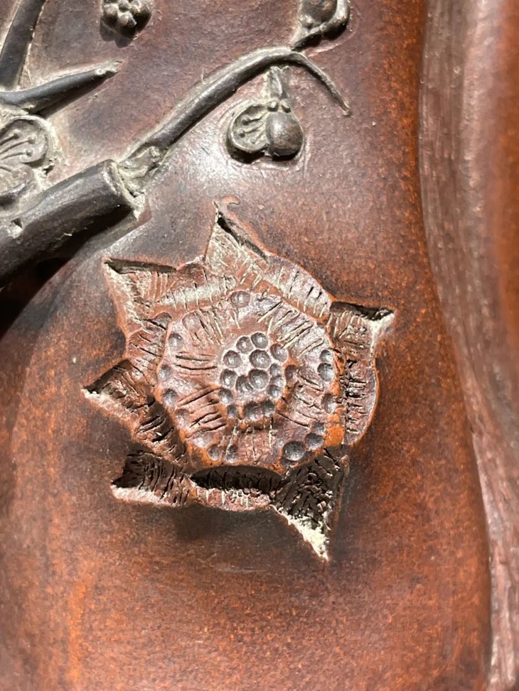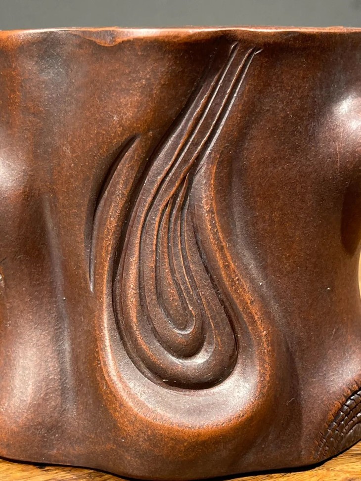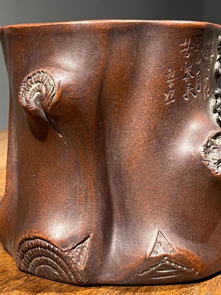 今天分享的这件”陳鳴遠”款宜兴紫砂刻梅花树桩形笔筒,设计与制作工艺卓越精湛,紫砂泥料朴拙细緻,深具文人品味,素胎皮壳柔美细腻、仿生梅花树桩雕琢生动精彩,表面特殊质地独具一格,是一件精美的宜兴紫砂笔筒。此紫砂刻梅花树桩形笔筒雕琢生动精彩,如图所示,除正常使用之边缘与雕刻凸出之处细微磨损与轻微嗑碰外,基本保存状况良好。