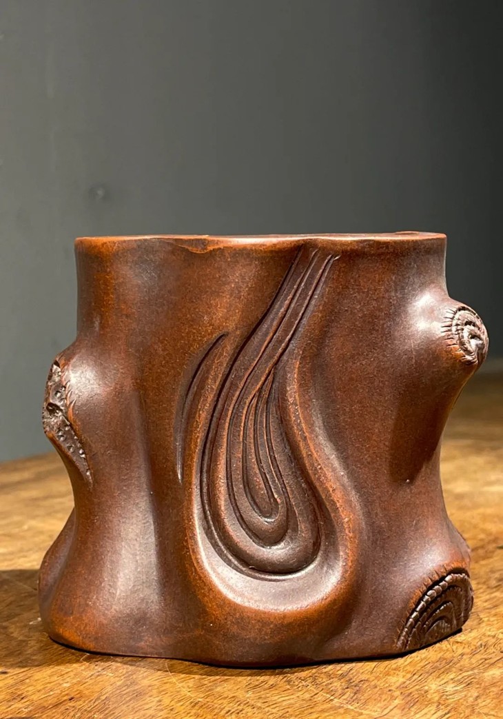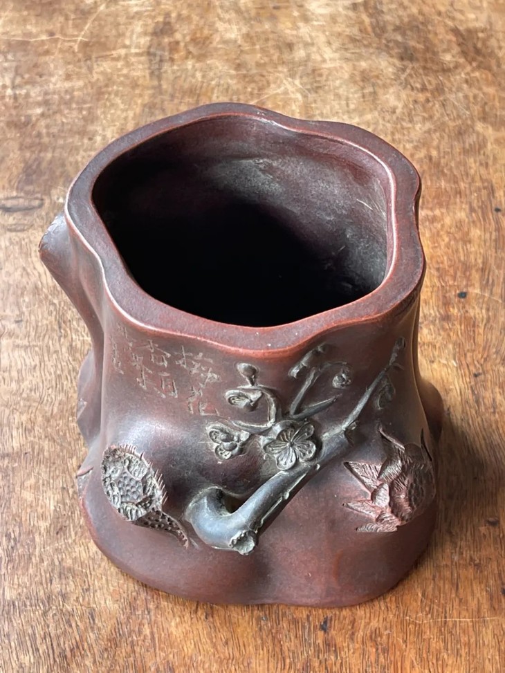 此宜兴紫砂刻梅花树桩形笔筒,案头摆设尺寸适中,敦厚朴实,宜兴紫砂工匠以制作茶壶闻名于世,明代以来偶有见紫砂文房用具精品,此紫砂刻梅花树桩形笔筒是一件民国或是更早的文人雅士喜好的“陳鳴遠”款文房笔筒。