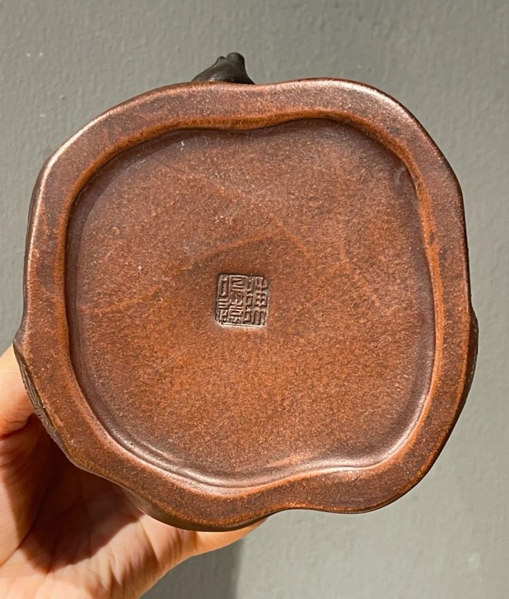 尺寸:高:10.5厘米,口沿长:10厘米,宽:9厘米,底部长:12.3厘米,宽:12厘米,总宽:13.5厘米,重量:590克。