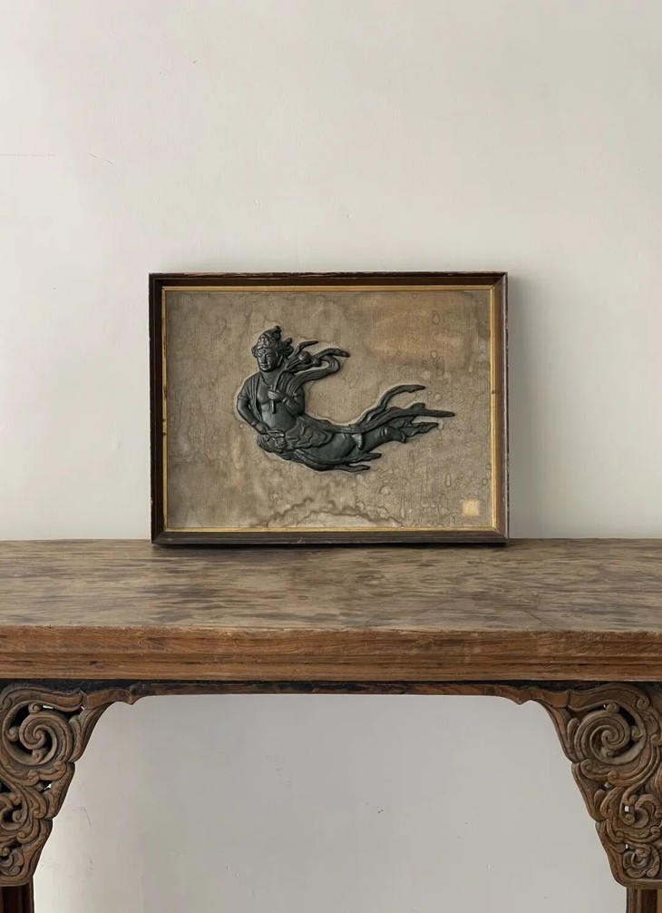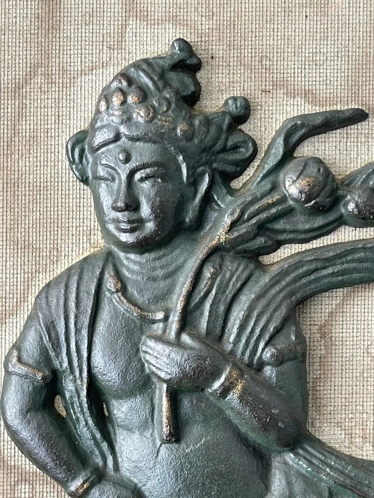 这是一件年代老、制作严谨、飞天仙女浮雕造形庄严华丽的青铜壁饰,铸造雕琢出奇精美优雅的青铜飞天,以比重高、特别压手的精炼铜铸造浮雕上色成飞天雕塑壁饰,裱装于长方木框内而成的挂饰,优美浮雕古典佛教寺庙与石窟内常件的飞天仙女,整体风格华丽贵气,线条流畅优美,雕琢精緻细腻,颇有唐宋飞天风格,是一件精炼铜质精良厚实、雕塑与錾刻贵气华丽的青铜壁饰,全器表面覆盖青铜色皮与自然风化磨损痕迹。