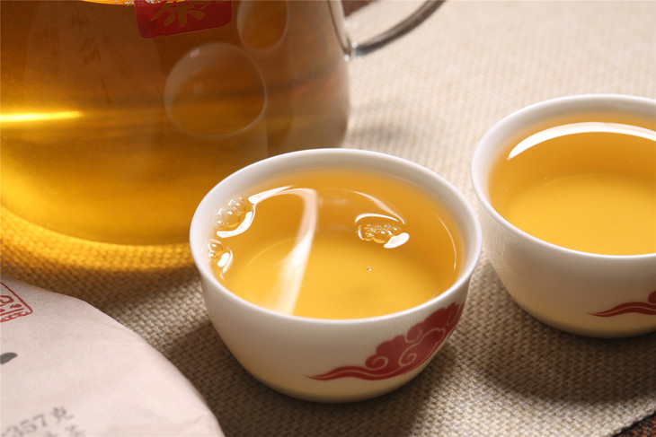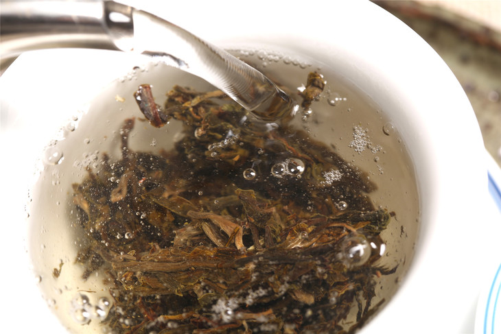 撬茶,紧结成块,茶底干净,内外用料一致匀称。注入沸水,丰富泡沫即时浸出。