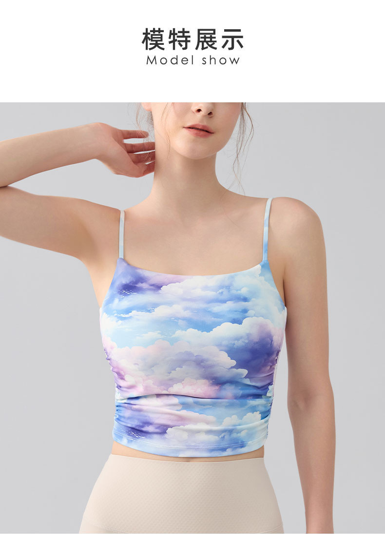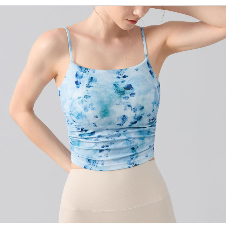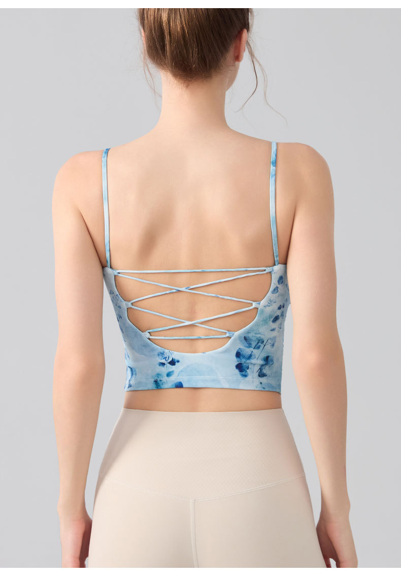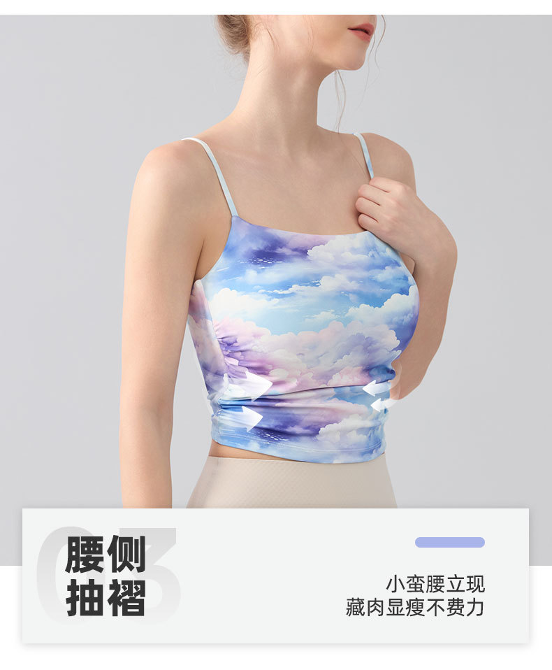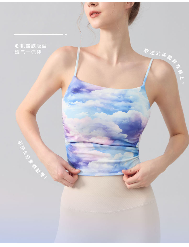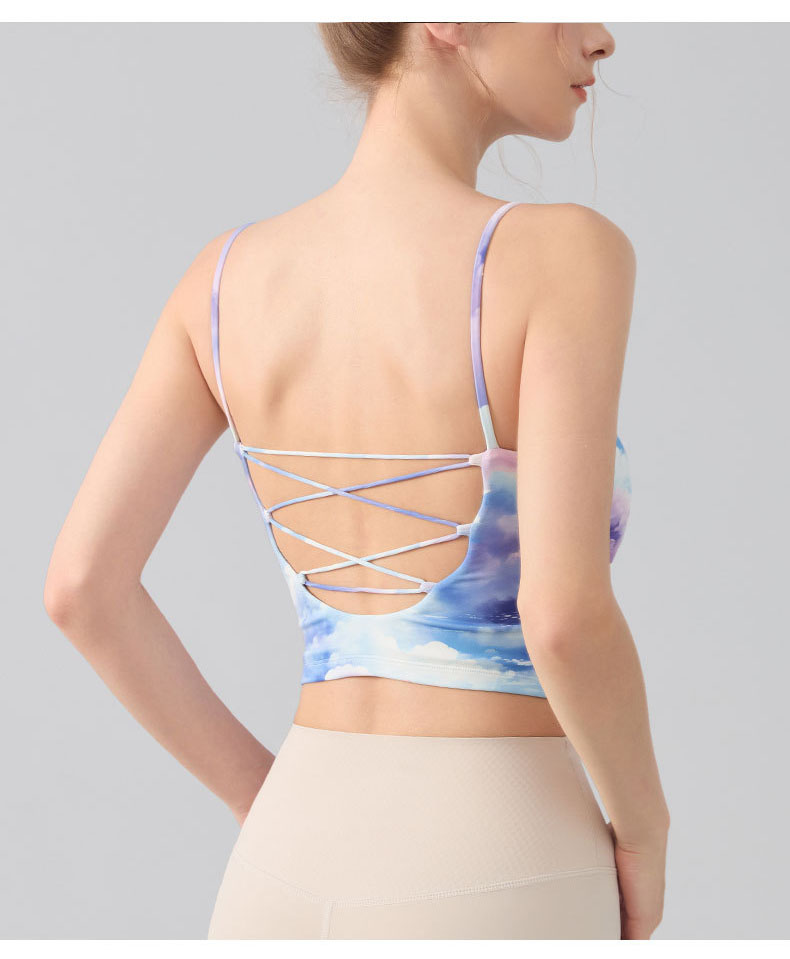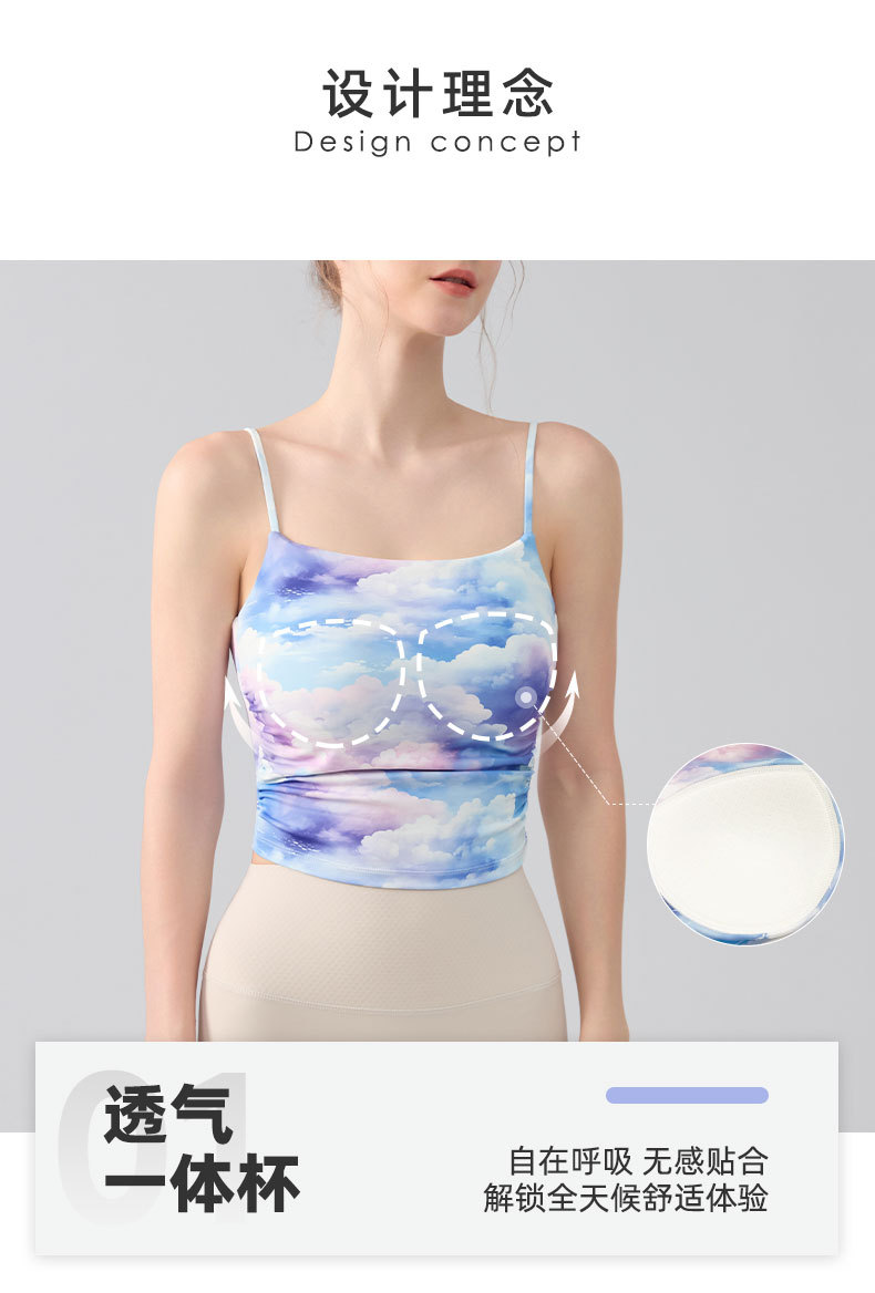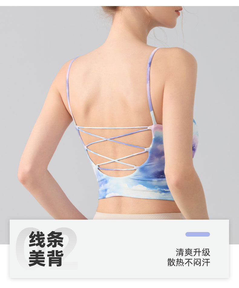跃牌【海听系列】夏季减震聚拢吊带一体式带胸垫细带交叉美背运动印花背心XC82