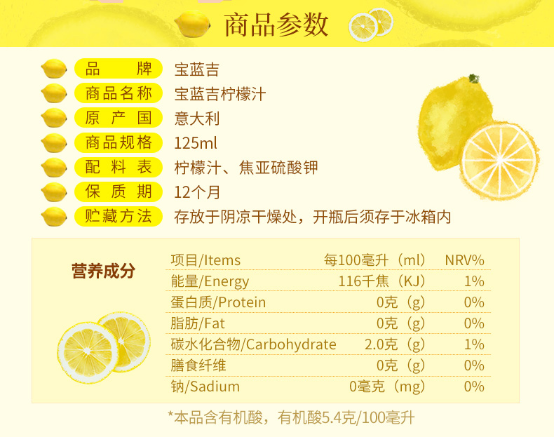 125ml宝蓝吉柠檬汁 进口浓缩原汁 多种用途