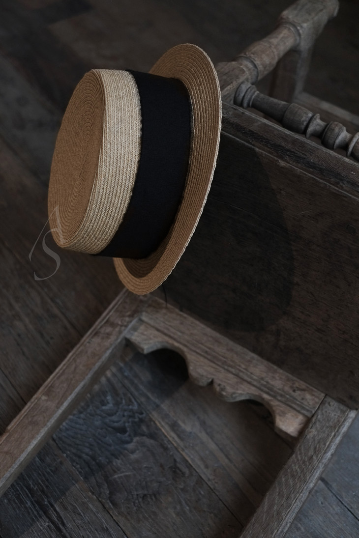 细腻而有韧性的平顶草帽,立体的编织肌理随麦色而自然起伏;搭配日本制羊毛装饰带,并保留了裁切时的毛边。内有抽绳可适当调节头围大小。