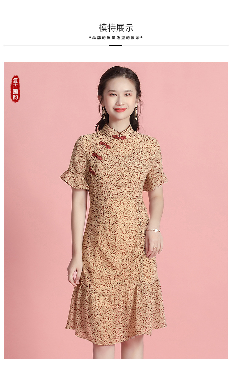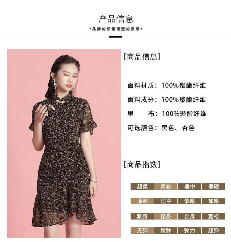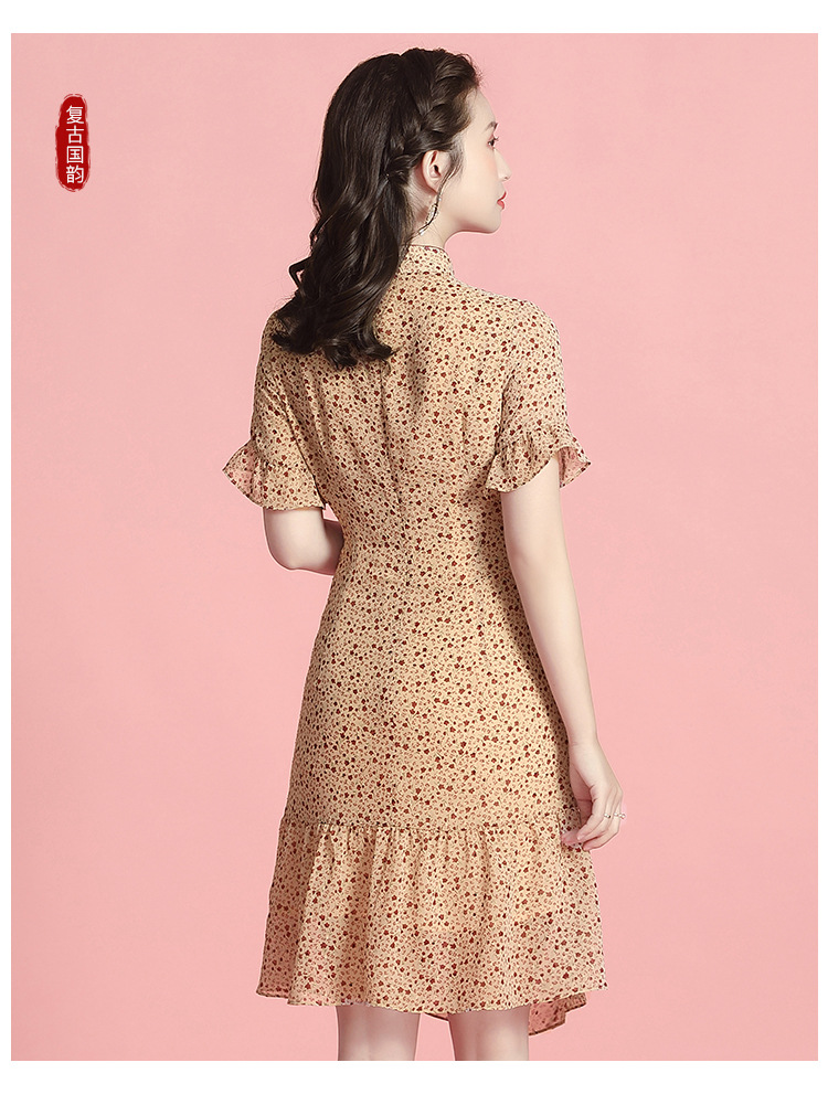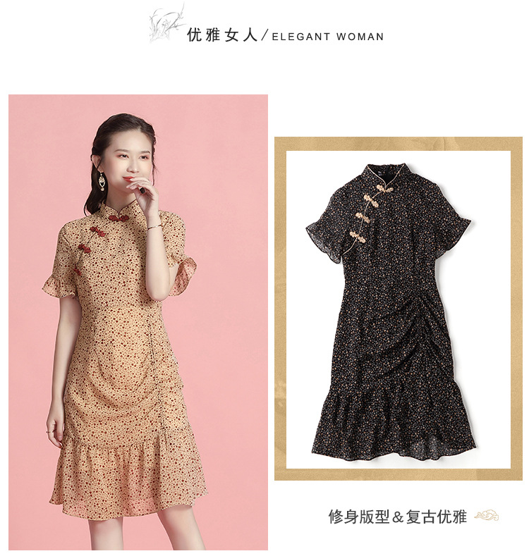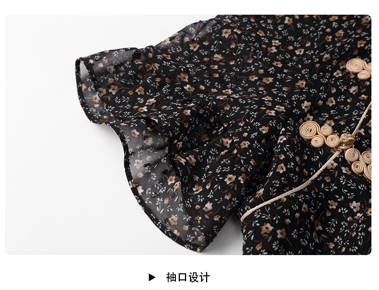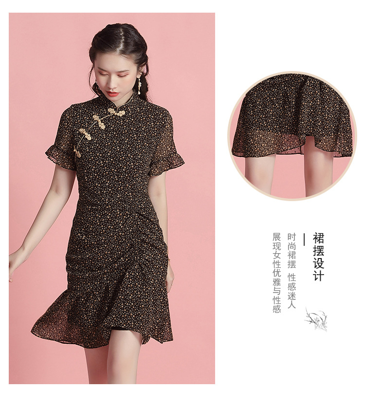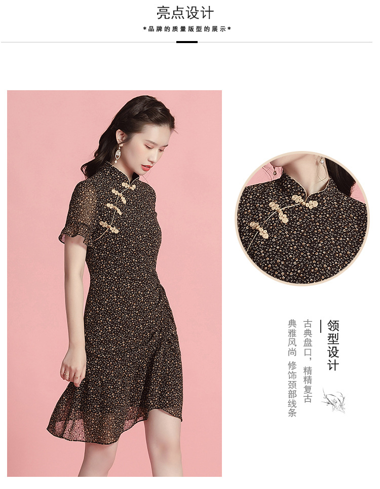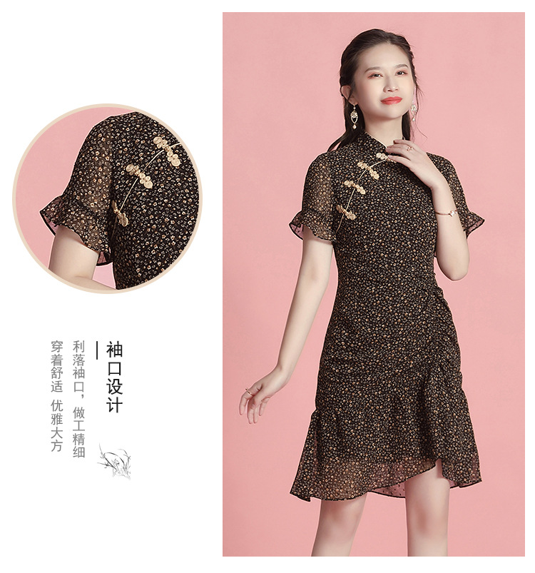 上海旗袍厂AYK-QF-210177雪纺小碎花改良旗袍立领时尚连衣裙不规则裙摆修身旗袍夏季女装