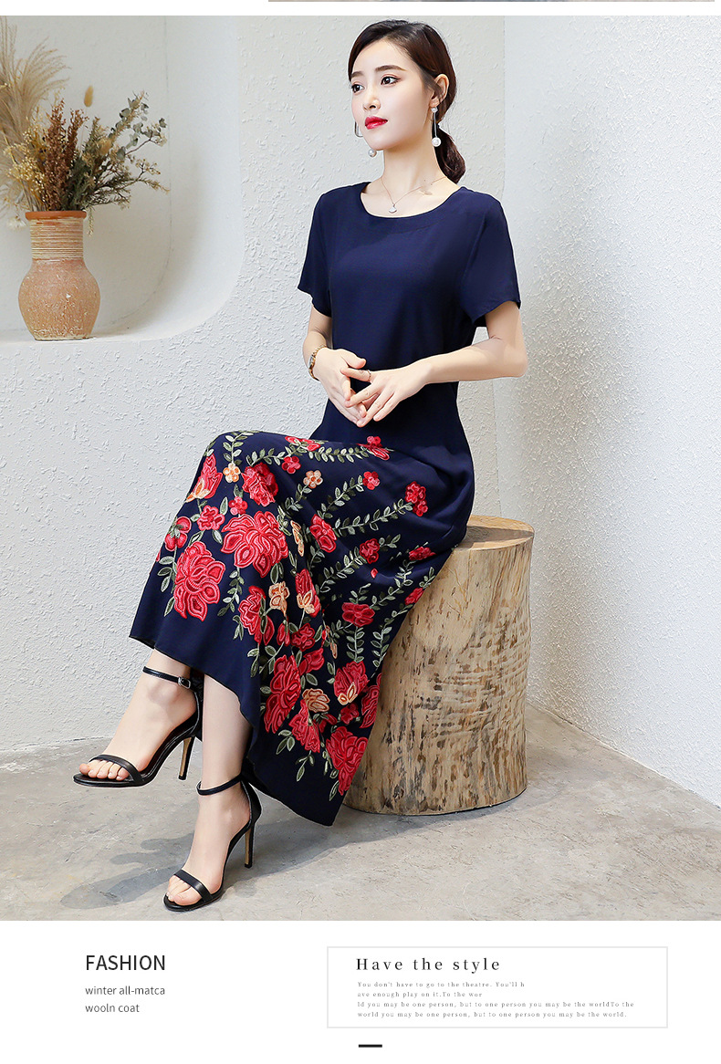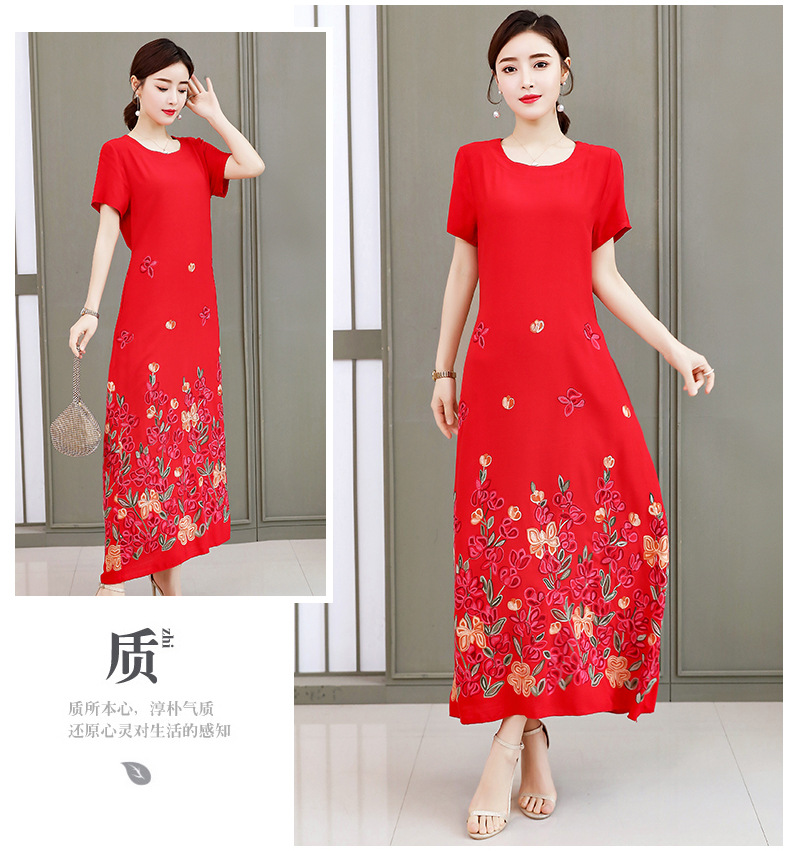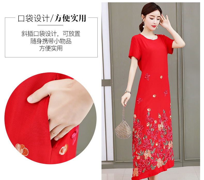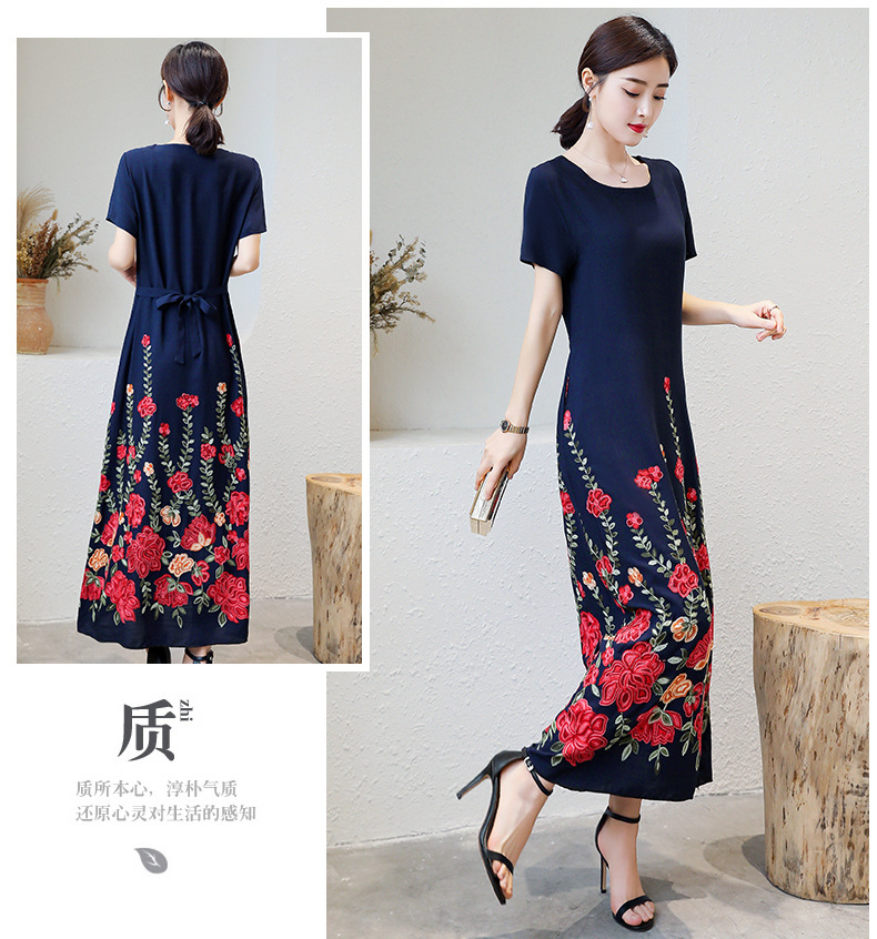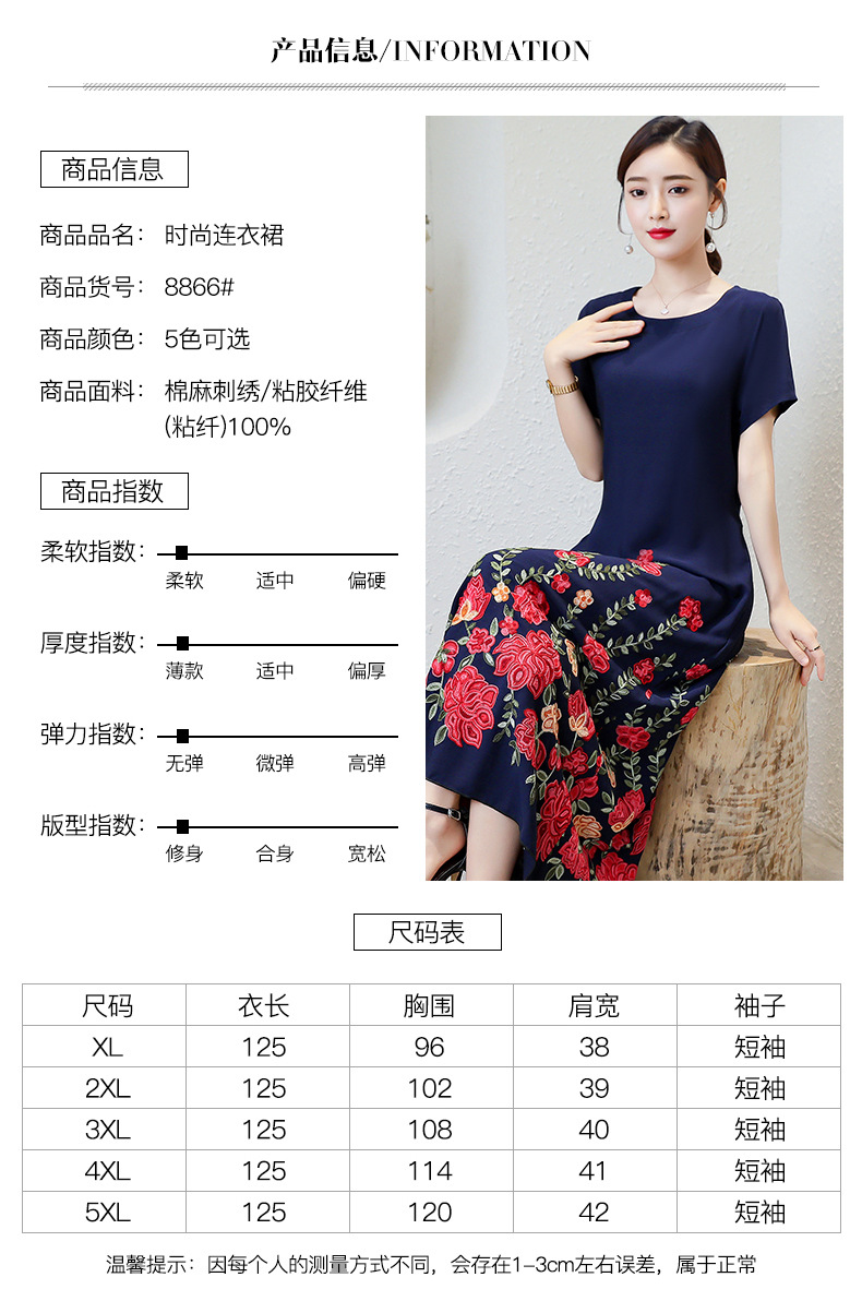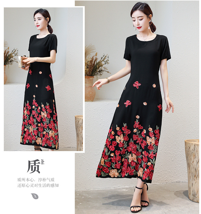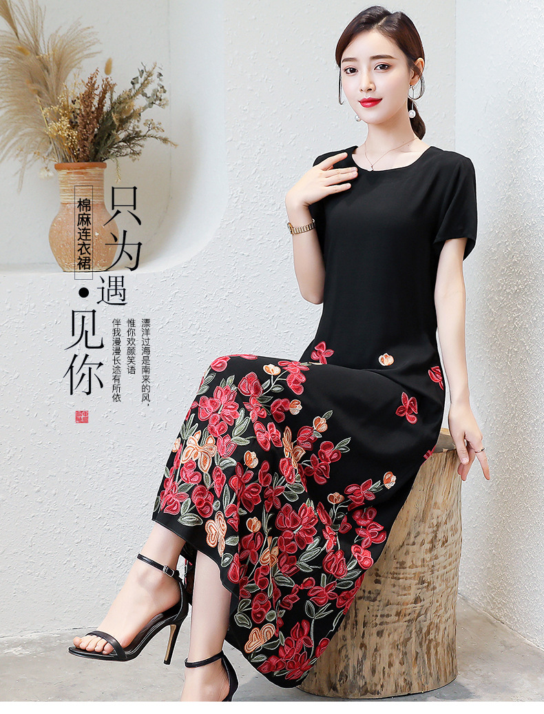 TZX-夏新款时尚显瘦棉麻刺绣阔太太连衣裙