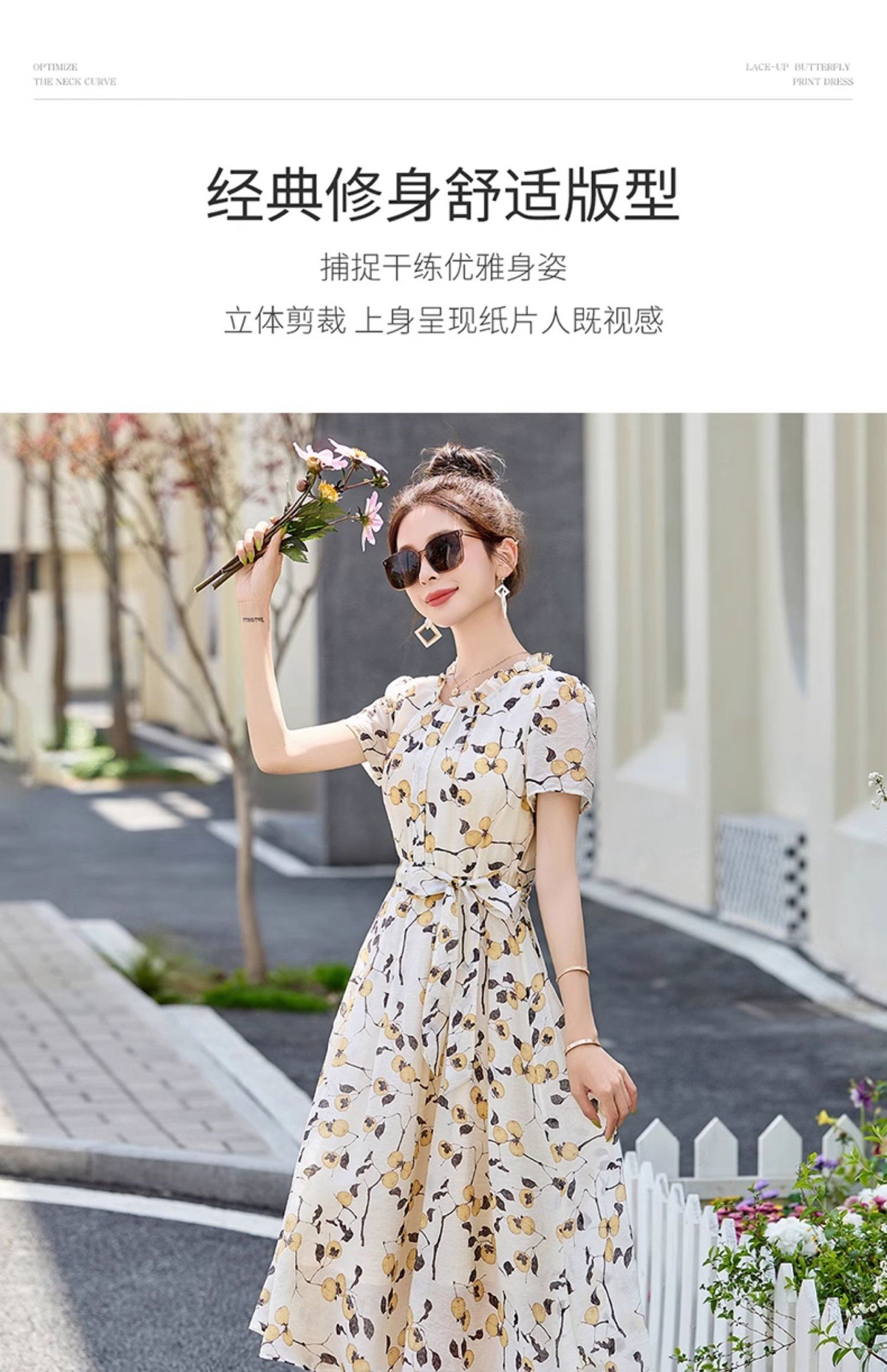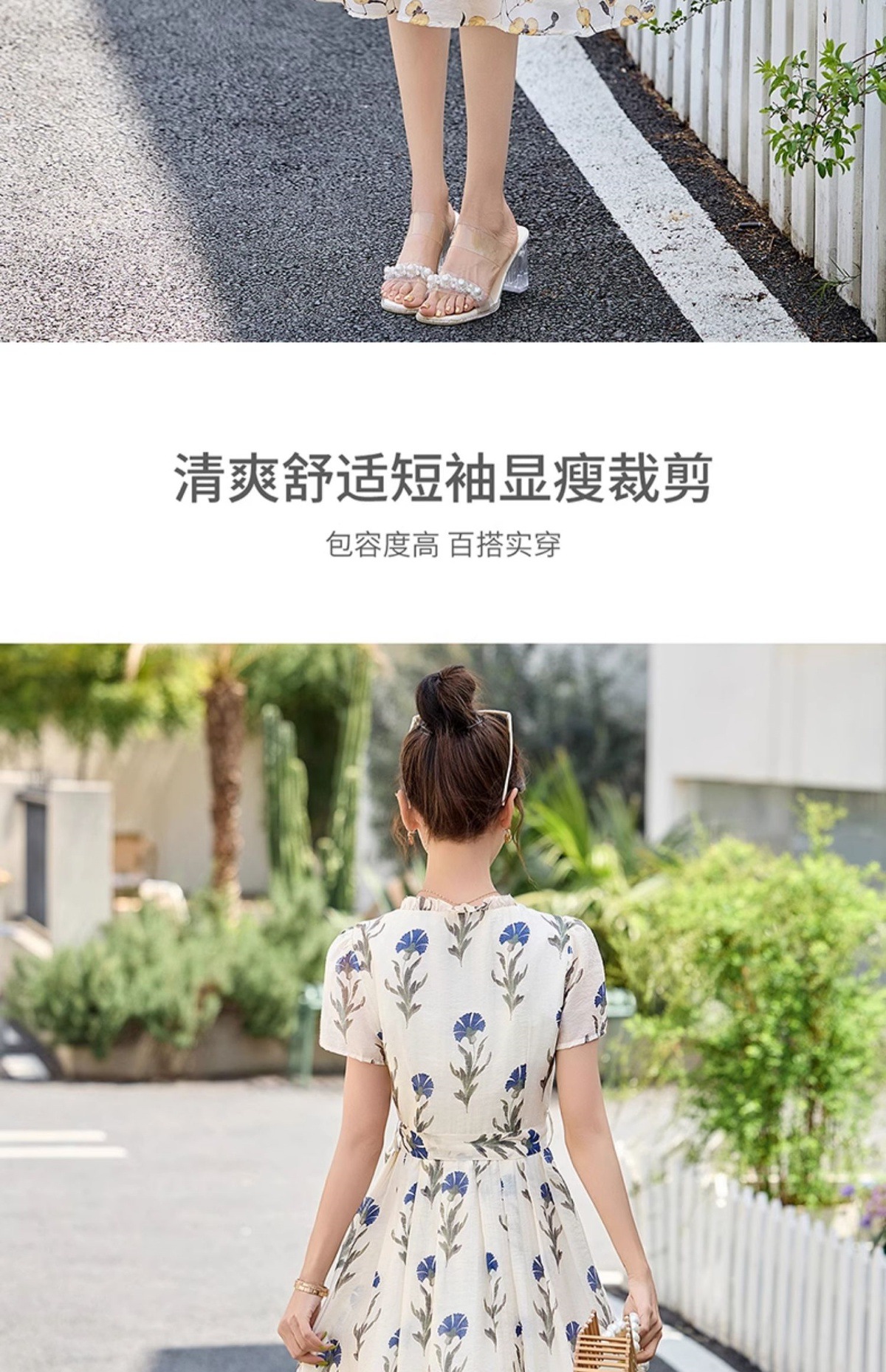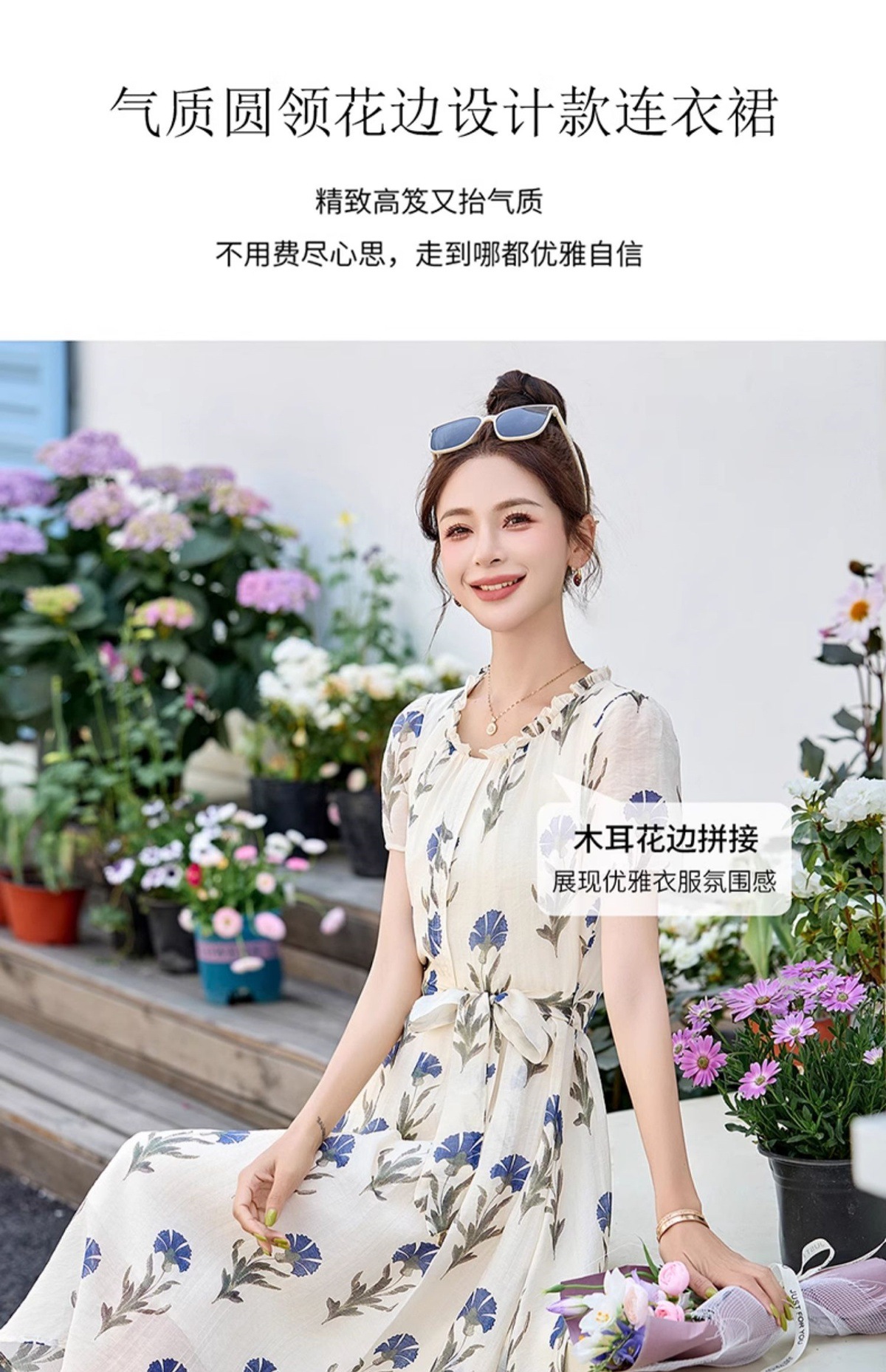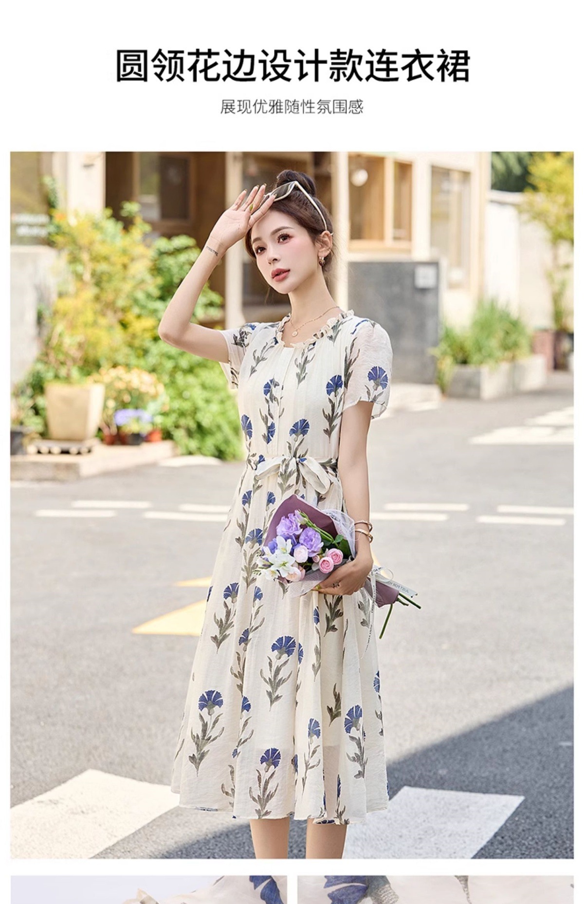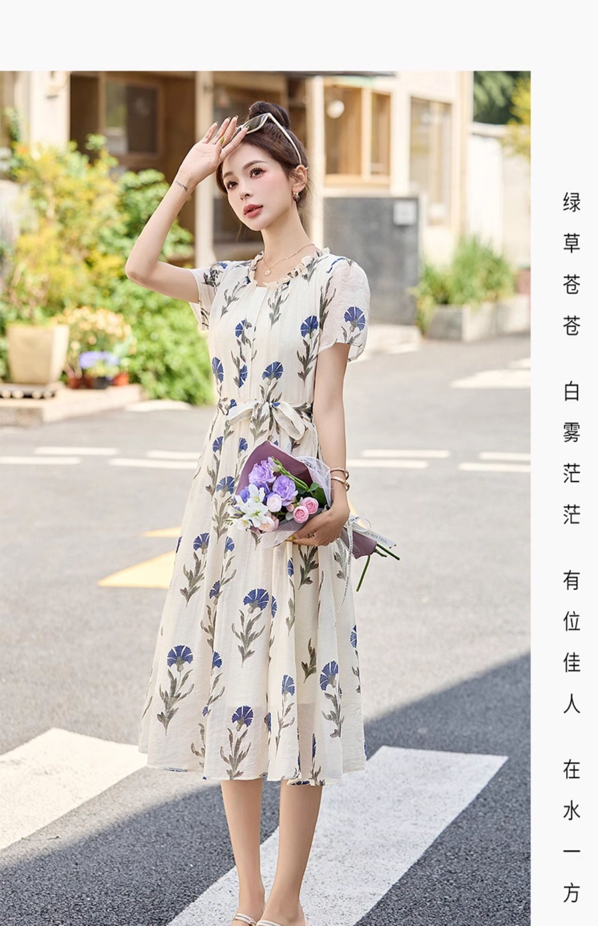 温柔风法式气质收腰短袖长裙,女神范印花显瘦连衣裙HR-6209