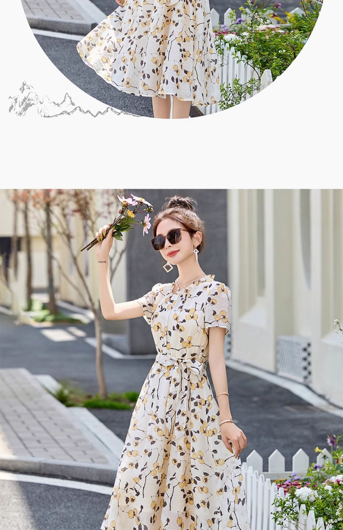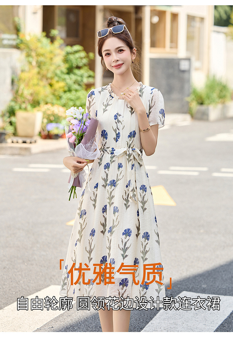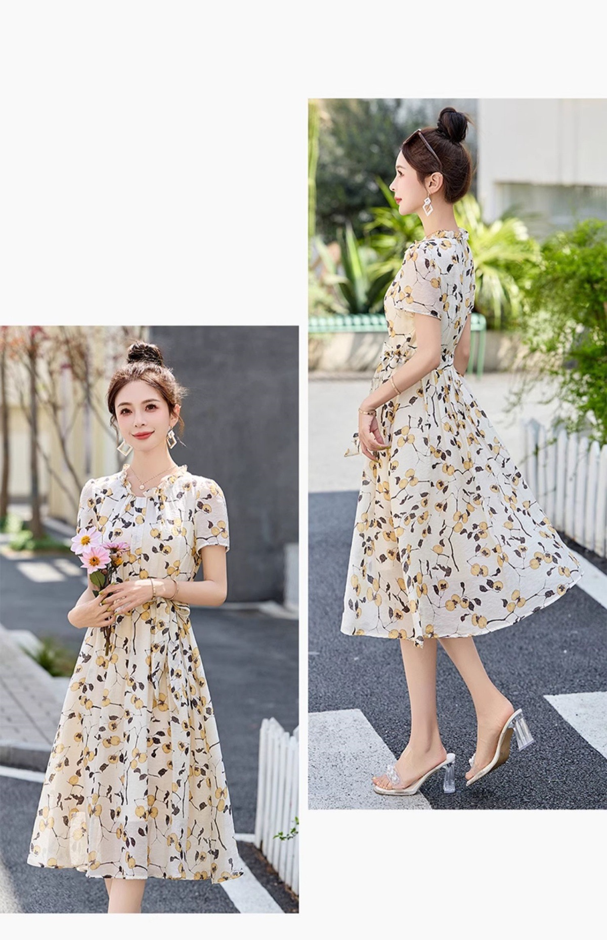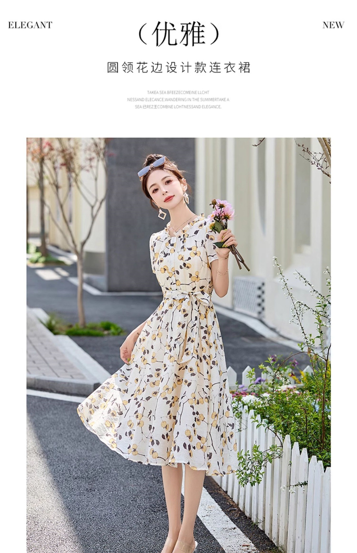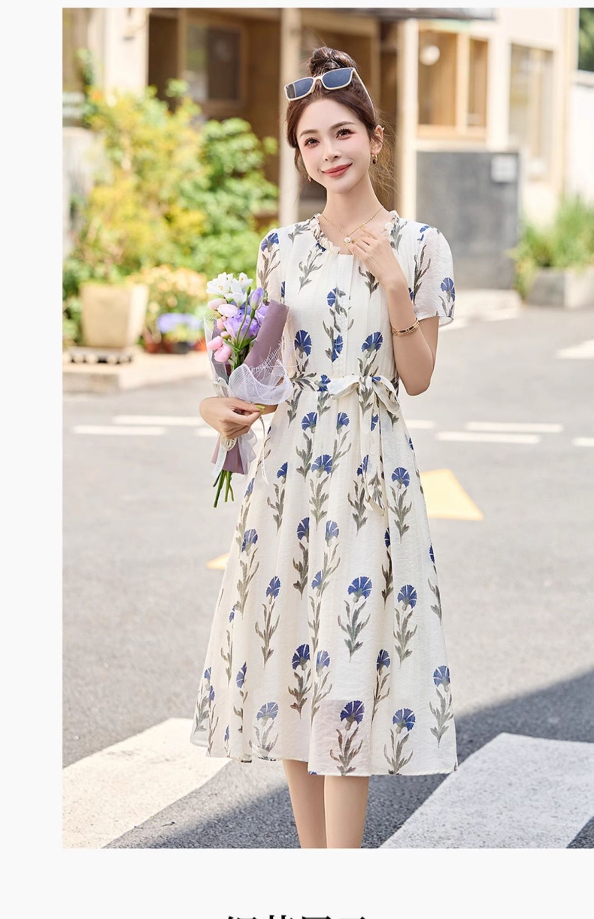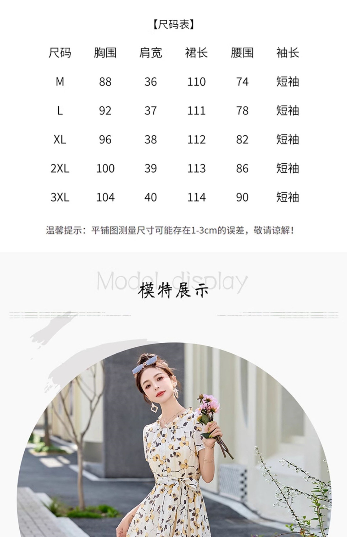 温柔风法式气质收腰短袖长裙,女神范印花显瘦连衣裙HR-6209