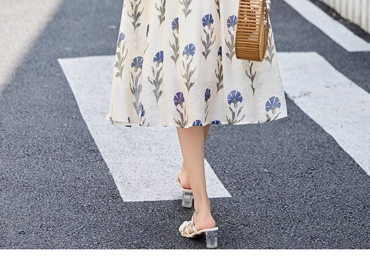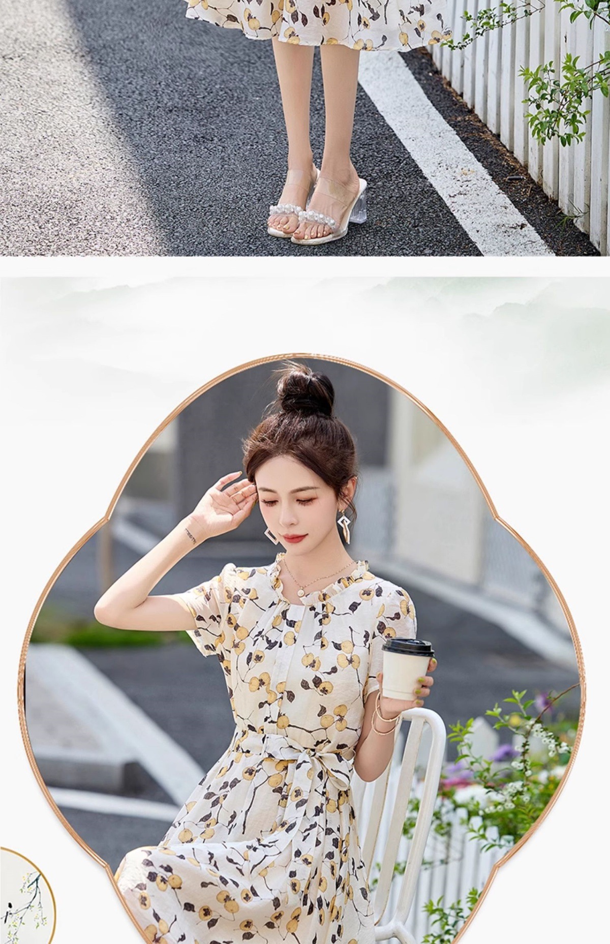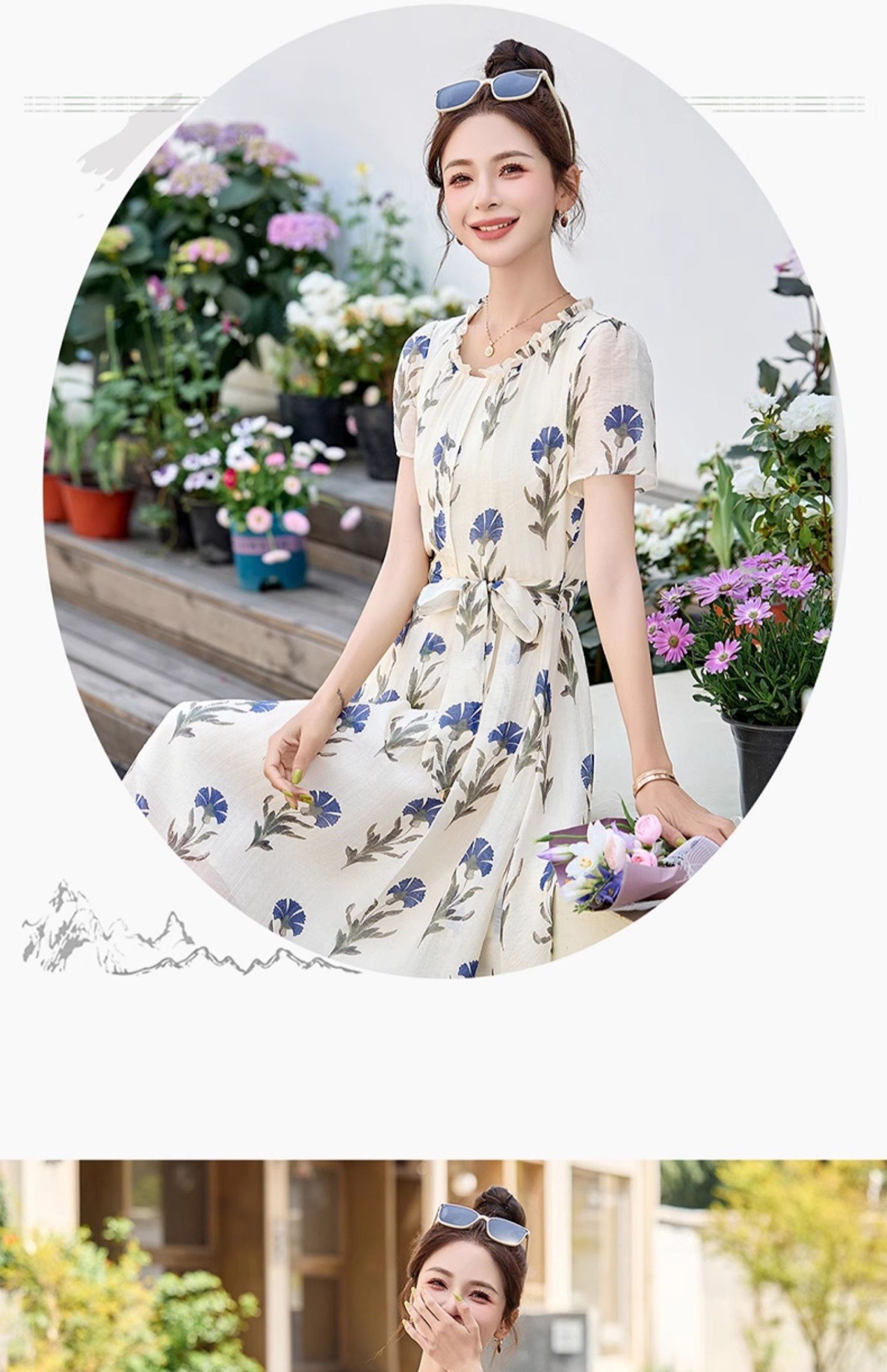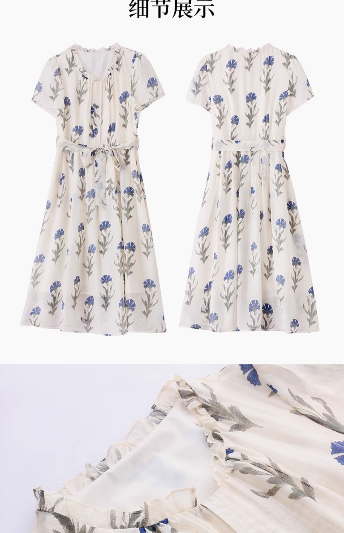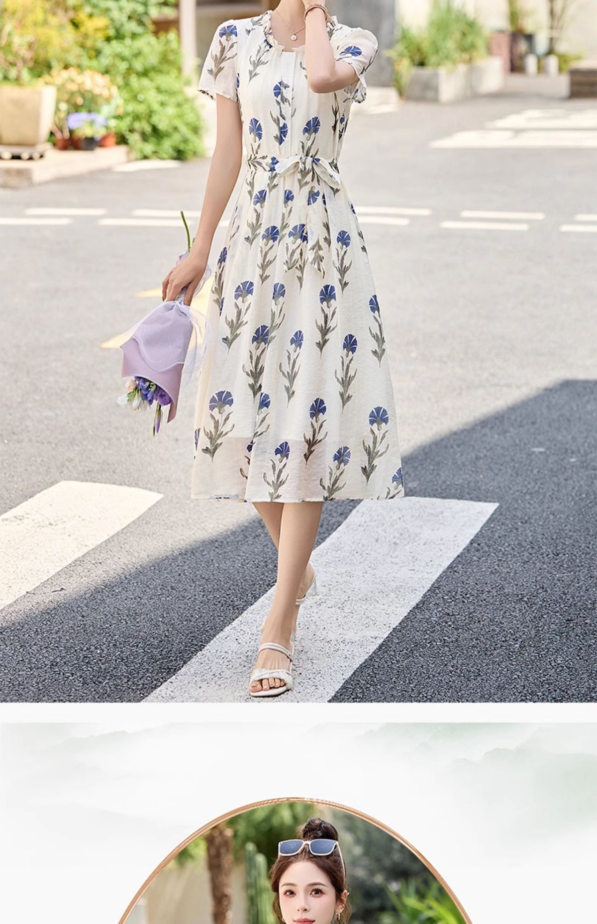 温柔风法式气质收腰短袖长裙,女神范印花显瘦连衣裙HR-6209