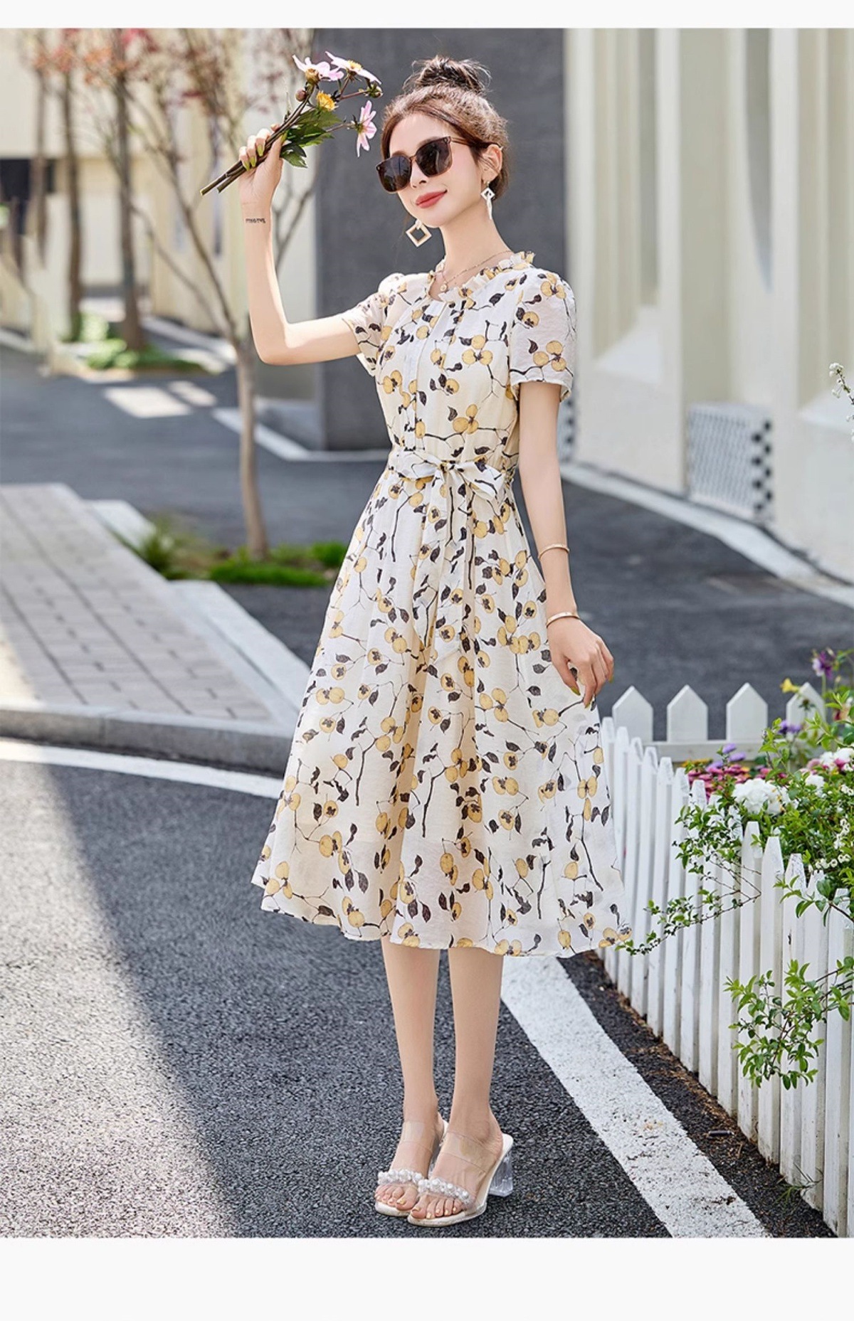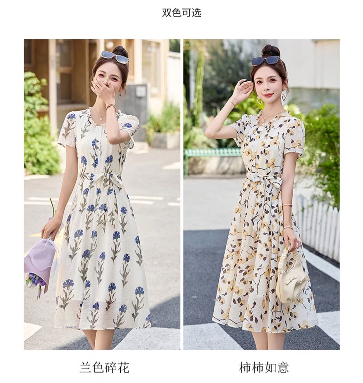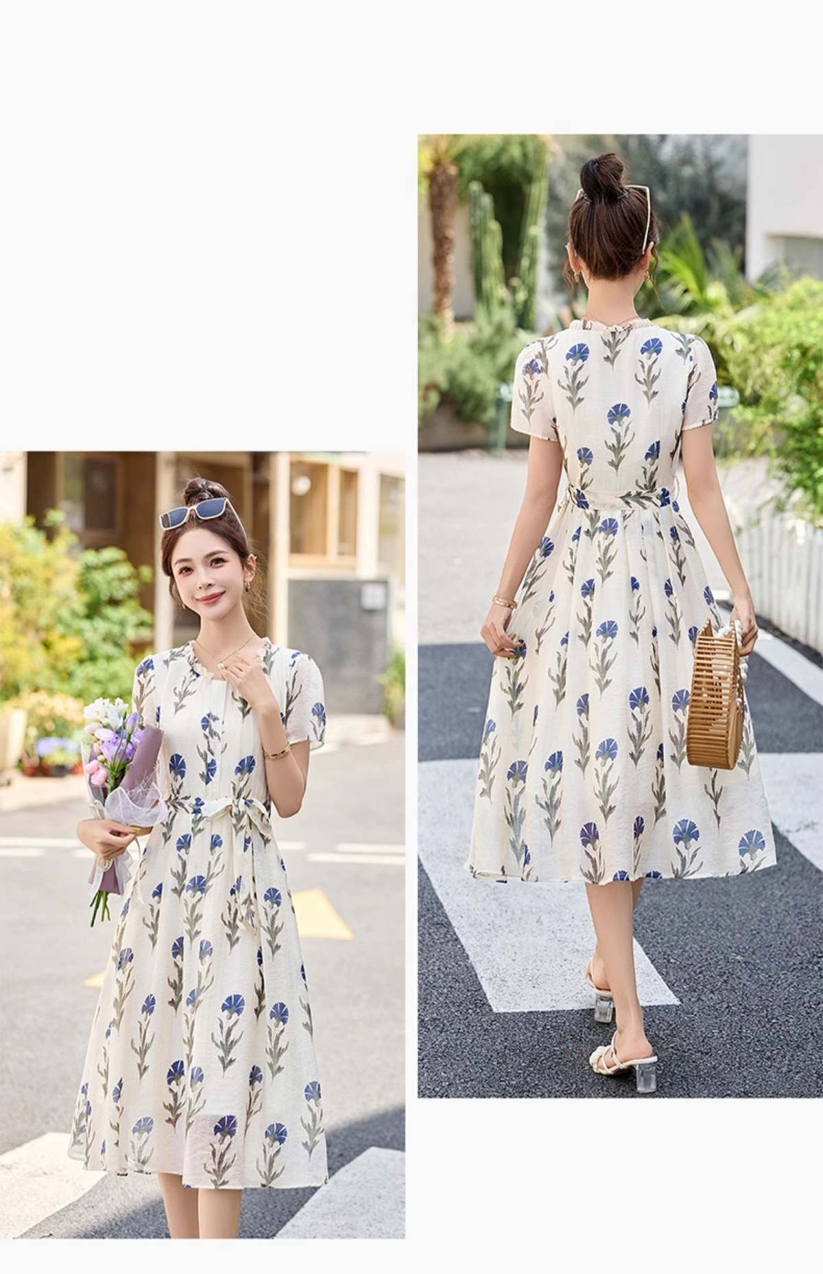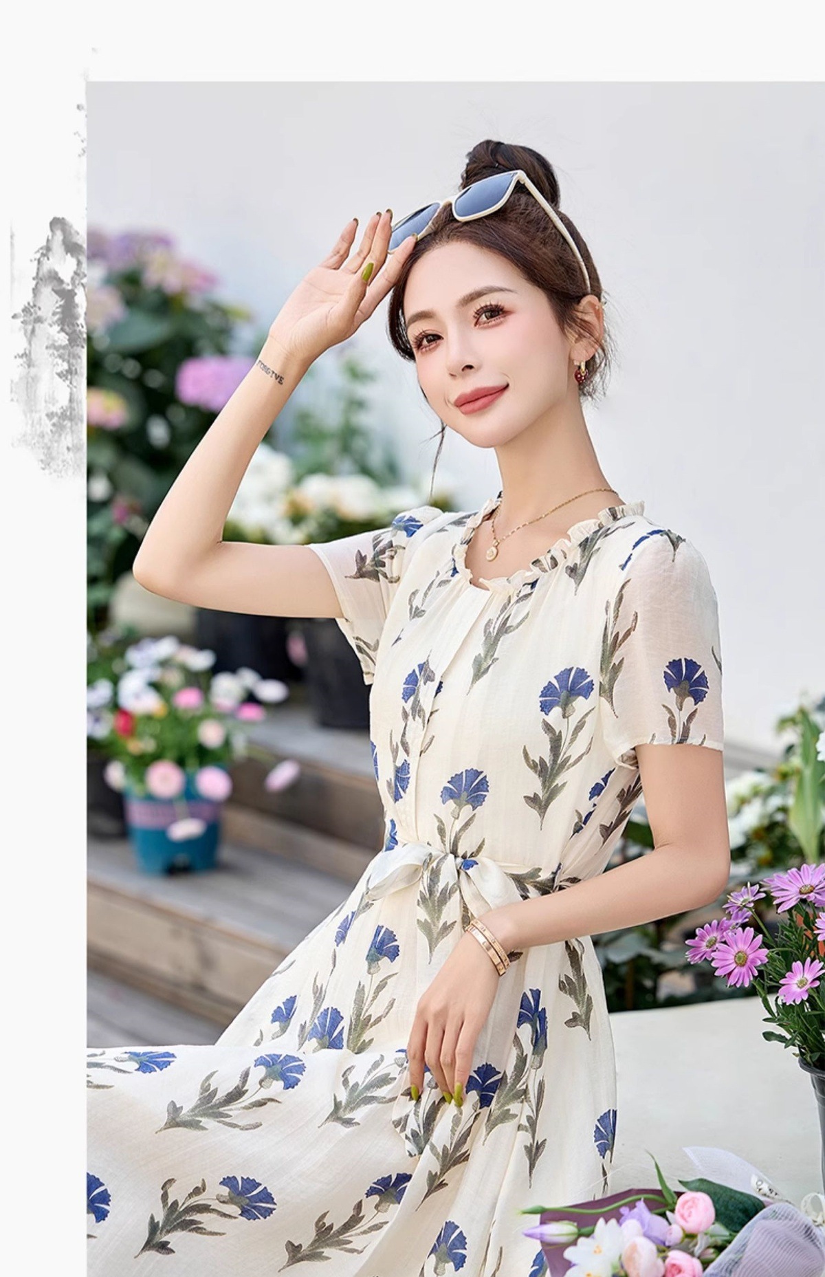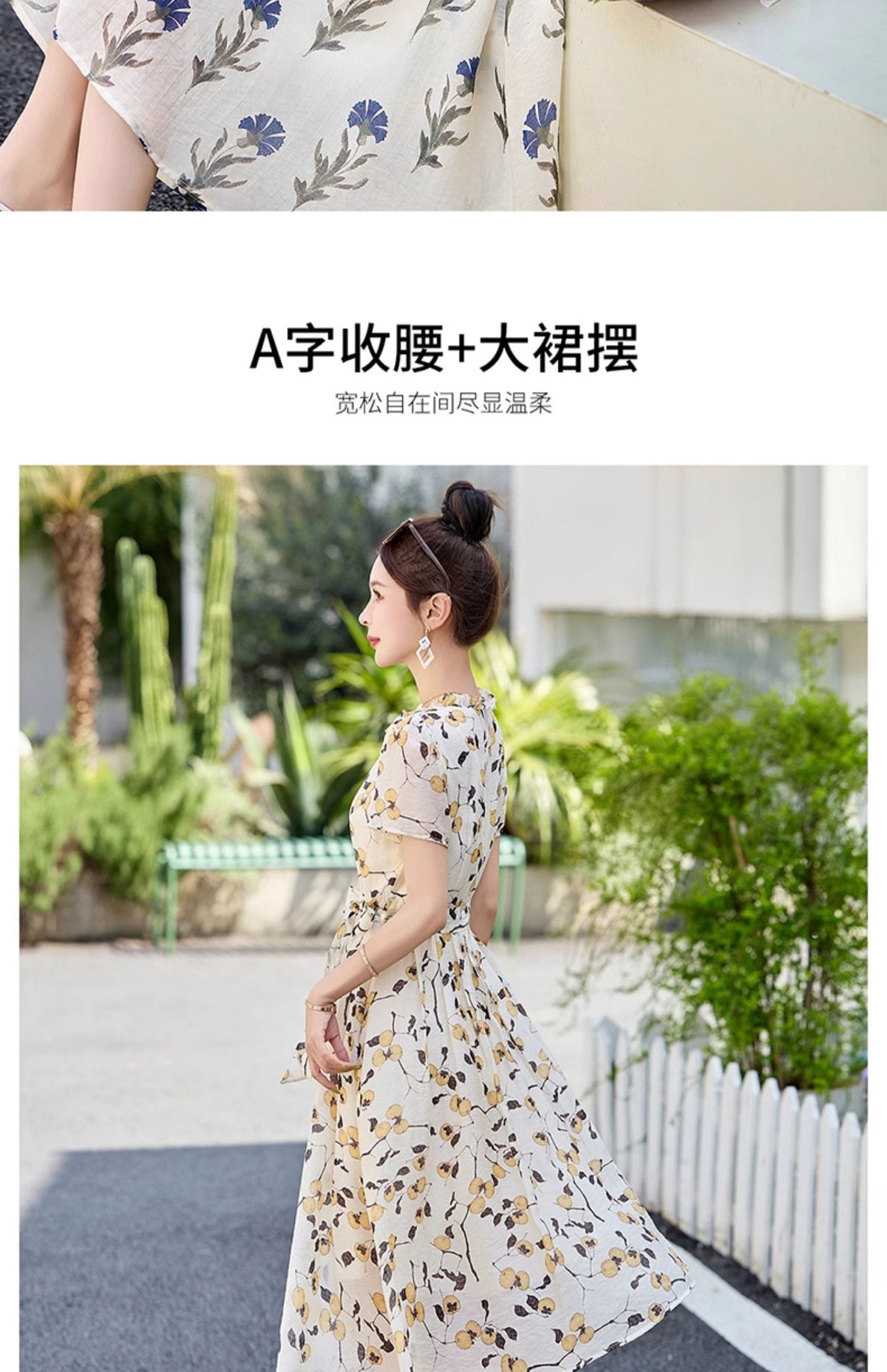 温柔风法式气质收腰短袖长裙,女神范印花显瘦连衣裙HR-6209