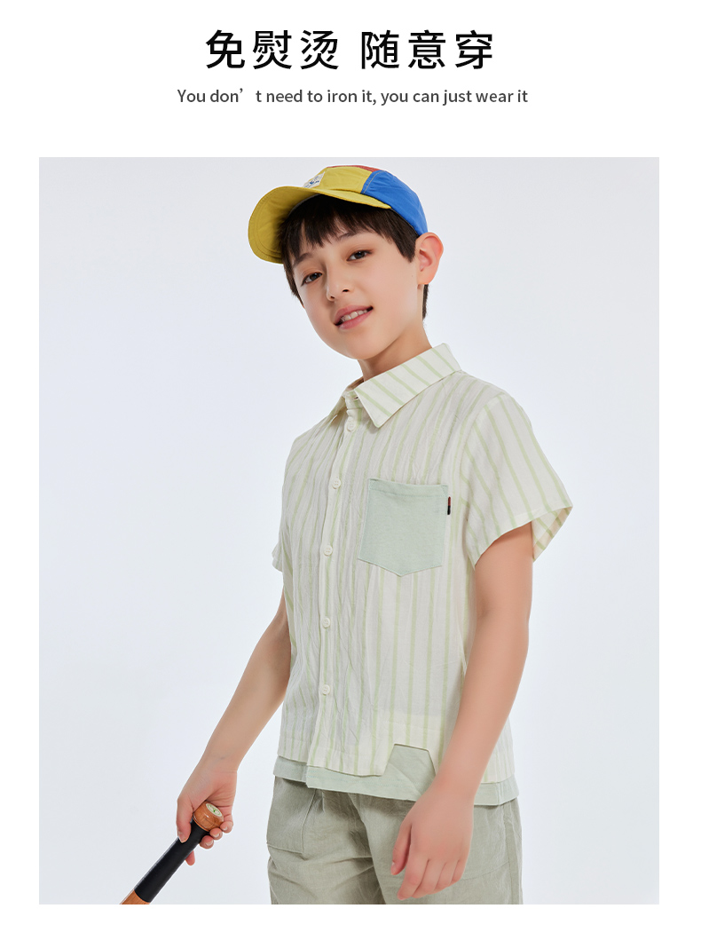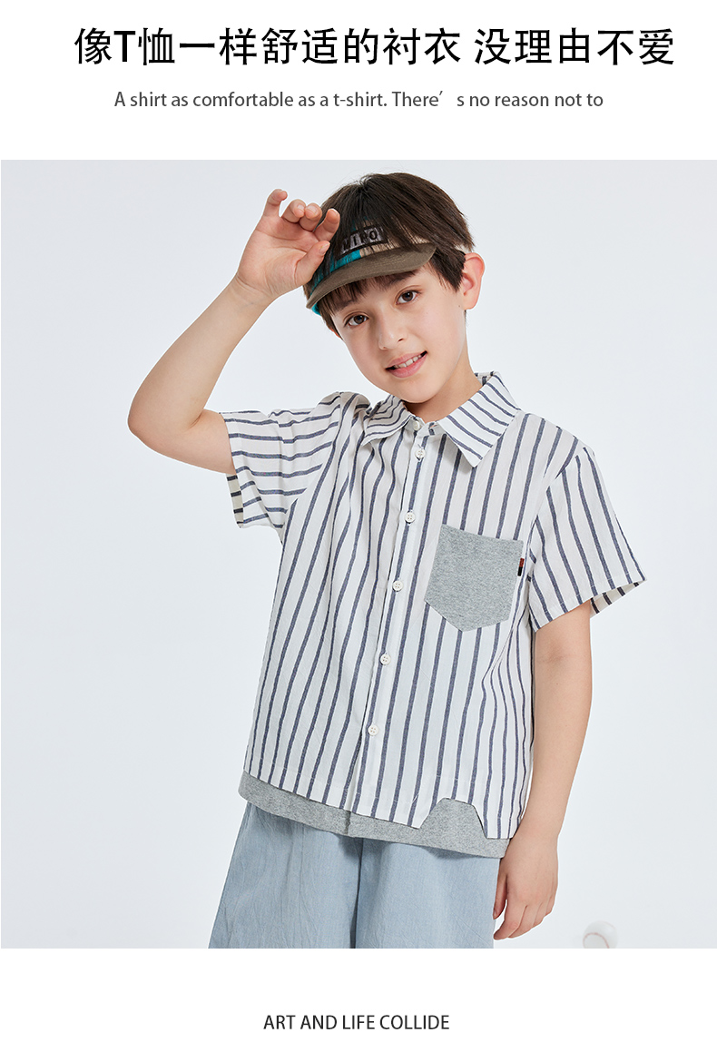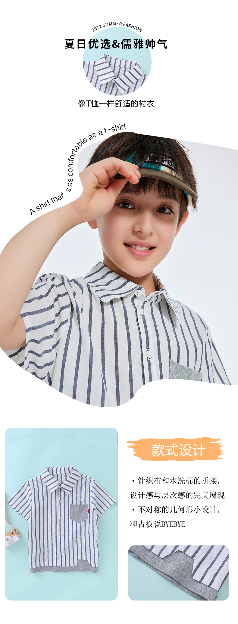 【抄底价清仓】龙之涵简约气质款短袖衬衣 三次高温水洗全棉 免熨烫 随意穿 休闲百搭 尺码100-170 男童条纹拼接短袖衬衣