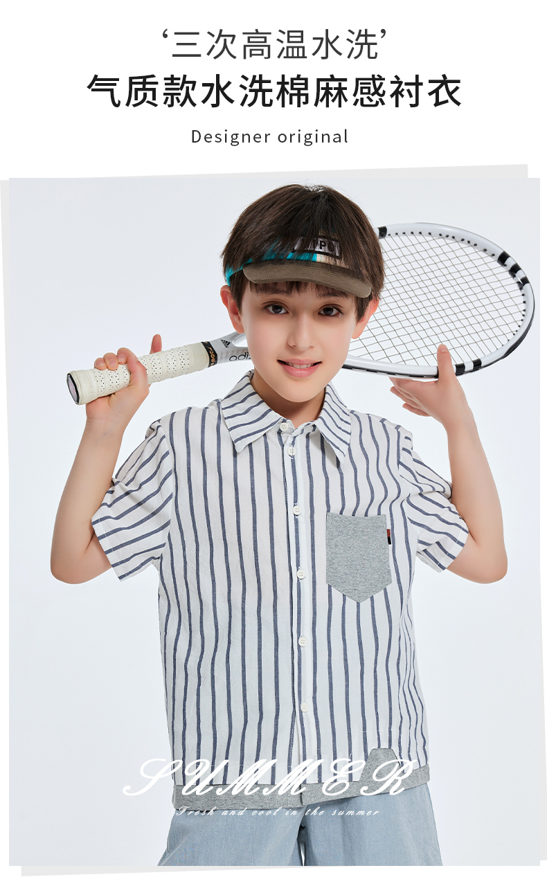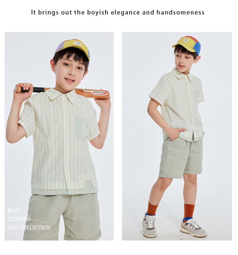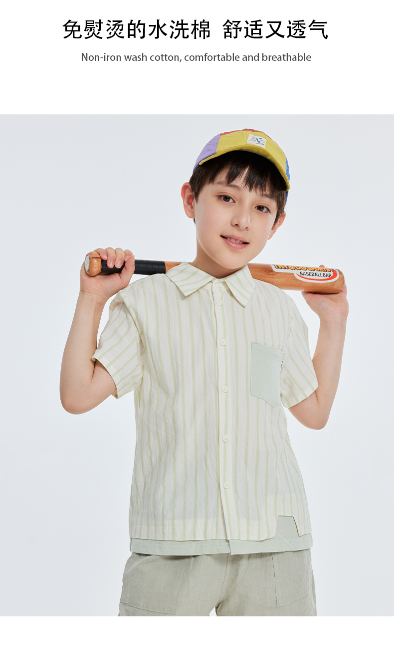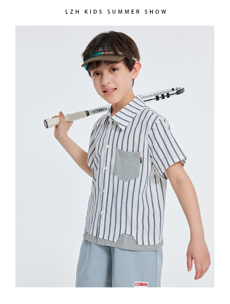 【抄底价清仓】龙之涵简约气质款短袖衬衣 三次高温水洗全棉 免熨烫 随意穿 休闲百搭 尺码100-170 男童条纹拼接短袖衬衣