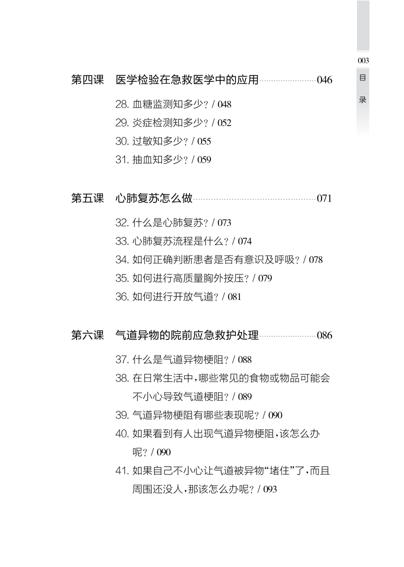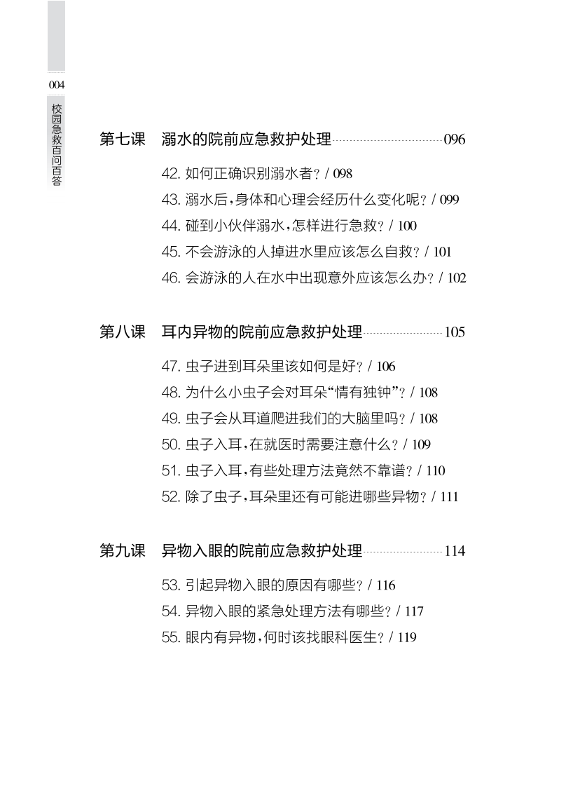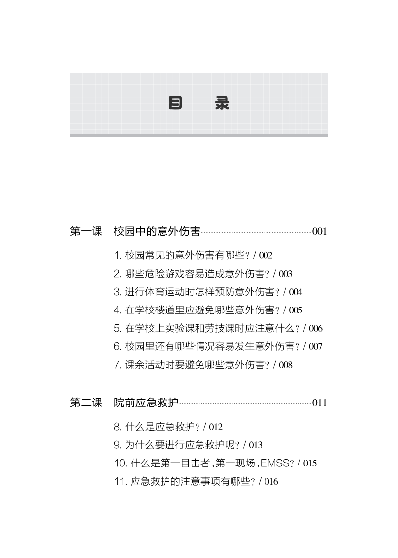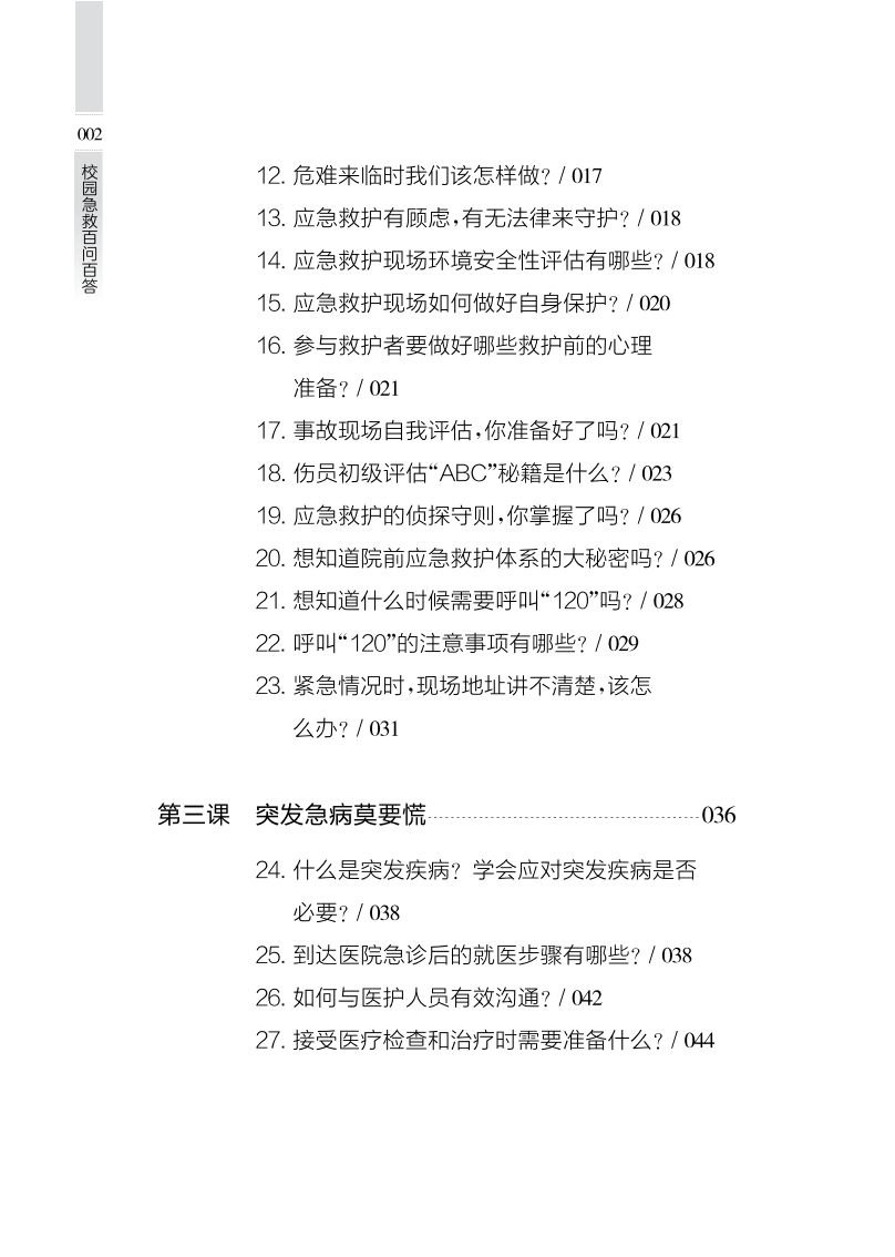 全球每年大约有630000名青少年死于烧伤、跌伤、中毒等意外伤害事故。在校园中发现意外伤害时,懂得必要急救知识,运用正确的方法,可以有效的帮助患者减轻痛苦,避免“二次伤害”事件发生,第一时间有效的救治也是提高抢救成功率的关键,提高急救能力是当前在校学生健康教育的重要内容。本书主要内容包括院前急救、现场安全评估和呼救、心肺复苏术、气道异物梗阻的预防和处理等,本书适合大、中、小学生使用,聚焦校园急救。