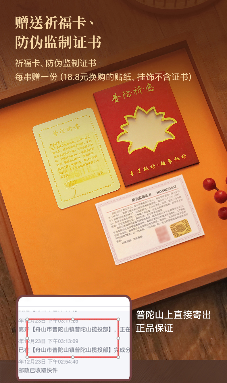 下单手串/吊坠/项链即赠「祈福卡(现场人工加盖印章,盖章图案不是印刷!),防伪监制证书」。每串限赠一份证书,18.8元换购的贴纸、小挂饰不含证书。